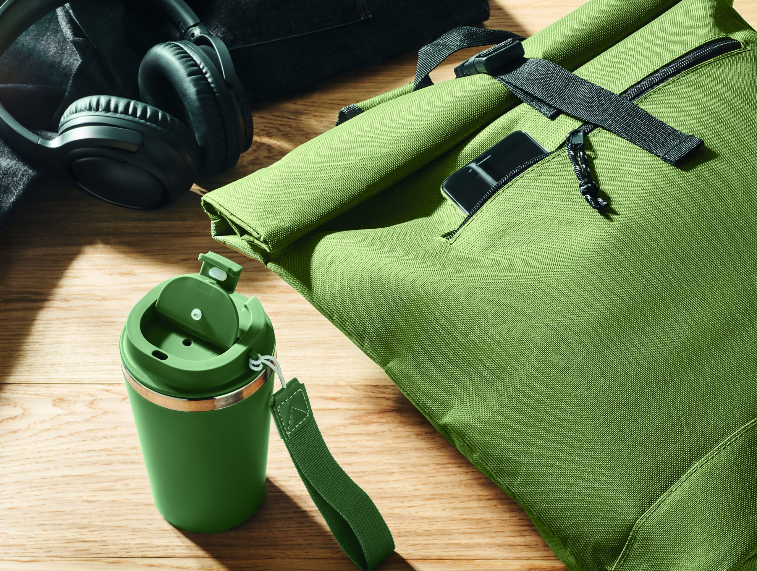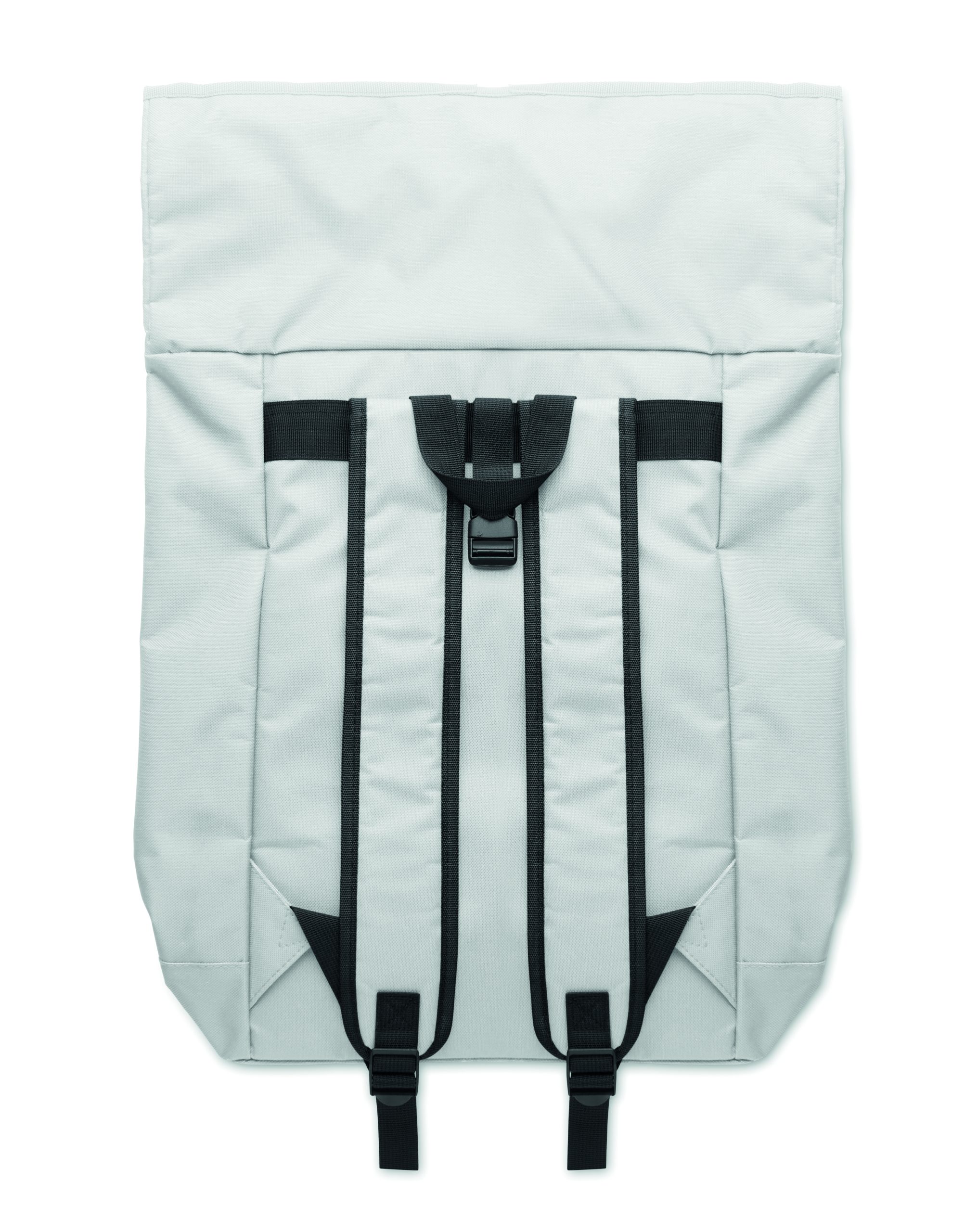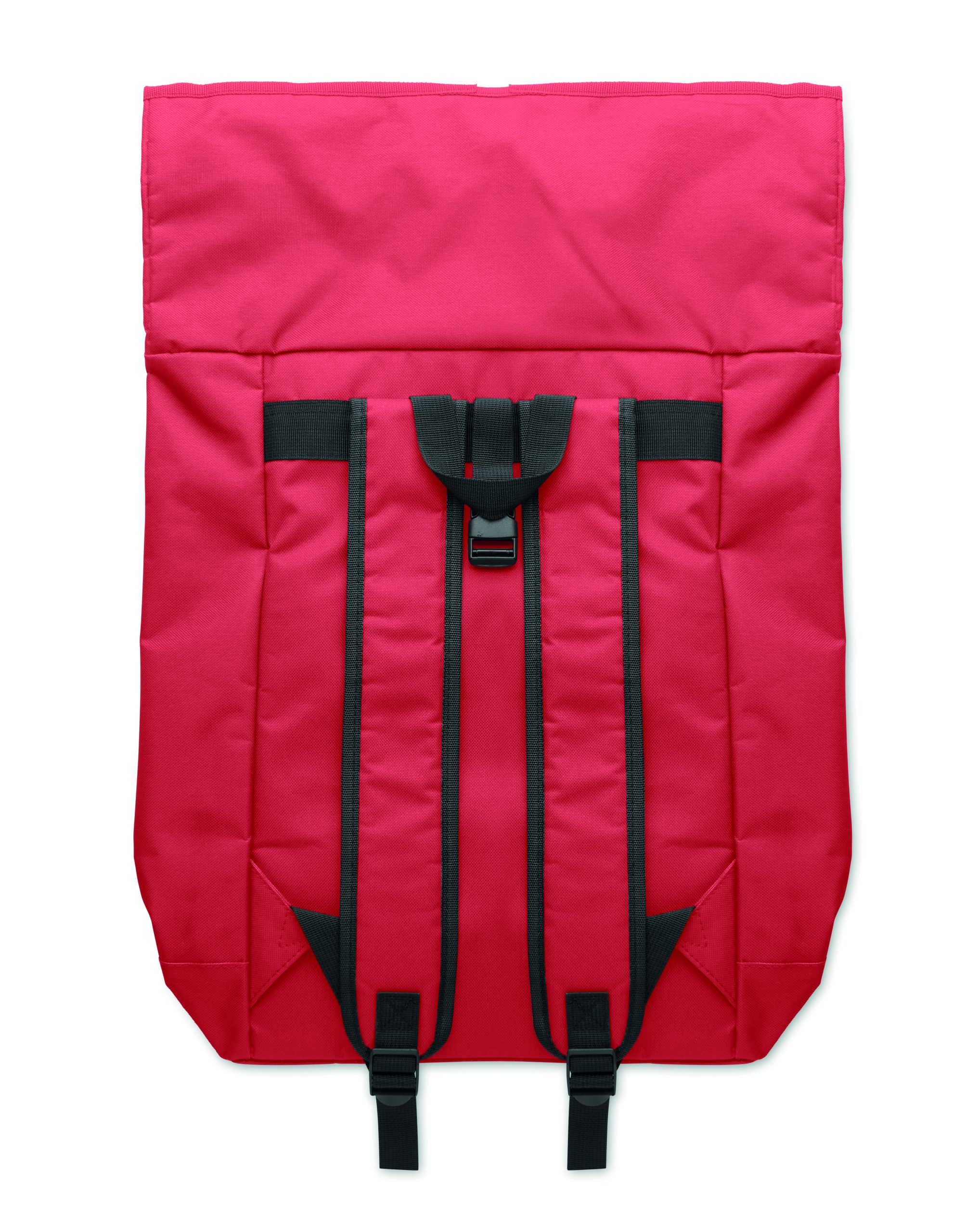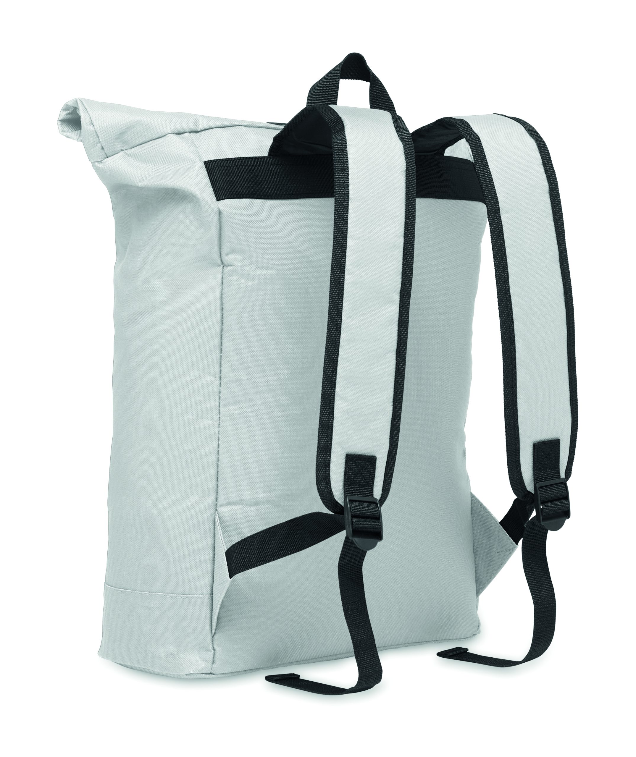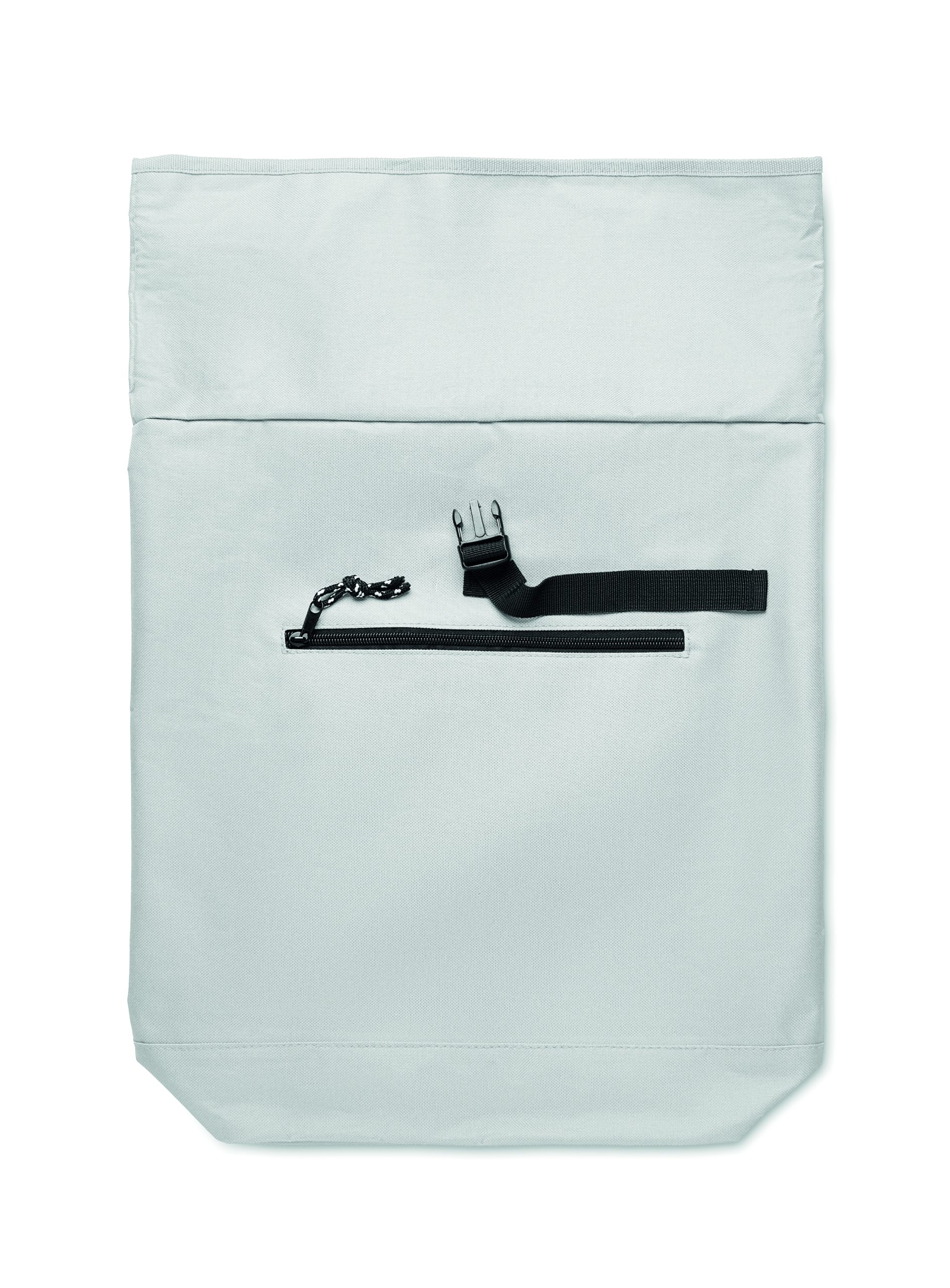 15-calowy zwijany plecak na laptopa typu rolltop z poliestru 600D z wyściełanym tyłem i wzmocnionym spodem. Przednia kieszeń zapinana na zamek. Podszewka 210D.