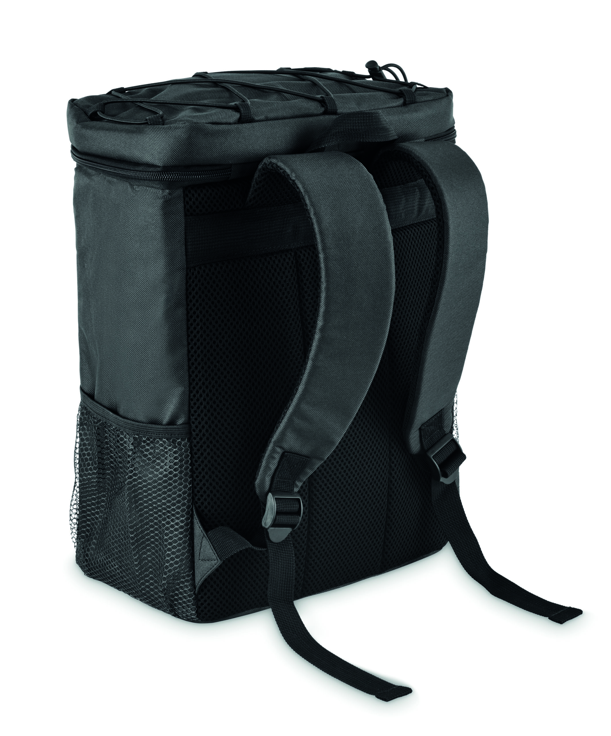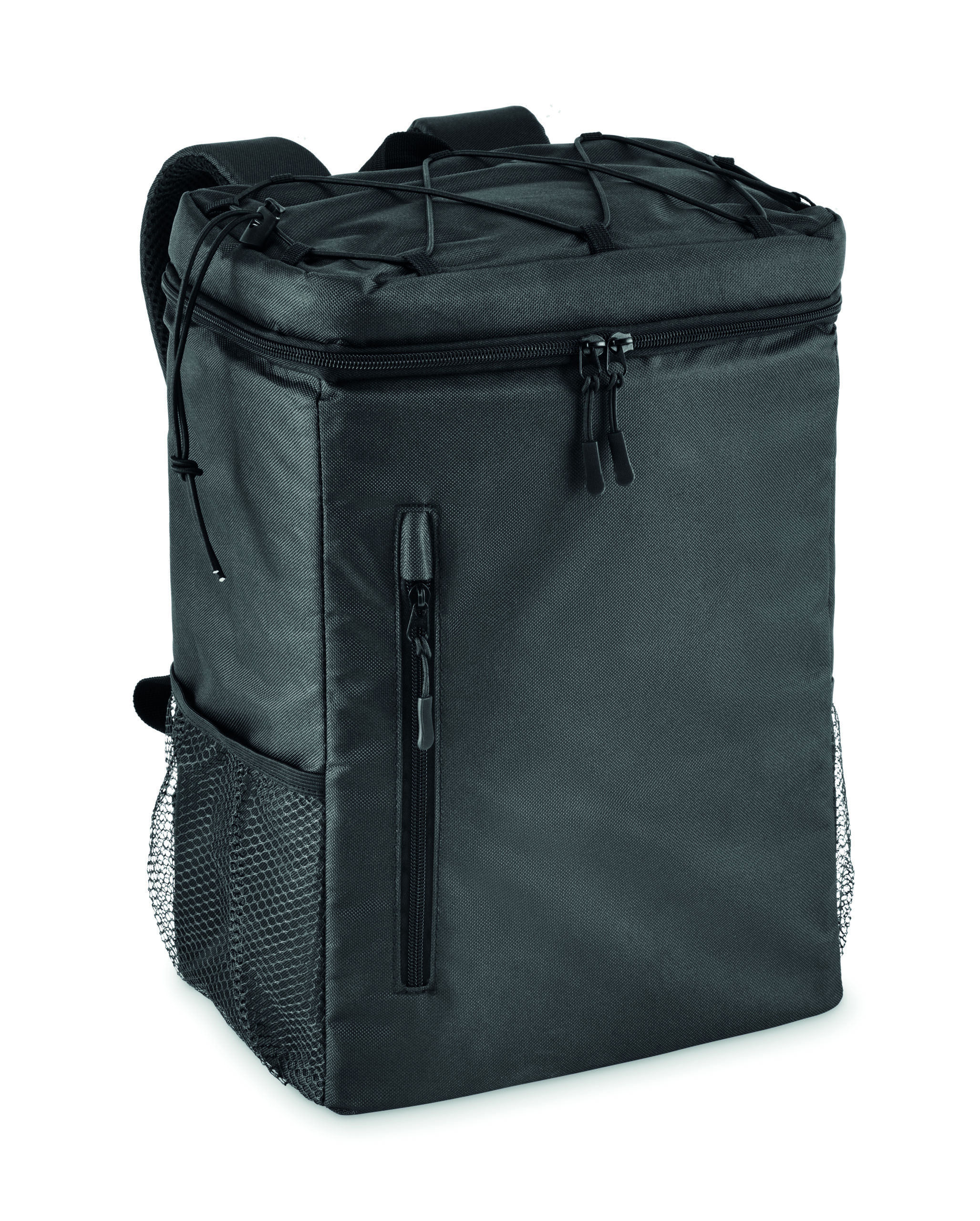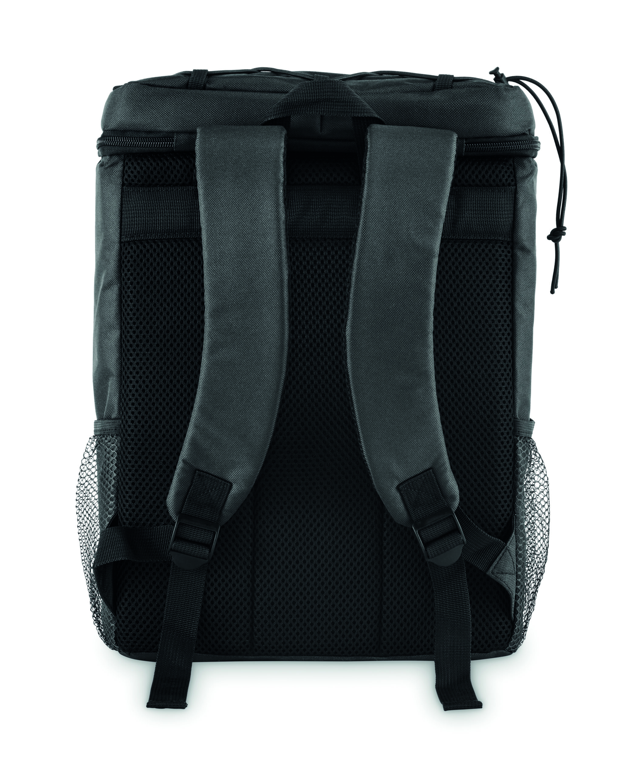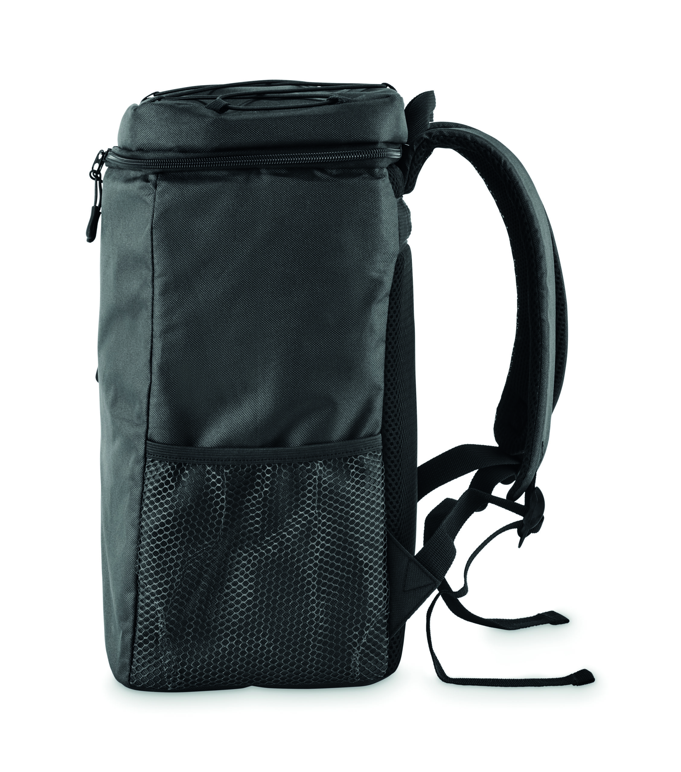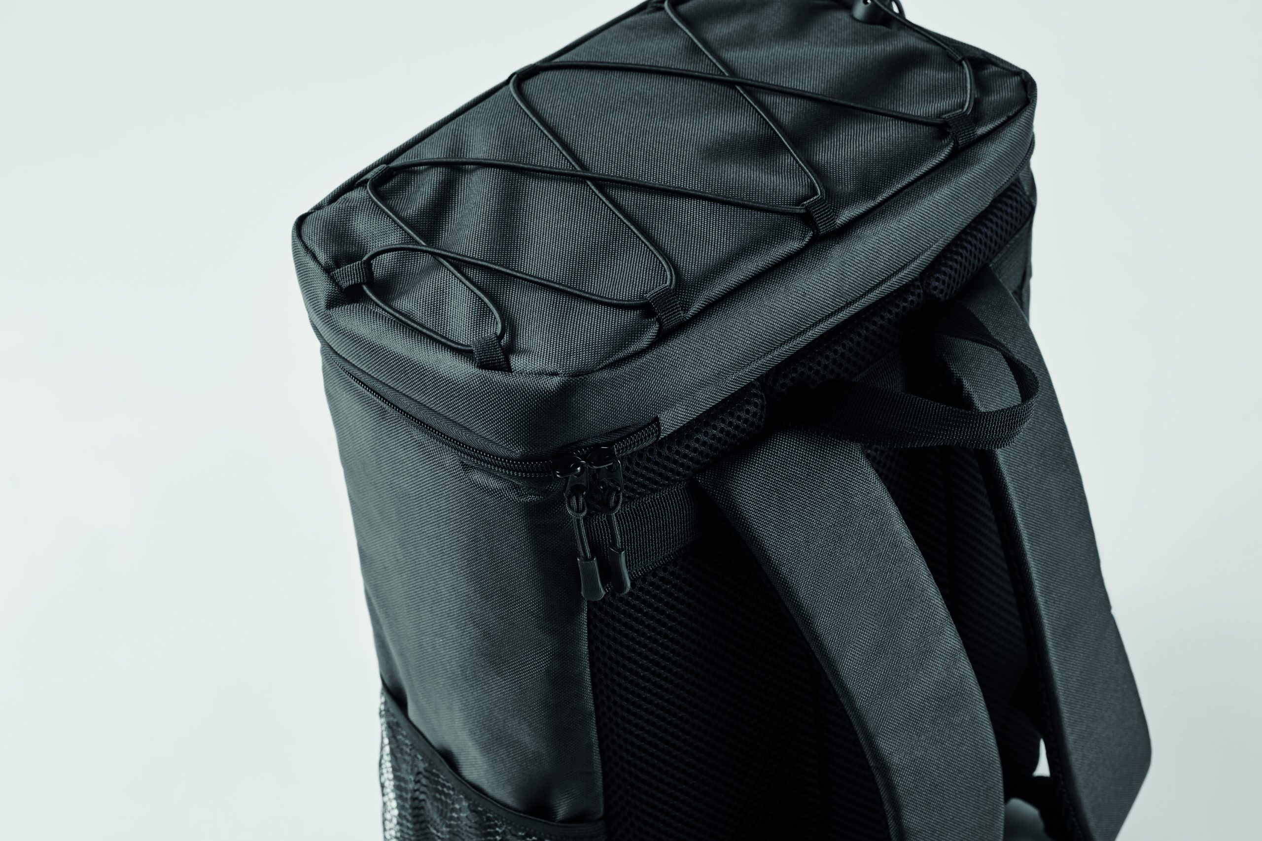 Plecak chłodzący z poliestru 600D RPET z wyściełanymi regulowanymi paskami na ramiona, podszewką PEVA i pianką PE o grubości 5 mm. Ma przednią kieszeń i dwie boczne kieszenie z siatki. Pojemność: 9 l.