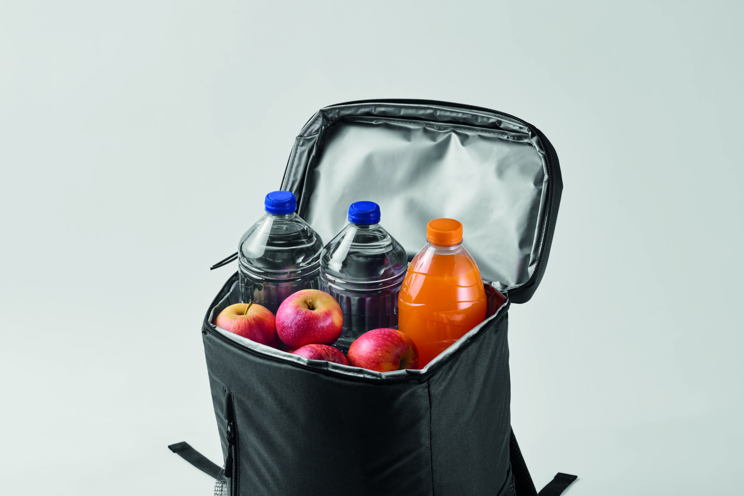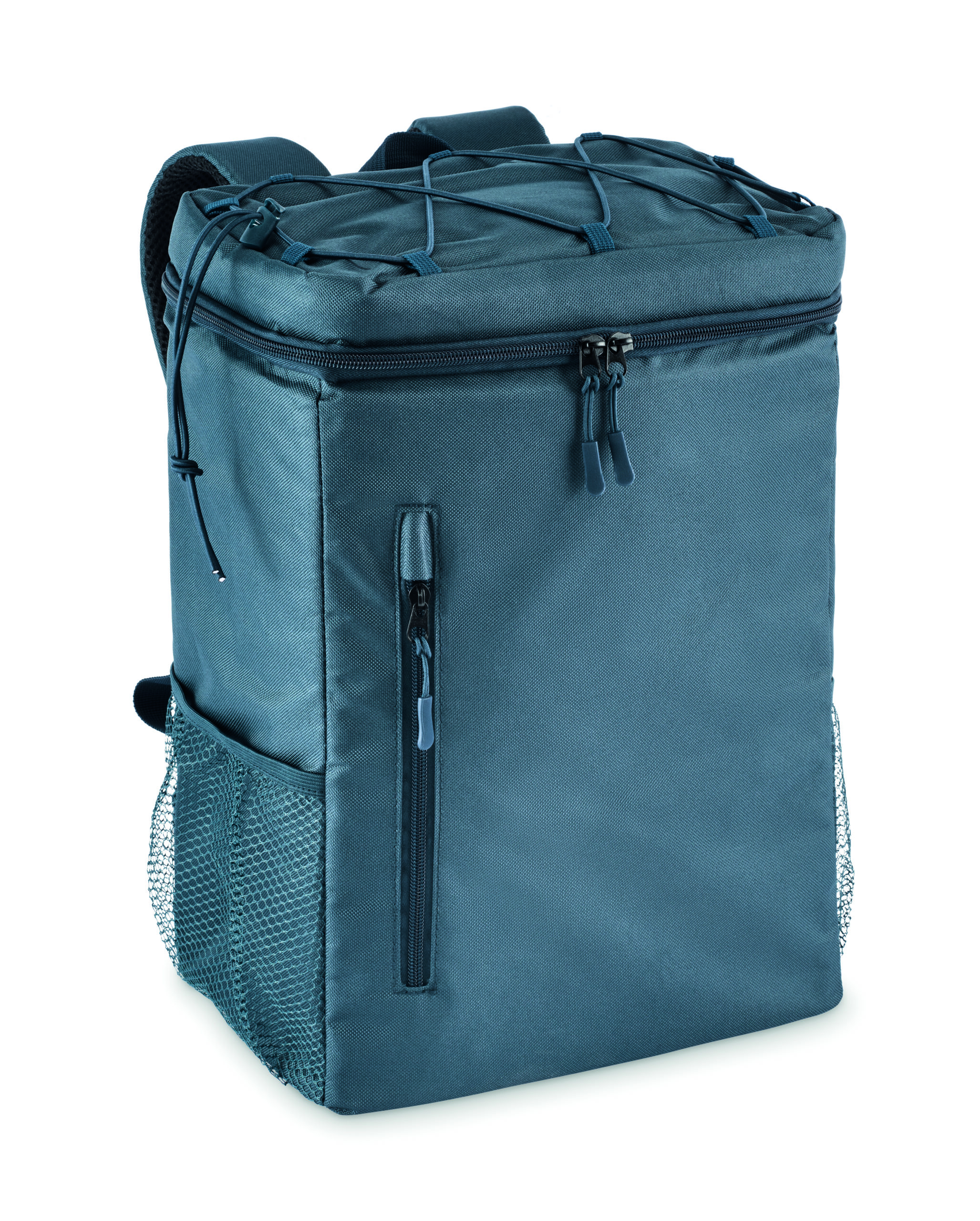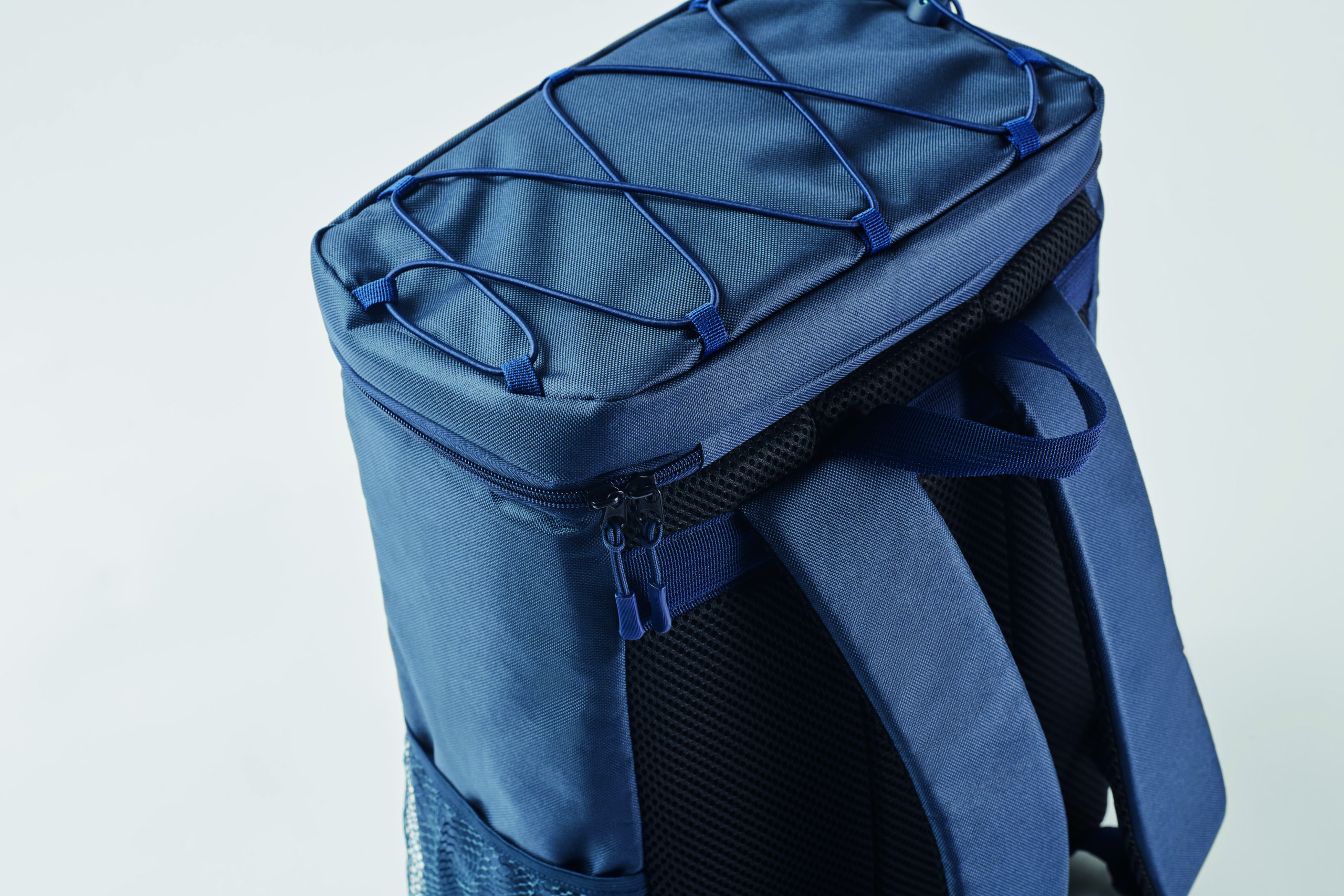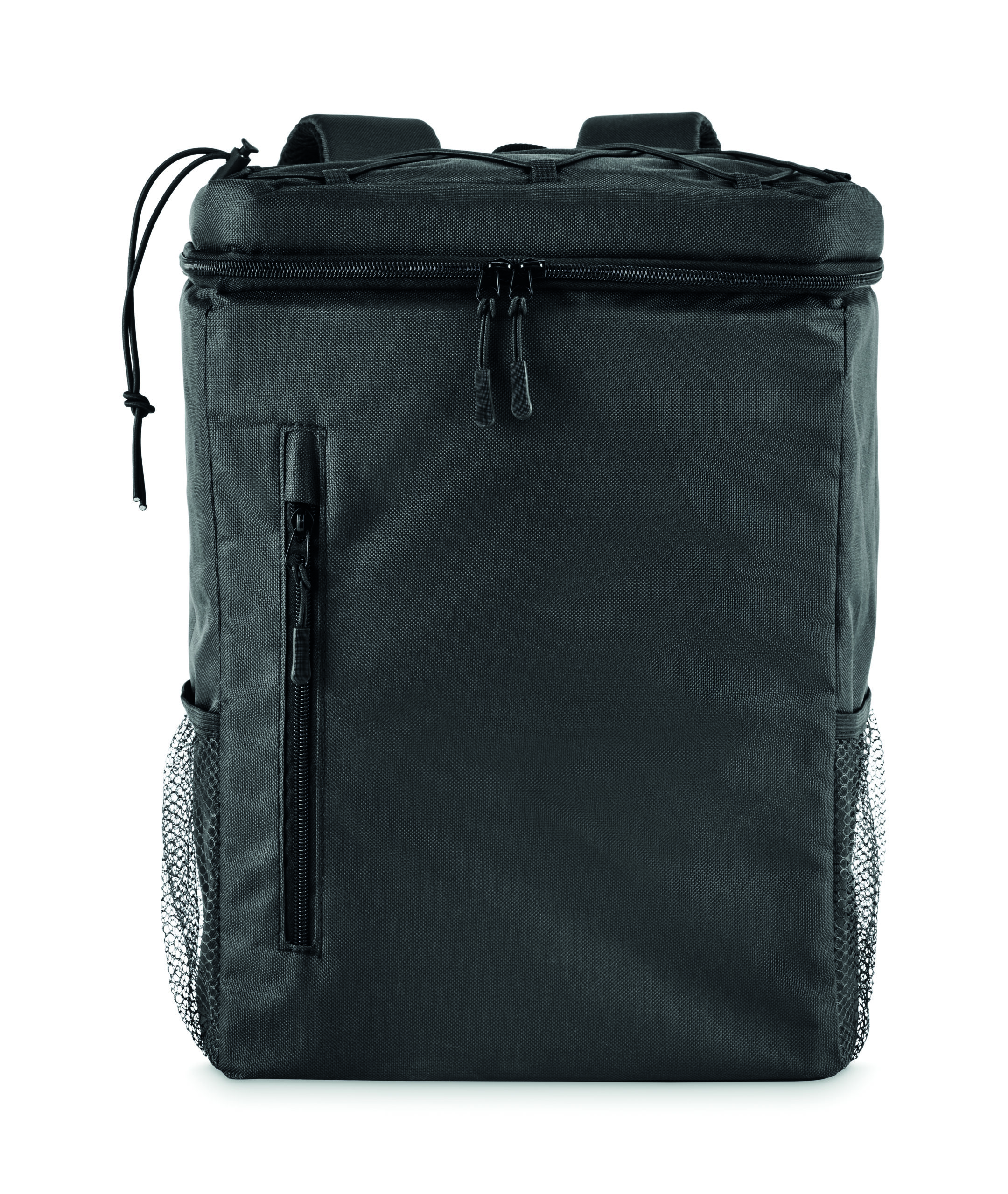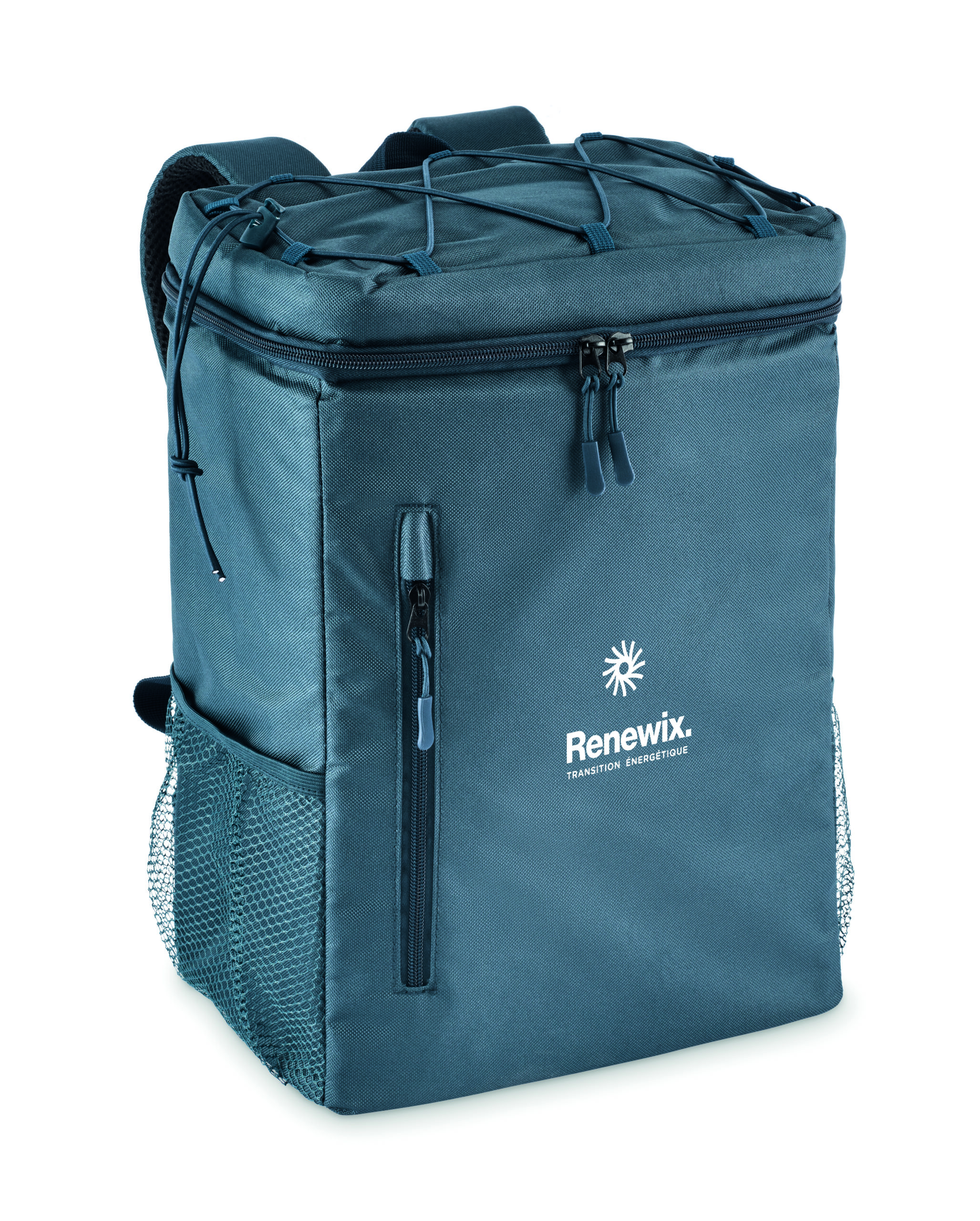 Plecak chłodzący z poliestru 600D RPET z wyściełanymi regulowanymi paskami na ramiona, podszewką PEVA i pianką PE o grubości 5 mm. Ma przednią kieszeń i dwie boczne kieszenie z siatki. Pojemność: 9 l.