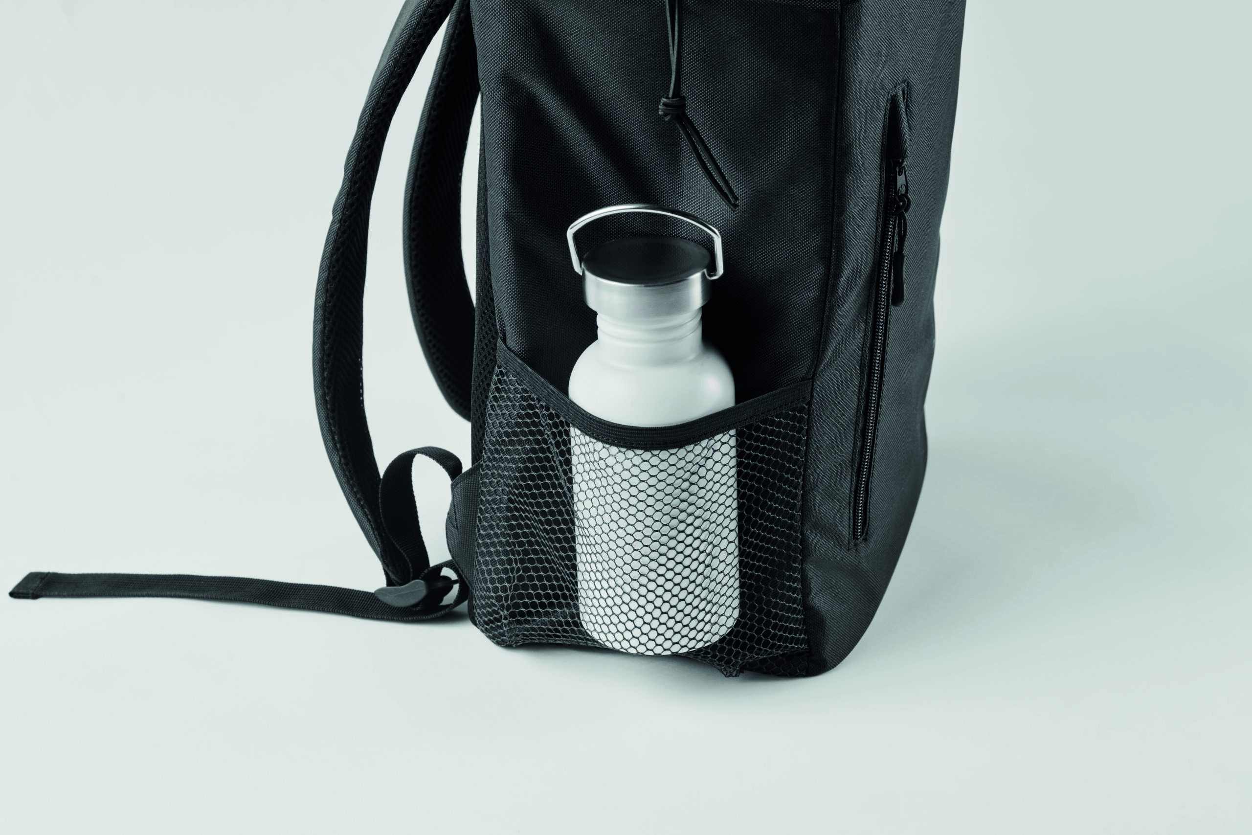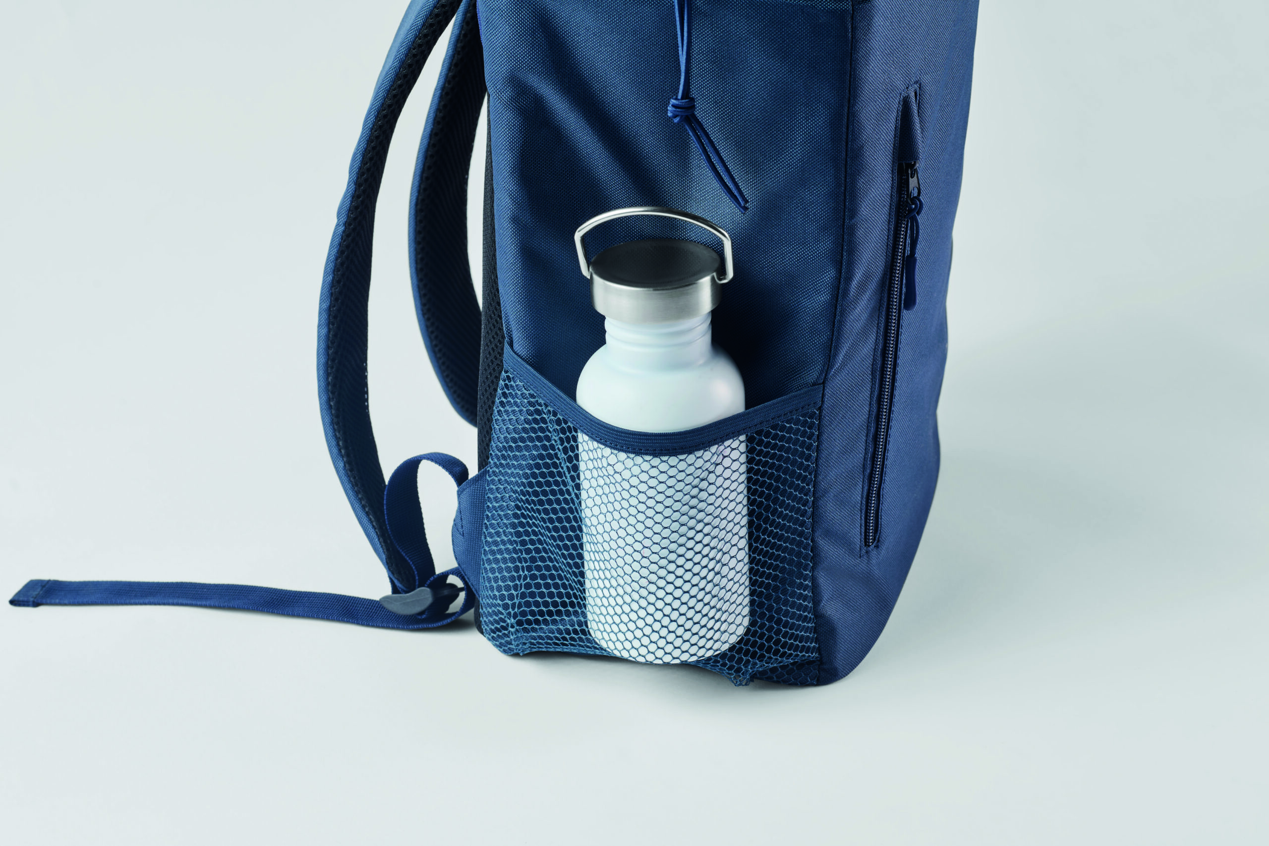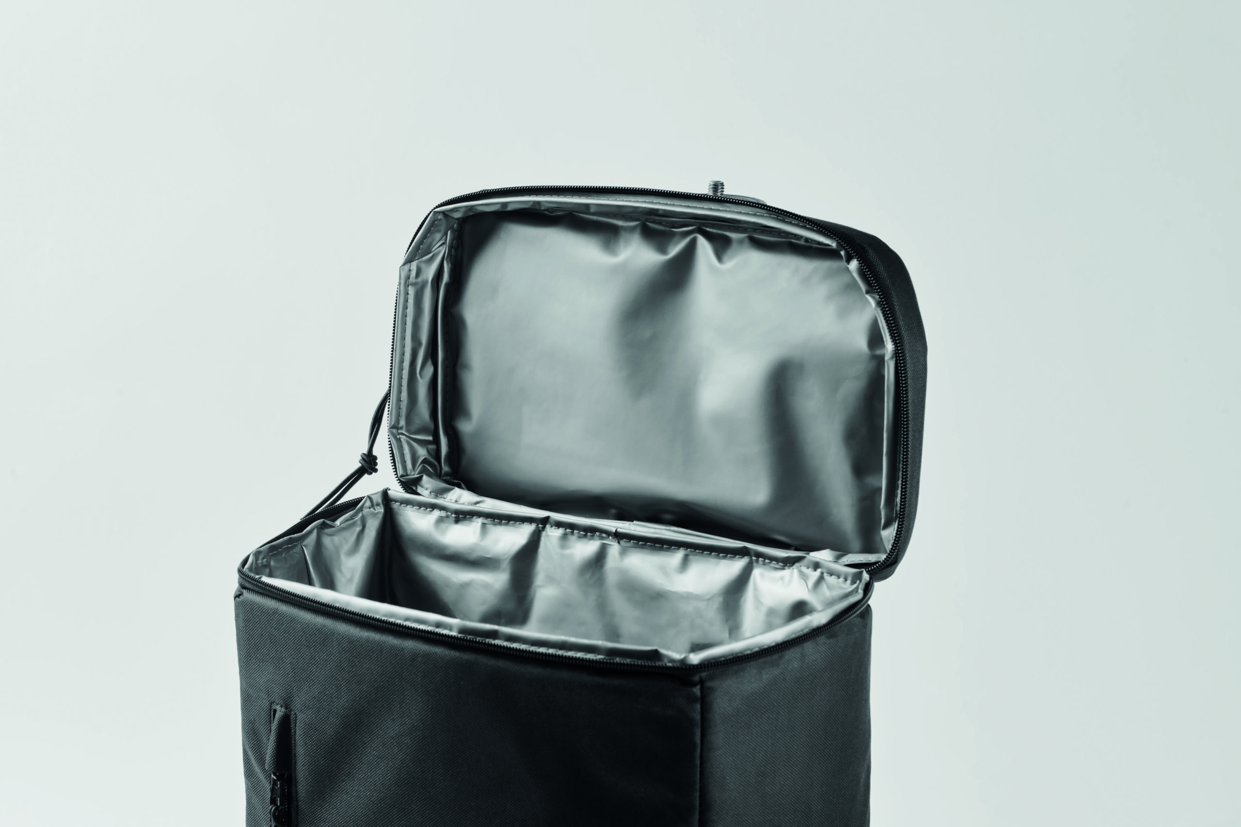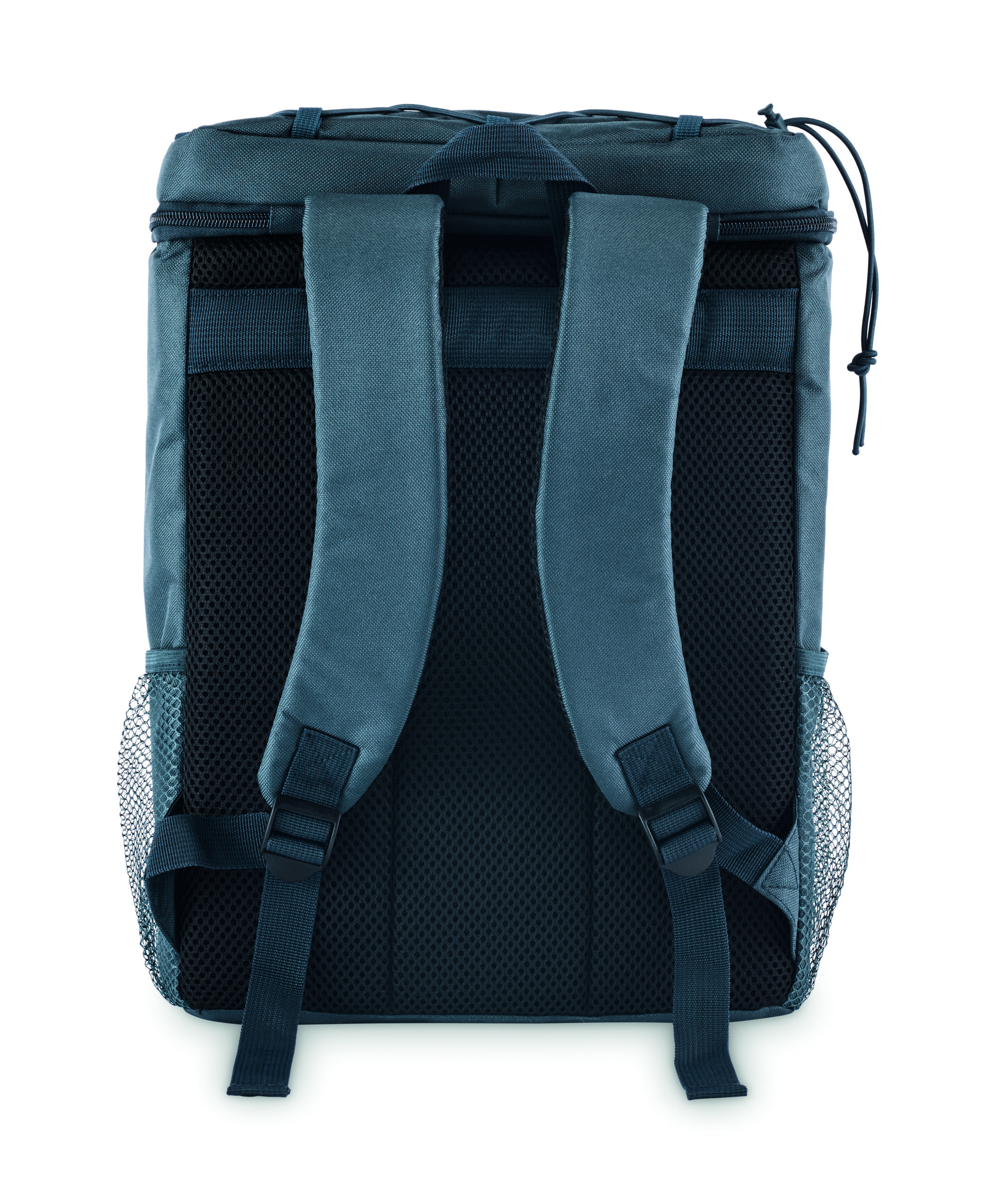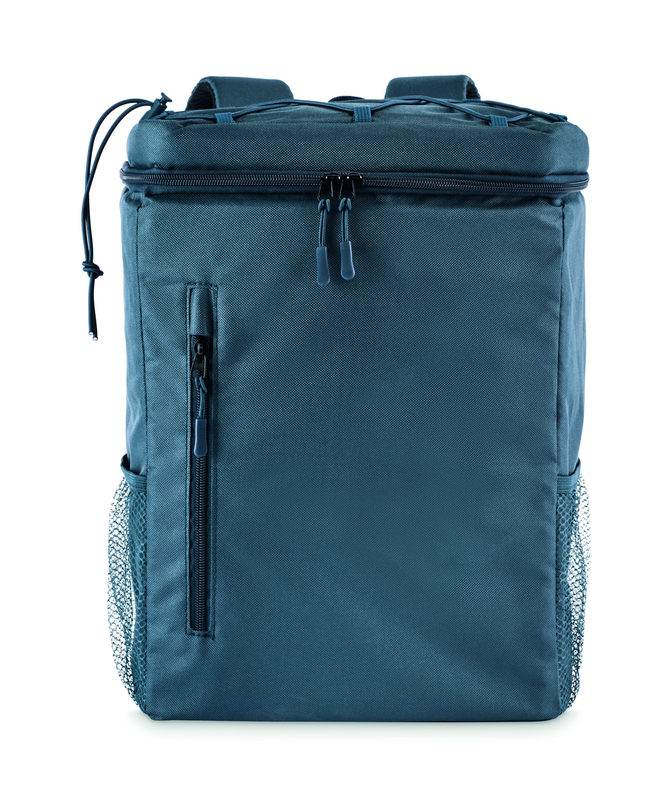 Plecak chłodzący z poliestru 600D RPET z wyściełanymi regulowanymi paskami na ramiona, podszewką PEVA i pianką PE o grubości 5 mm. Ma przednią kieszeń i dwie boczne kieszenie z siatki. Pojemność: 9 l.