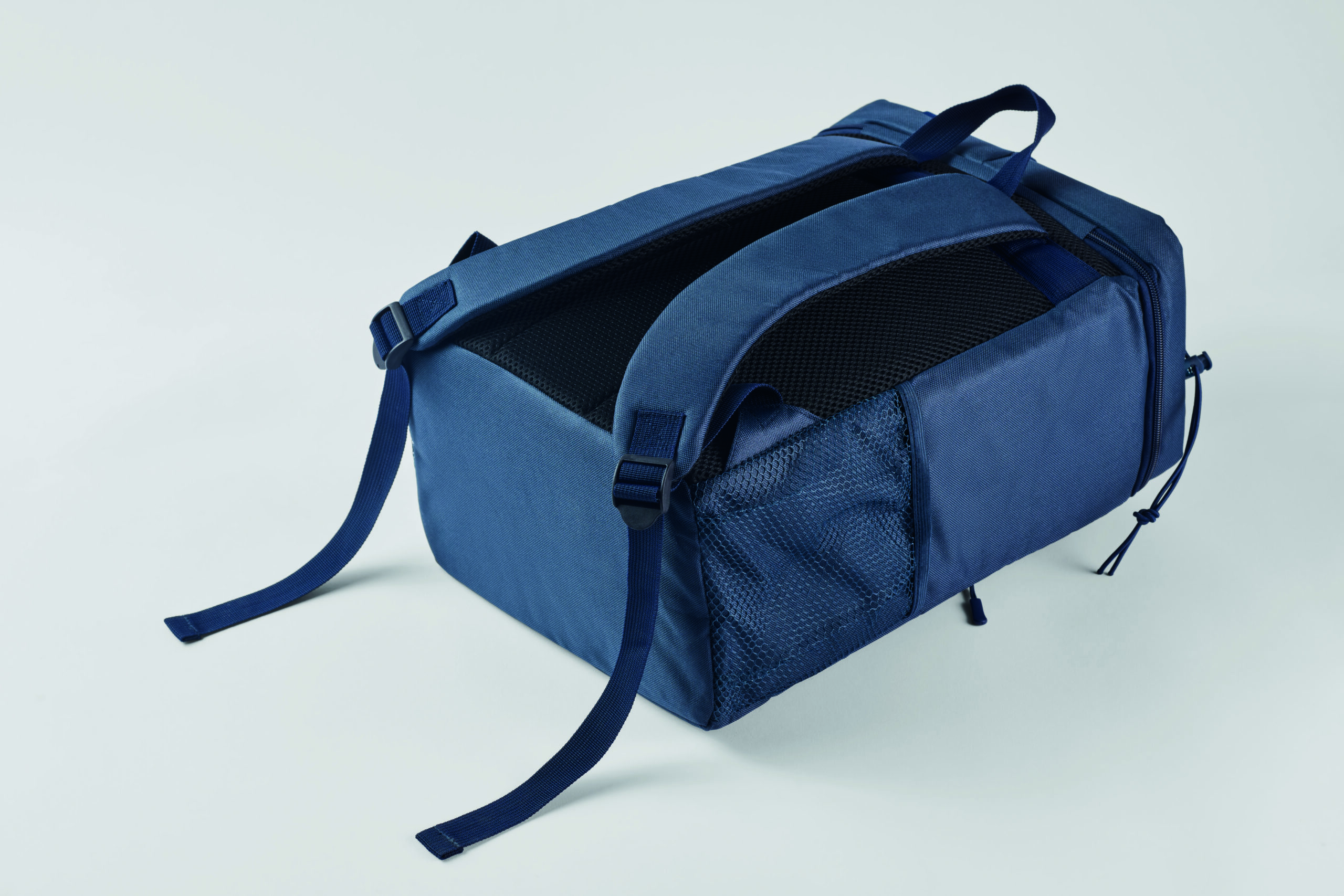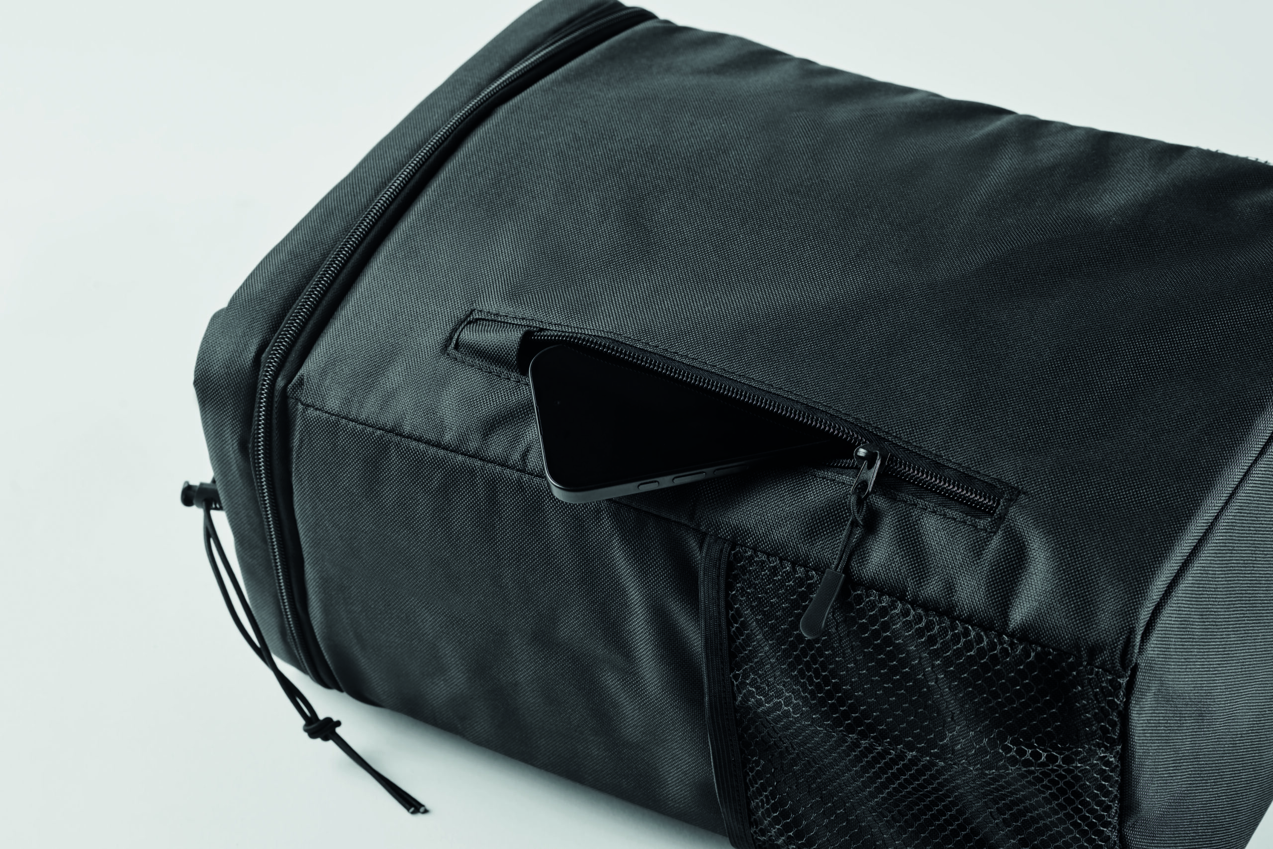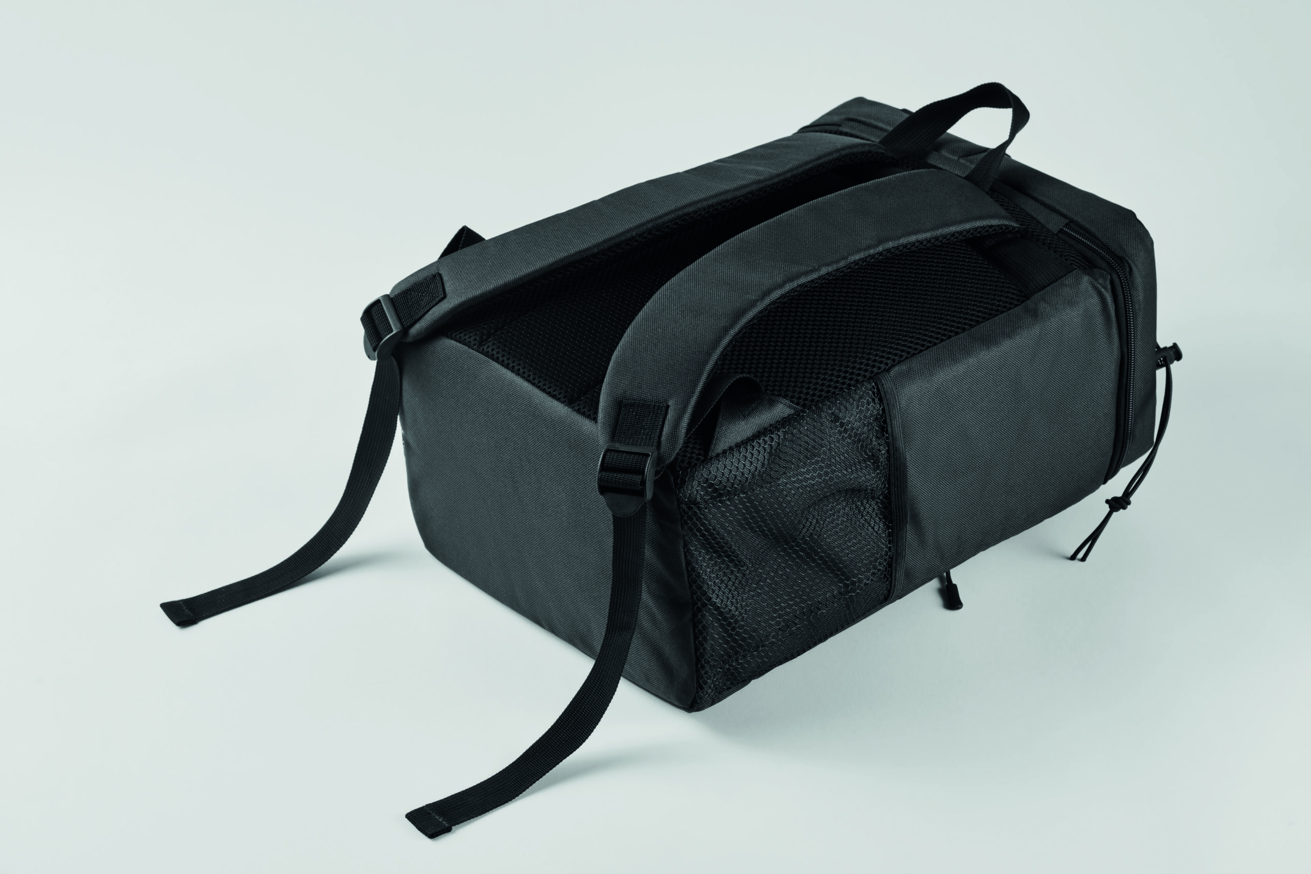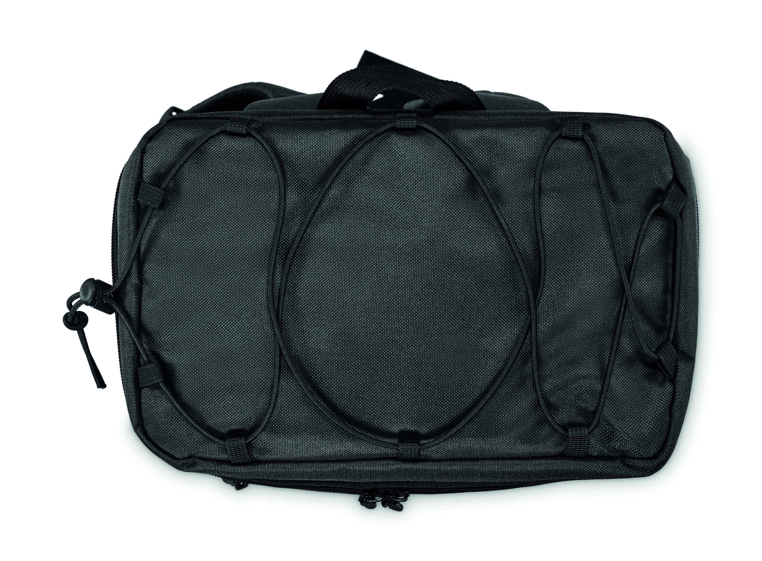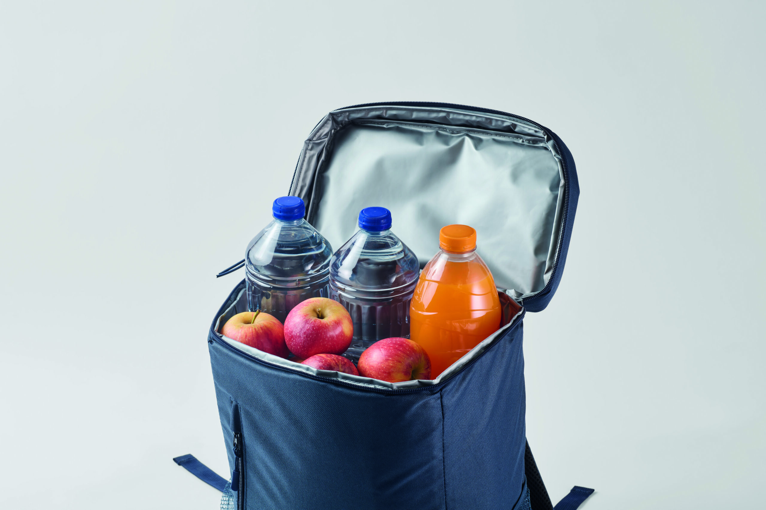 Plecak chłodzący z poliestru 600D RPET z wyściełanymi regulowanymi paskami na ramiona, podszewką PEVA i pianką PE o grubości 5 mm. Ma przednią kieszeń i dwie boczne kieszenie z siatki. Pojemność: 9 l.
