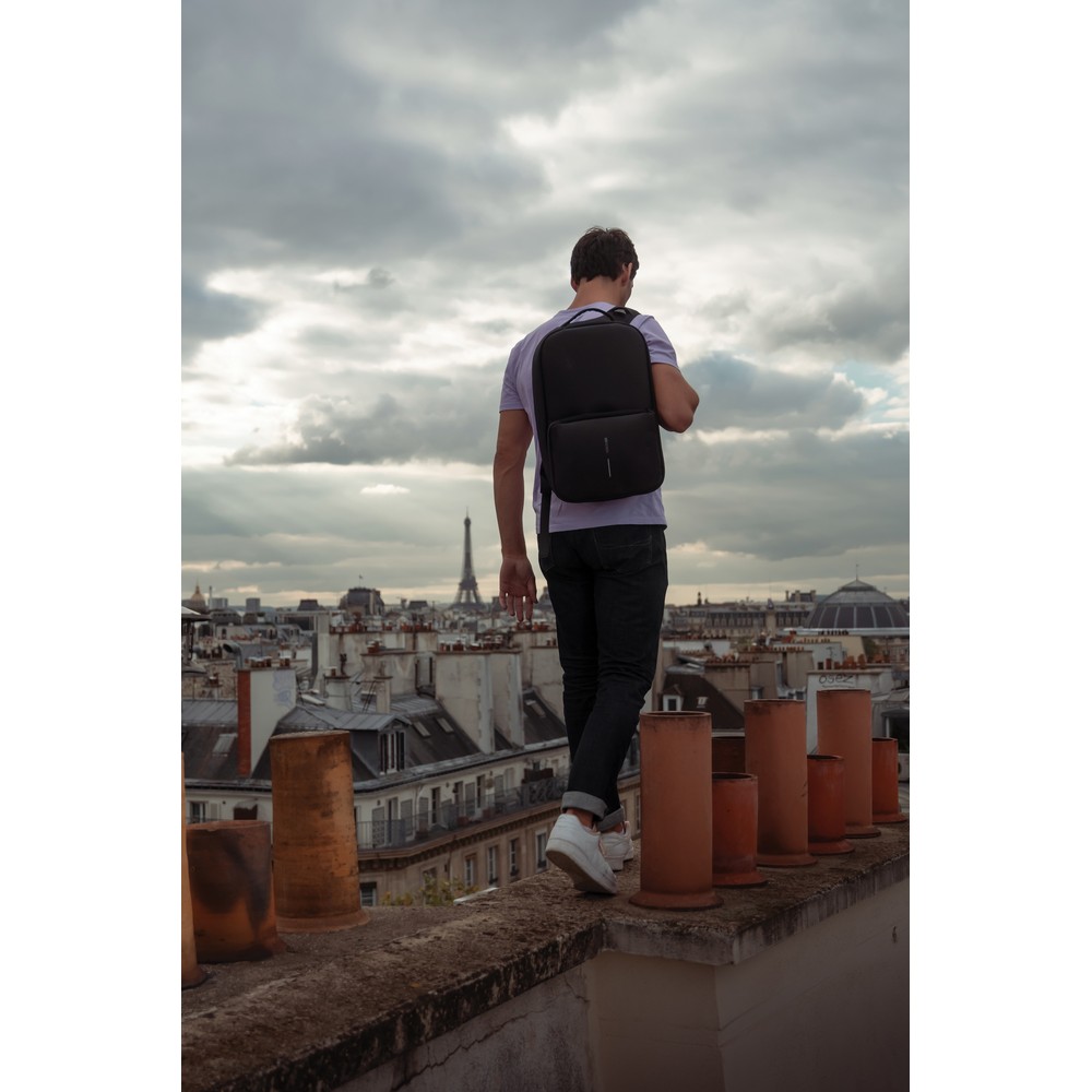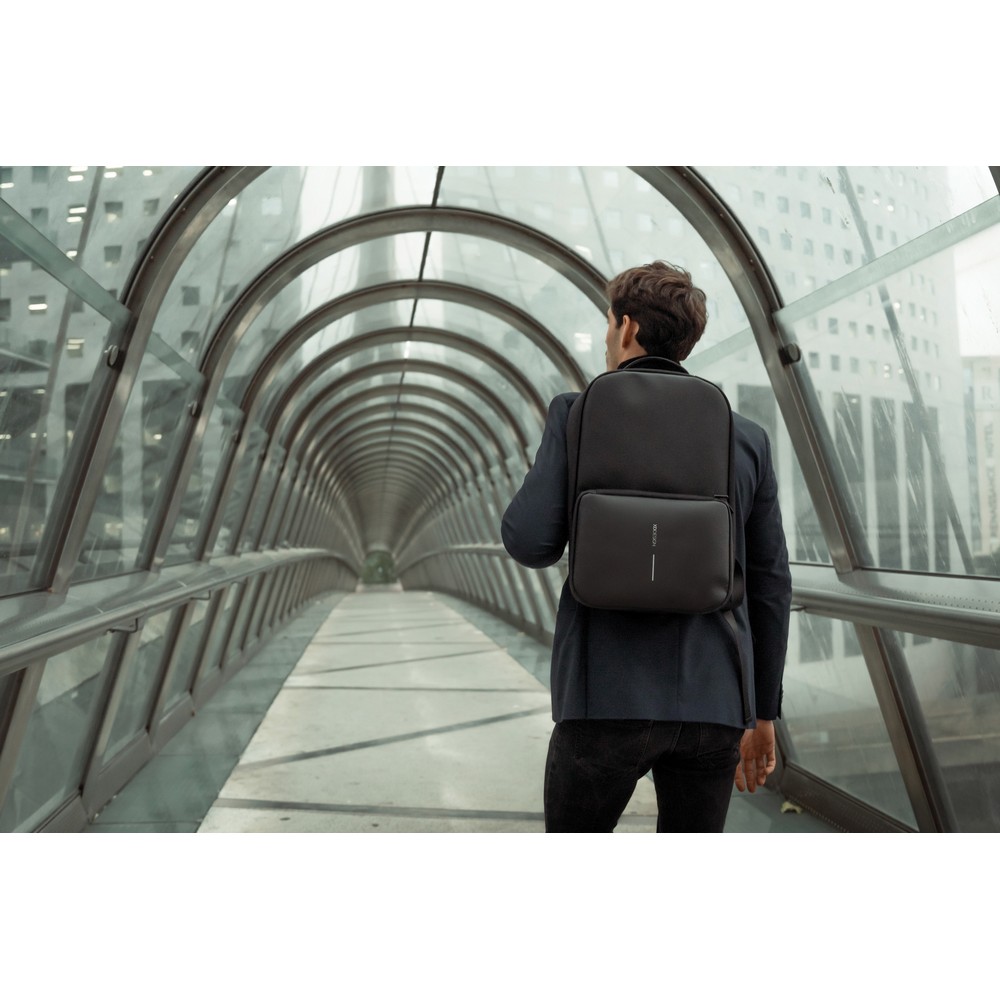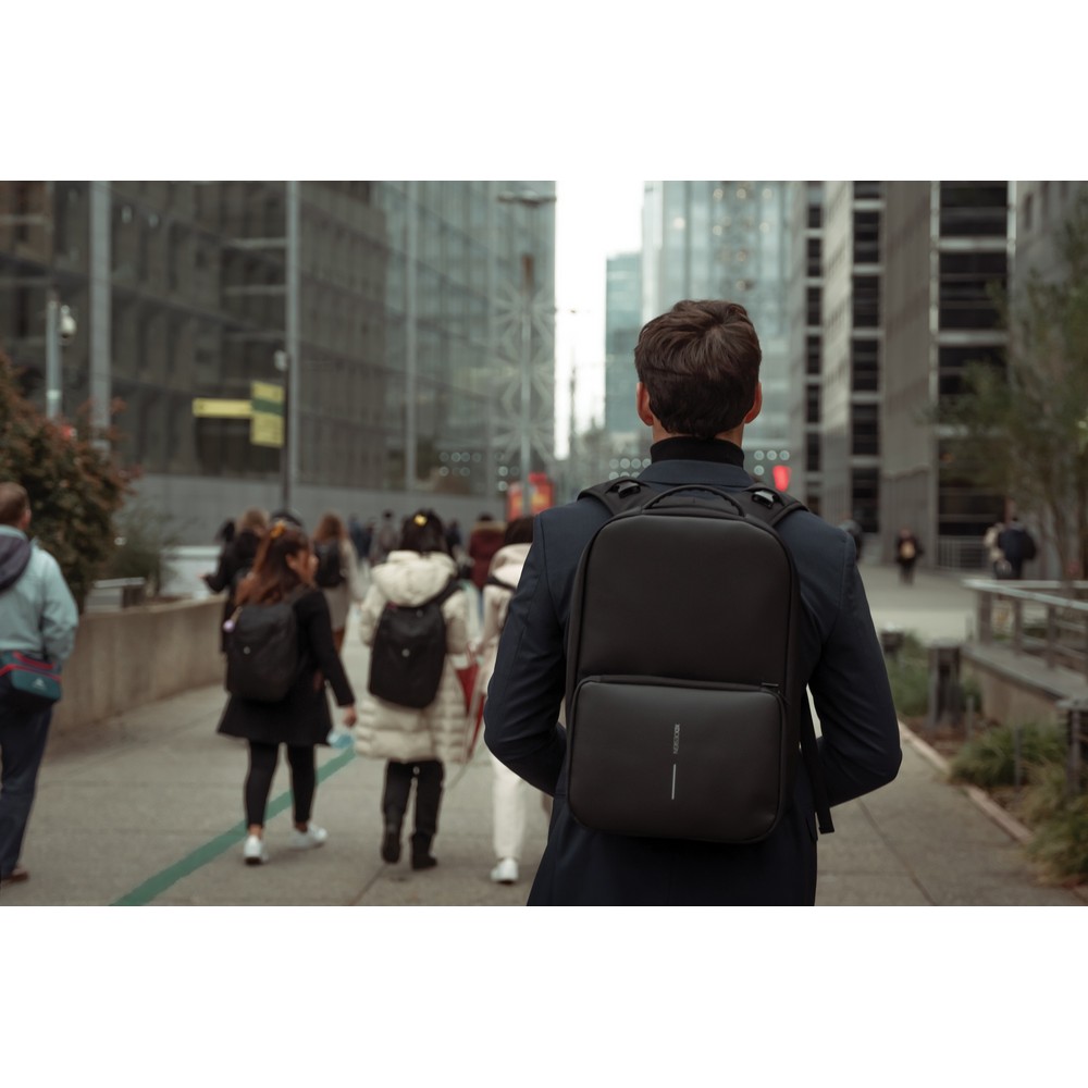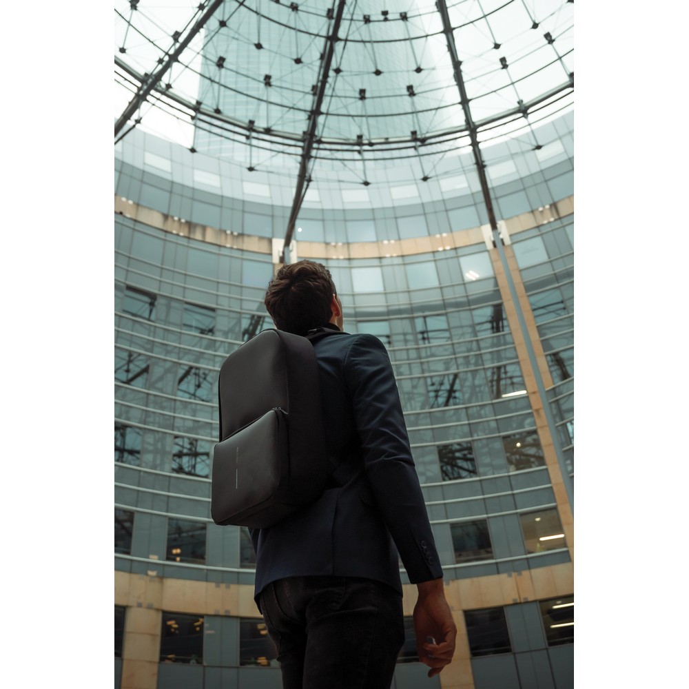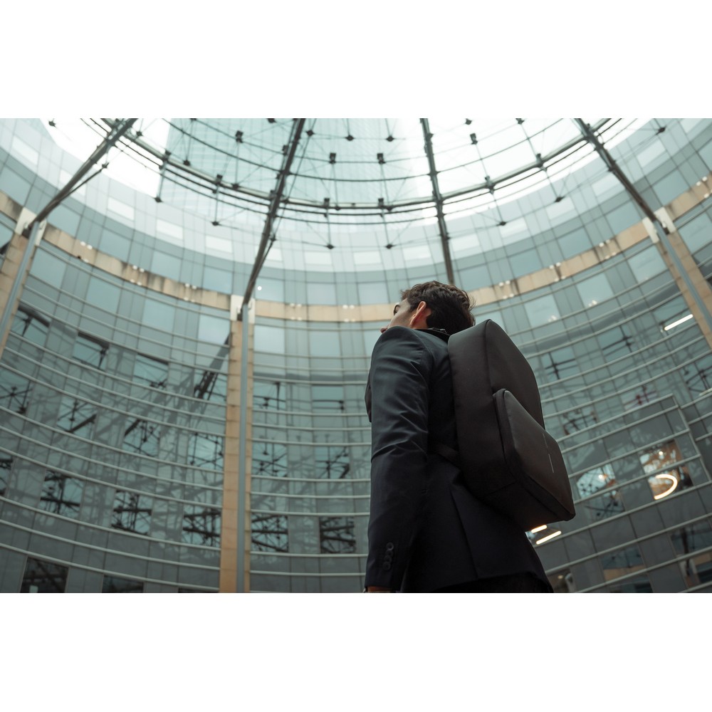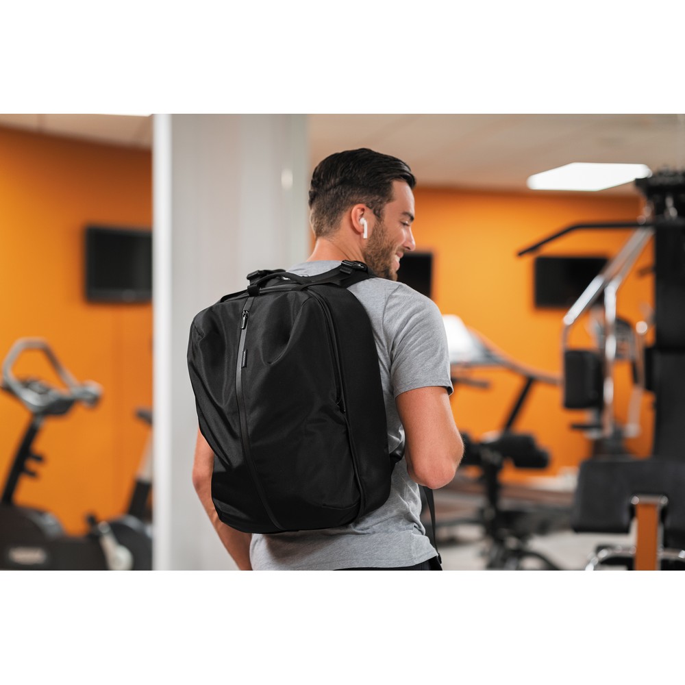 Plecak, torba podróżna, sportowa, wykonana z przyjaznego środowisku materiału rPET, antykradzieżowa konstrukcja bez dostępu z przodu, ukryte zamki i kieszenie, zamiana z plecaka w torbę sportową odbywa się poprzez rozszerzenie kieszeni przedniej z 16 l do 24 l, przestronna przegroda główna z kieszeniami, kieszeń z ochroną RFID, zintegrowany port USB do ładowania telefonów (power-bank nie jest dołączony), posiada uchwyt na okulary, wzór zastrzeżony®, ślad węglowy produktu: 8,39 kg CO2