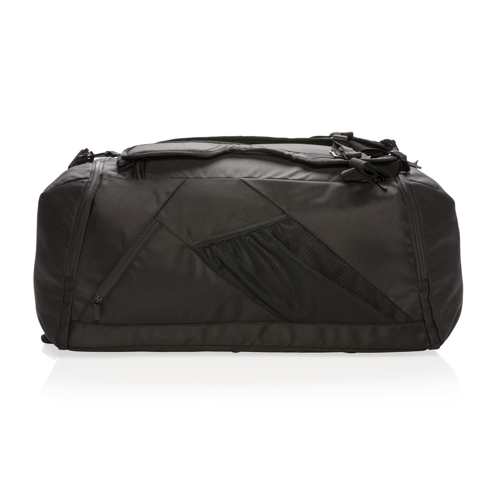 Plecak, torba sportowa, podróżna z ochroną RFID, wykonany z poliestru 1680D i 600D, pojemna przegroda główna z górnym zamknięciem na zamek błyskawiczny w kształcie litery U, boczna przegroda na buty, druga boczna kieszeń na zamek błyskawiczny, z tyłu dodatkowa kieszeń oraz kieszeń szybkiego dostępu, przednia kieszeń na zamek błyskawiczny z ochroną RFID, regulowane paski na ramię, nie zawiera PVC, ślad węglowy produktu: 7,81 kg CO2