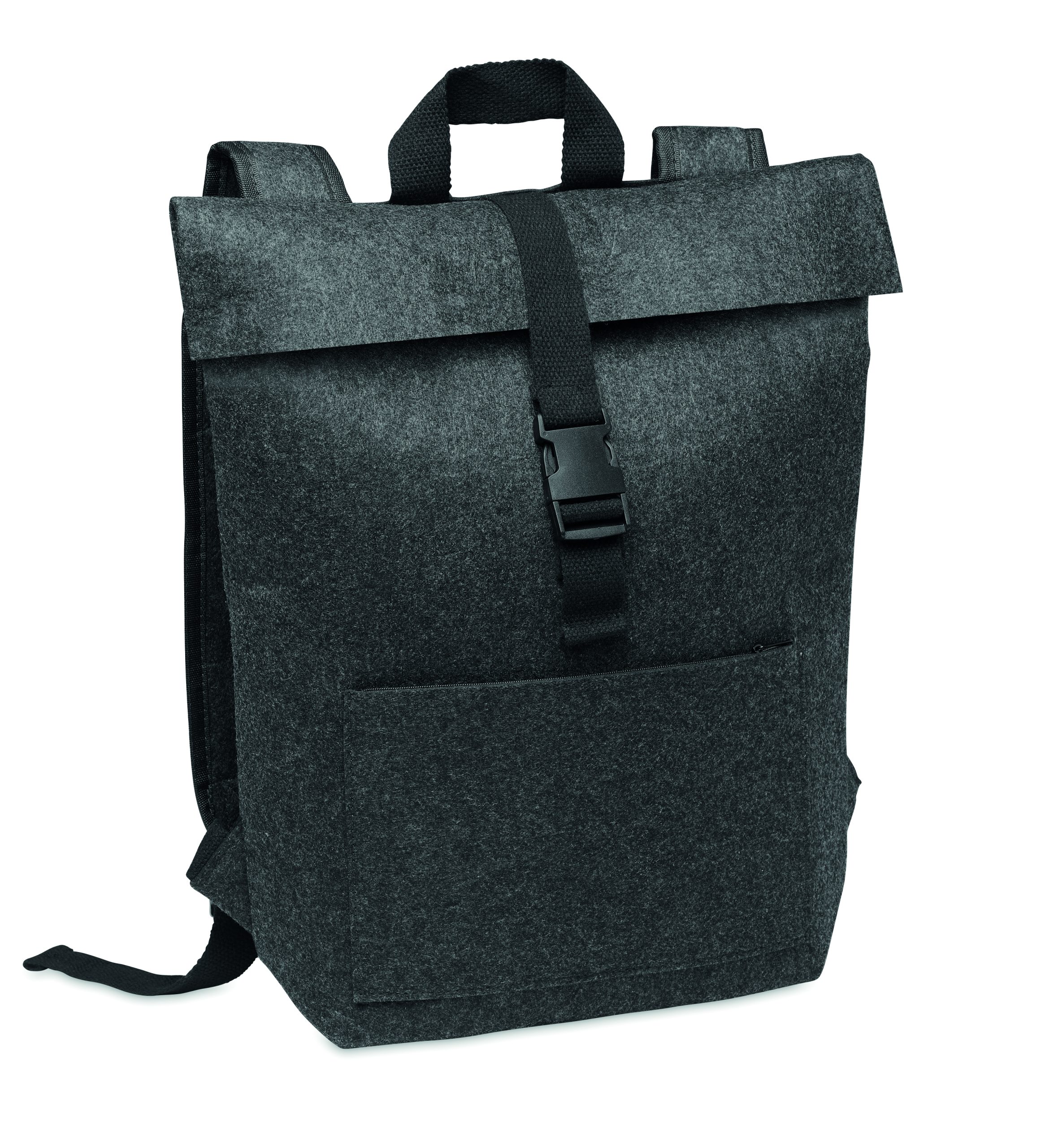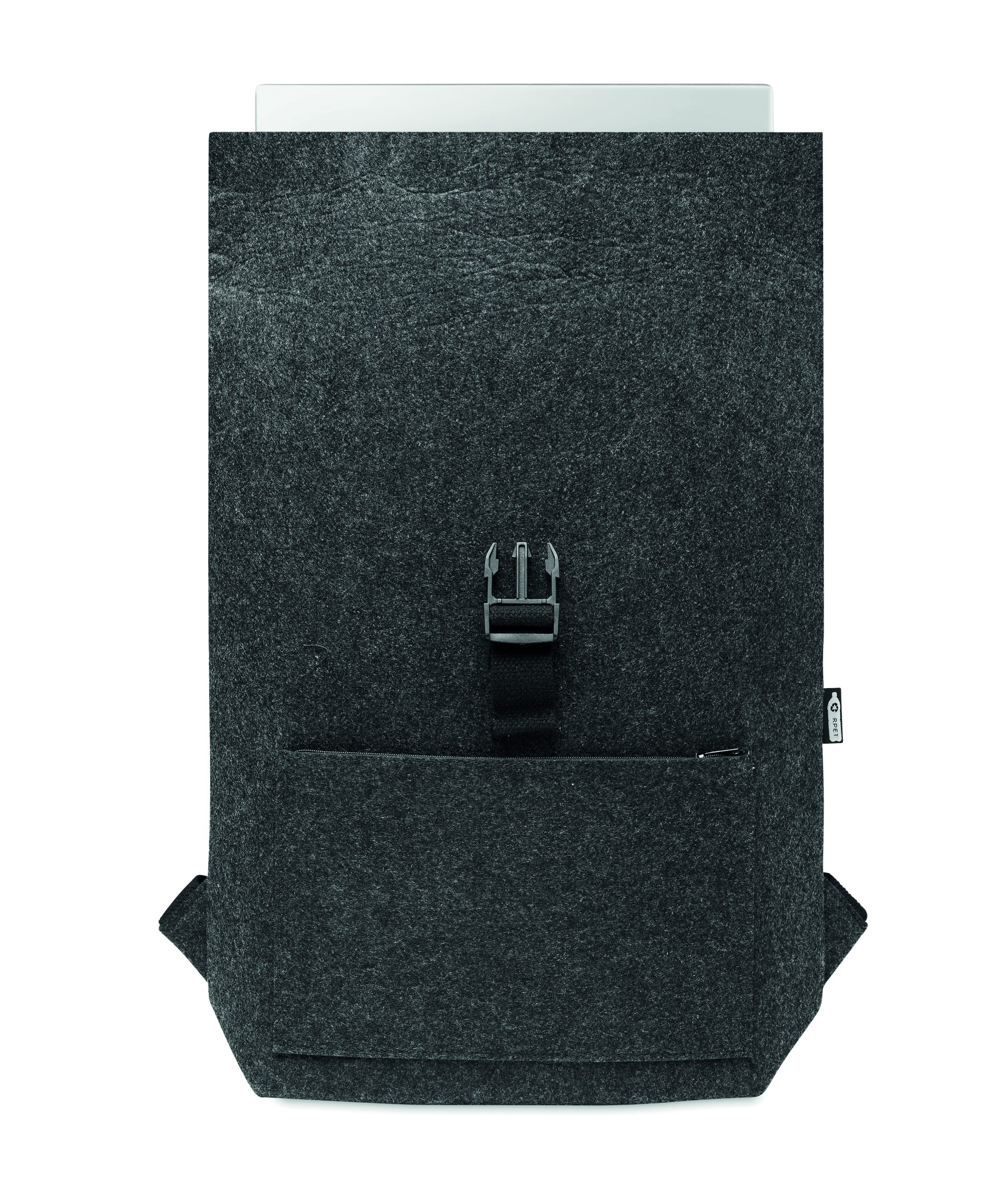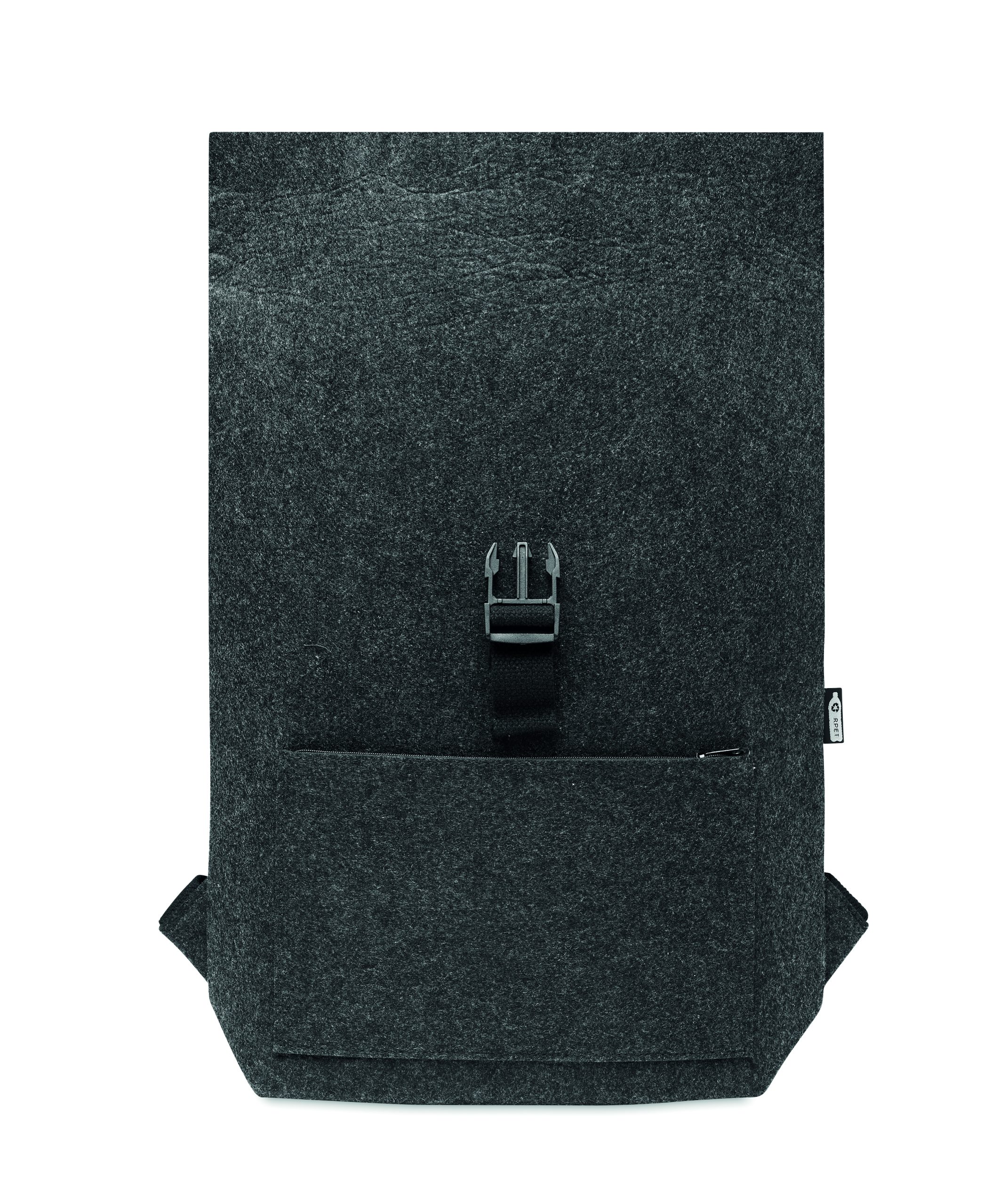 Plecak filcowy RPET z bawełnianym paskiem zapinanym na klamrę i kieszenią zapinaną na zamek z przodu. Posiada przegrodę na laptopa.