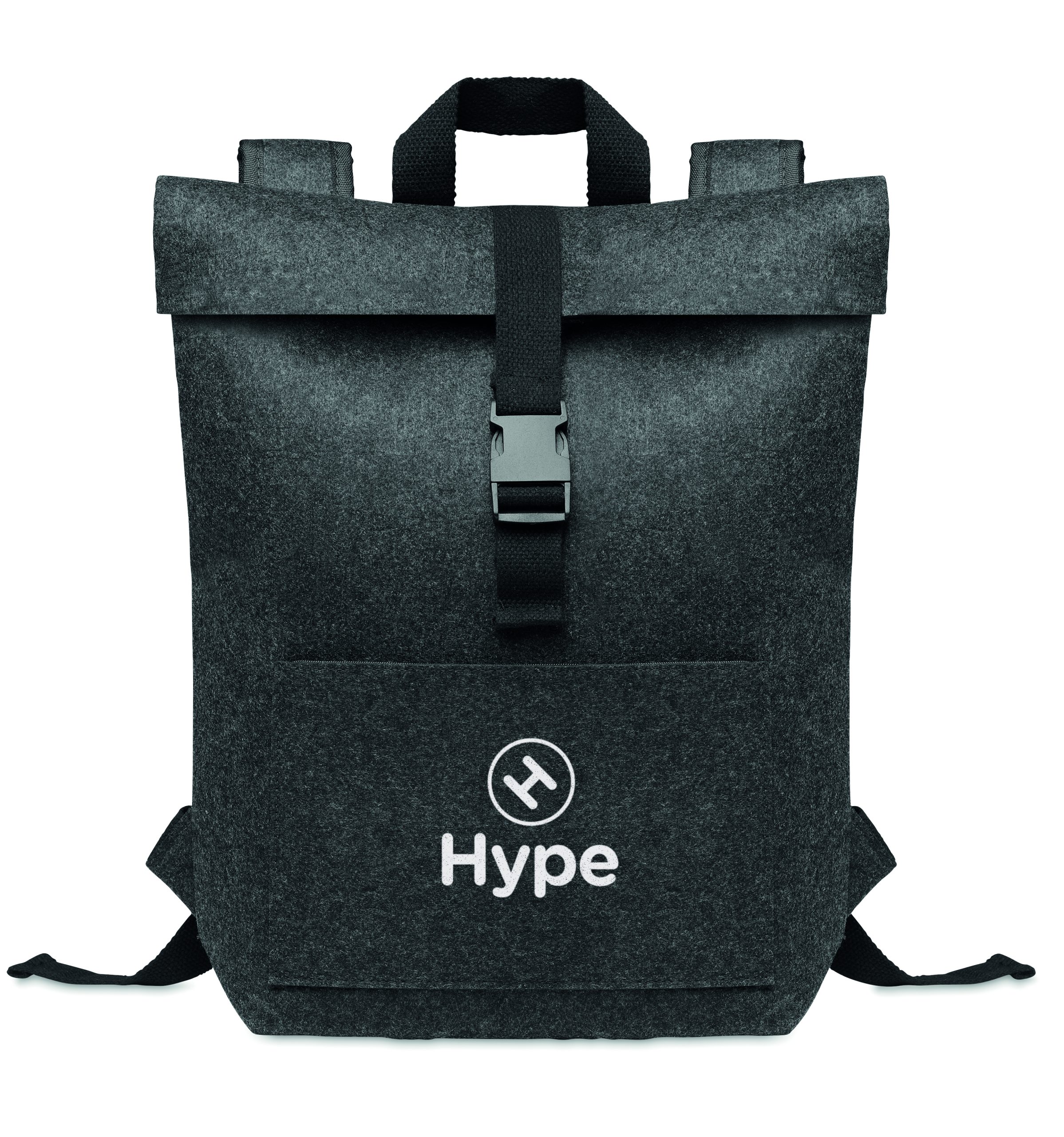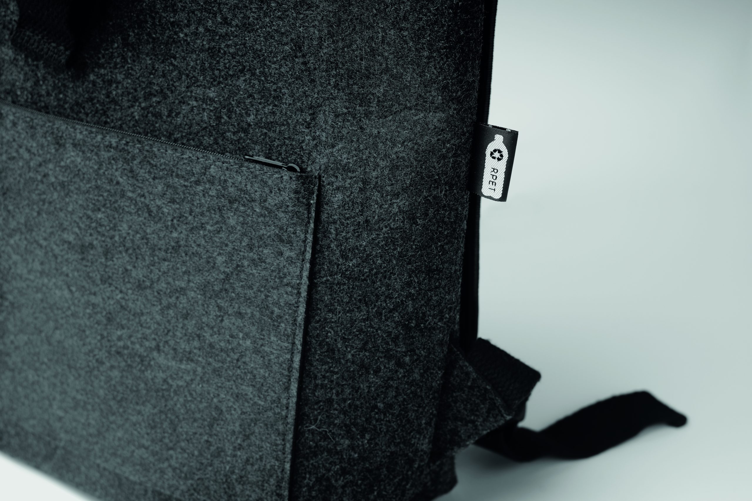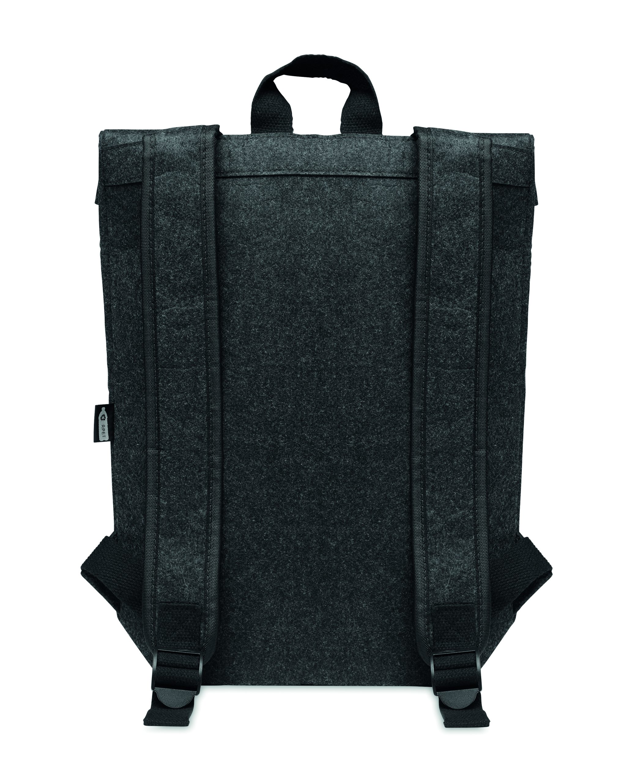 Plecak filcowy RPET z bawełnianym paskiem zapinanym na klamrę i kieszenią zapinaną na zamek z przodu. Posiada przegrodę na laptopa.