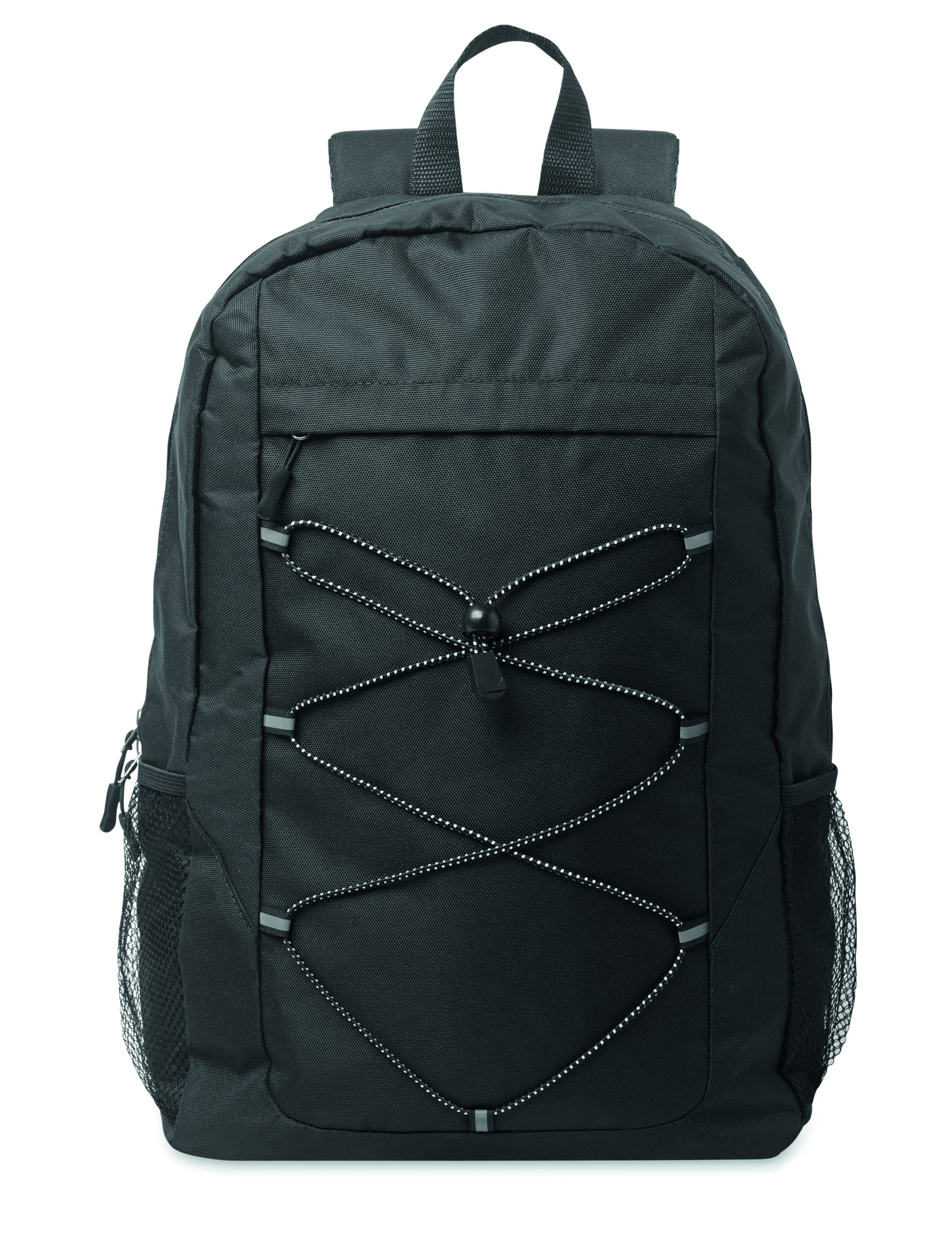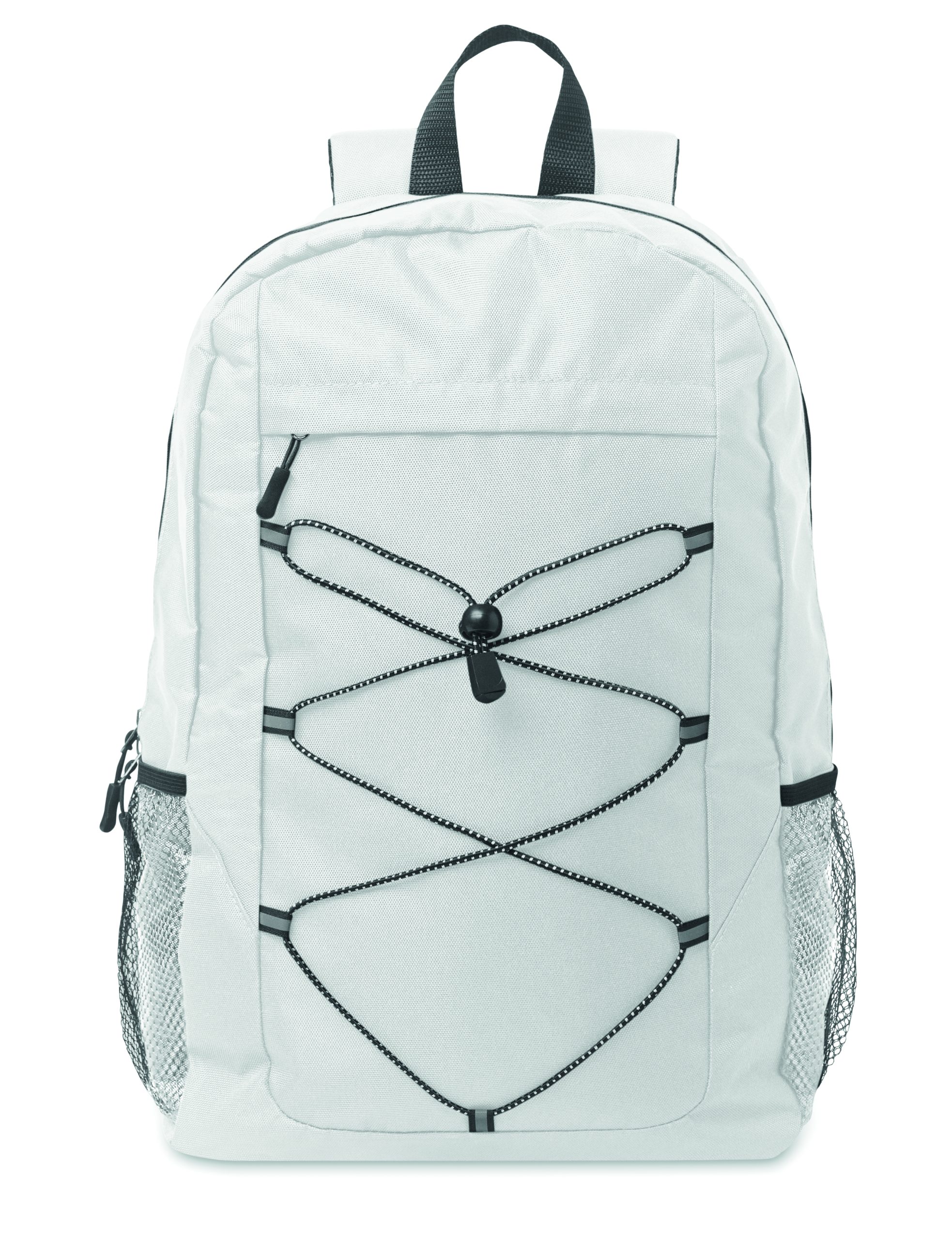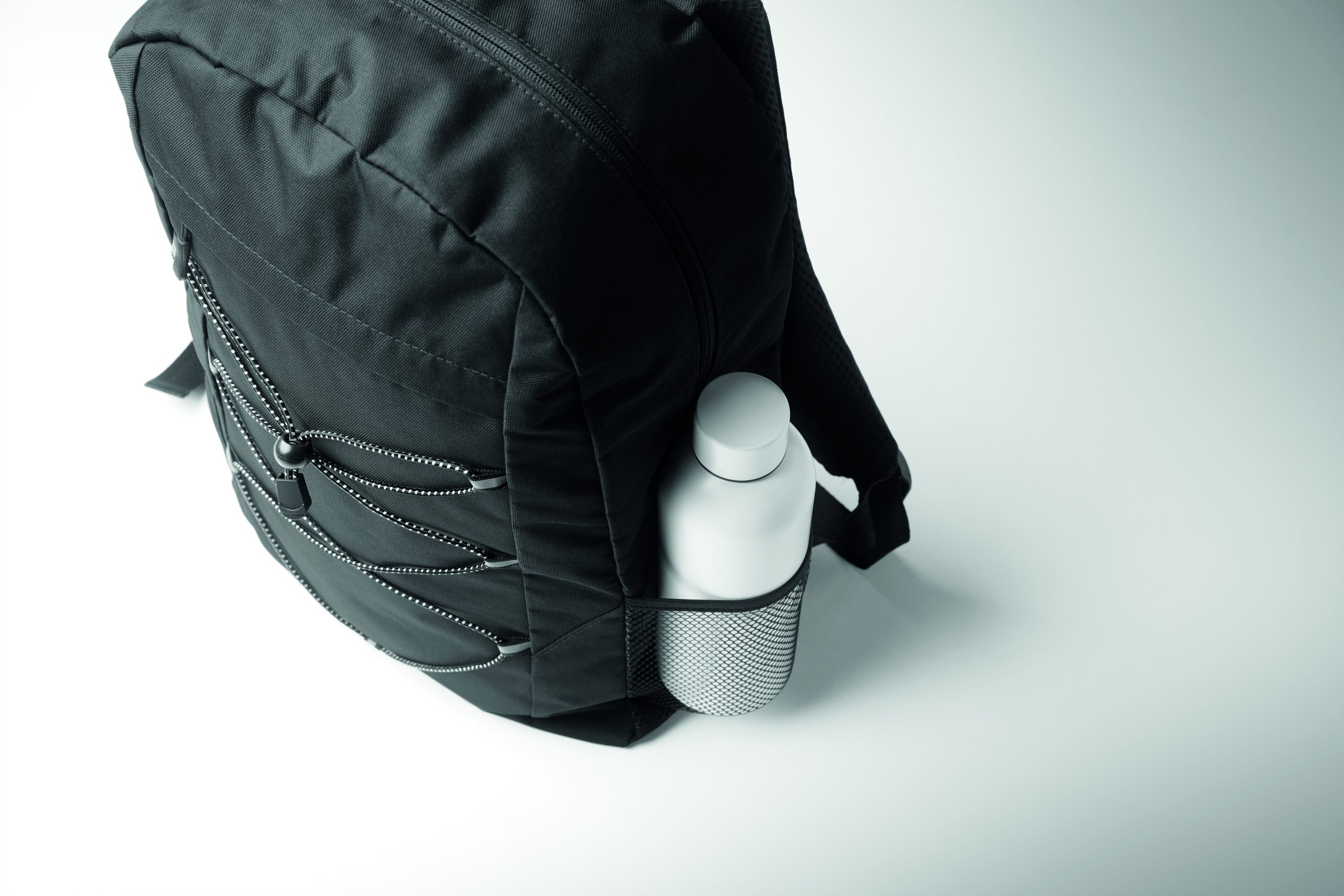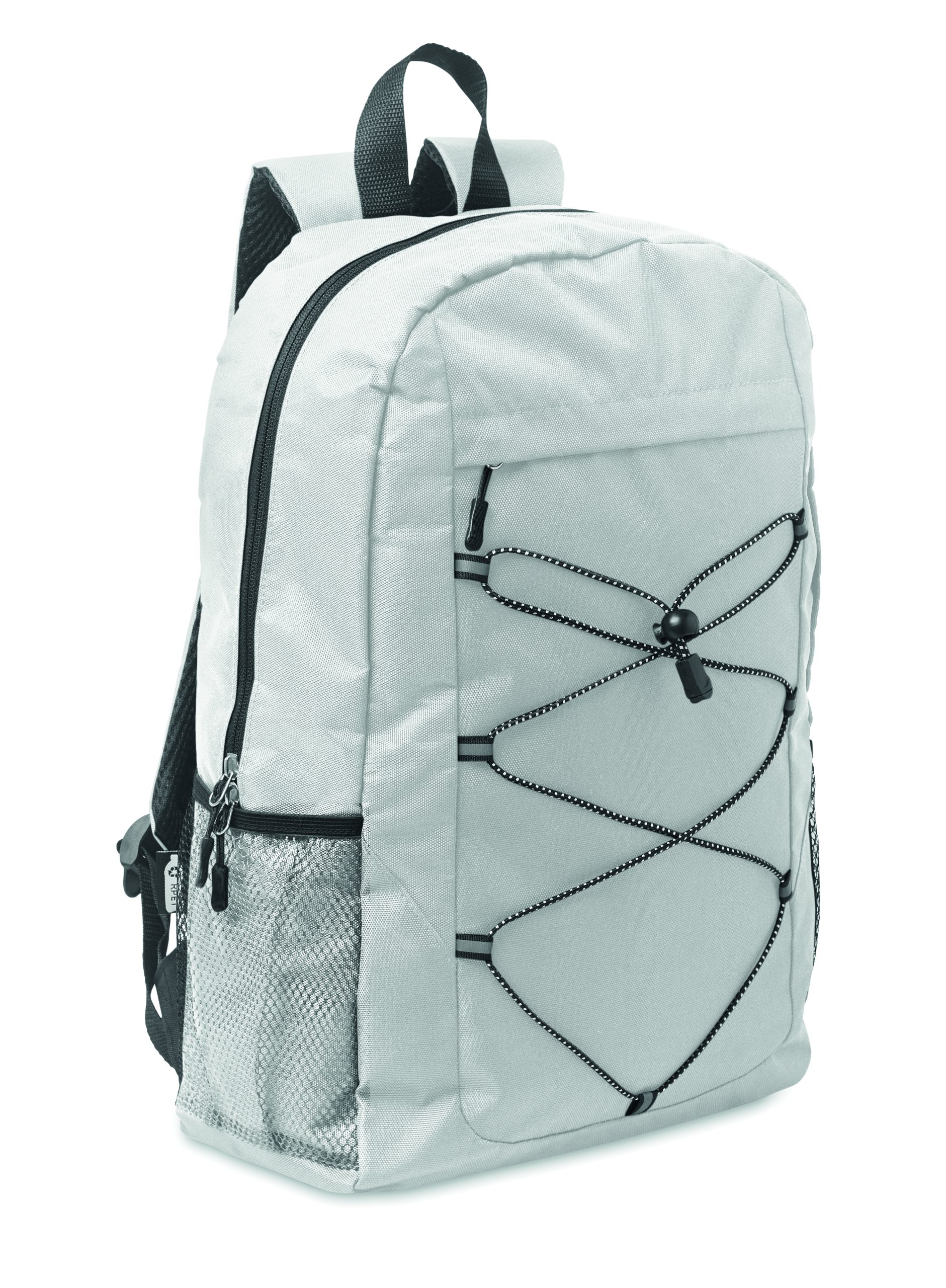 Plecak z poliestru 600D RPET z ozdobnym sznurkiem i przednią kieszenią zapinaną na zamek. Siateczkowe kieszenie po obu stronach.
