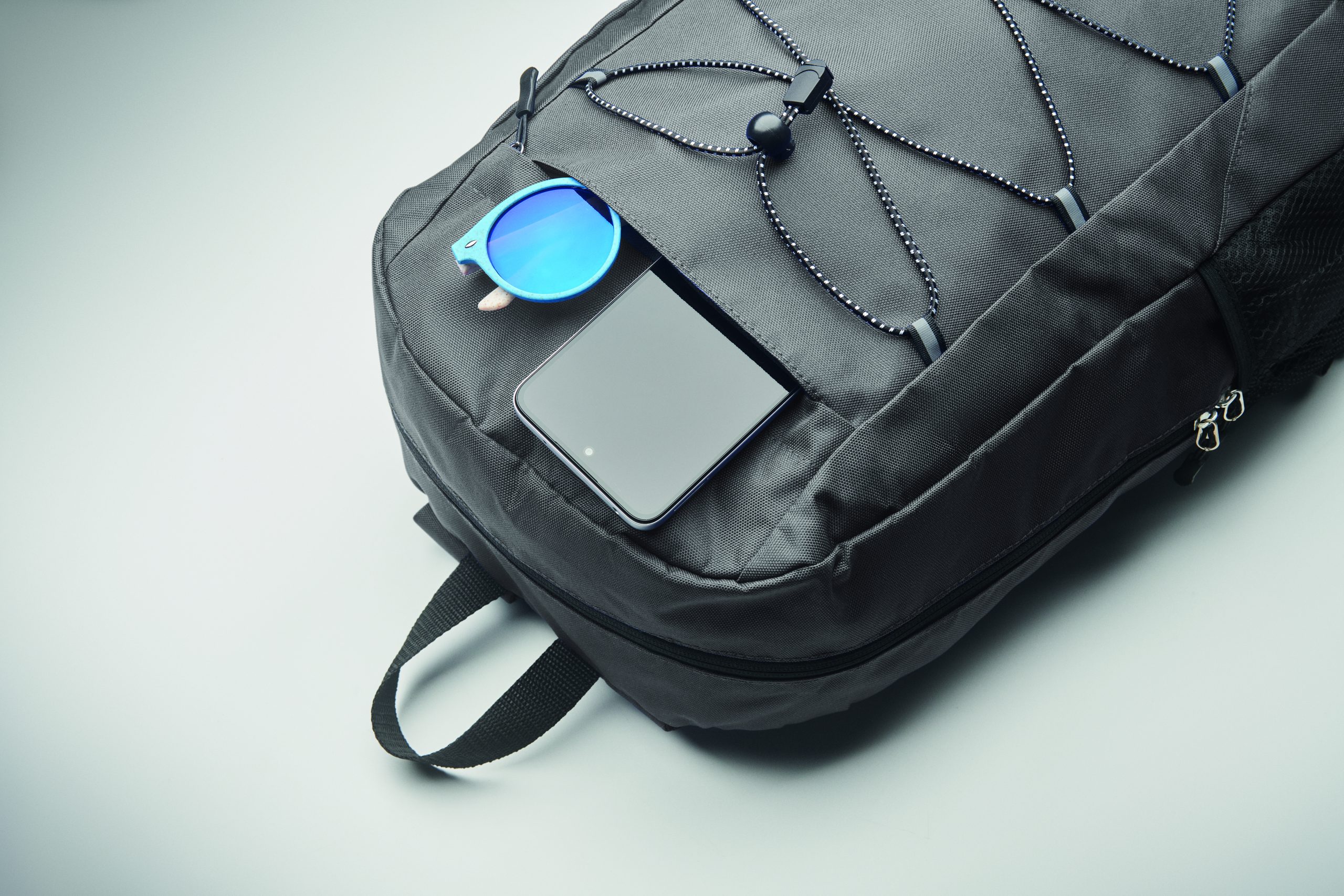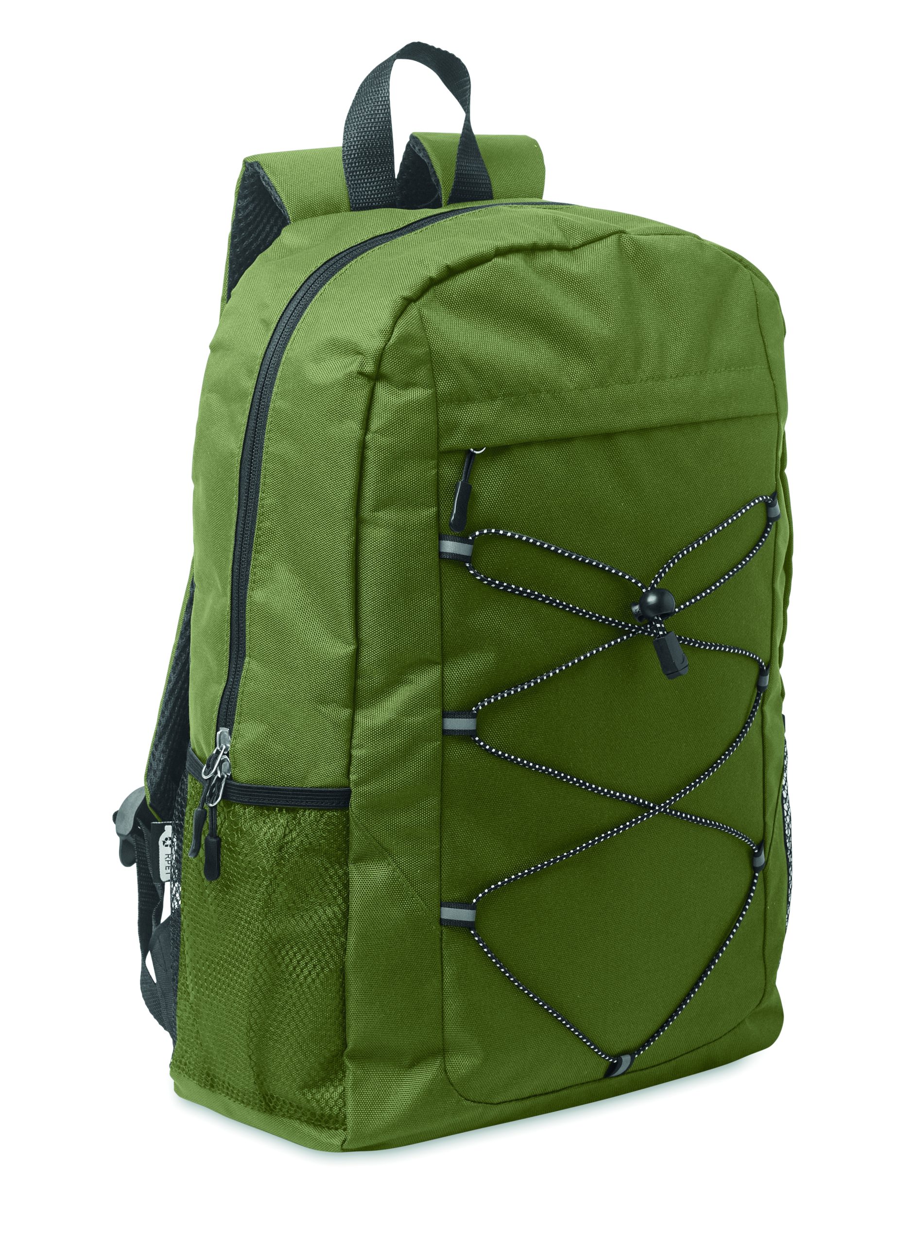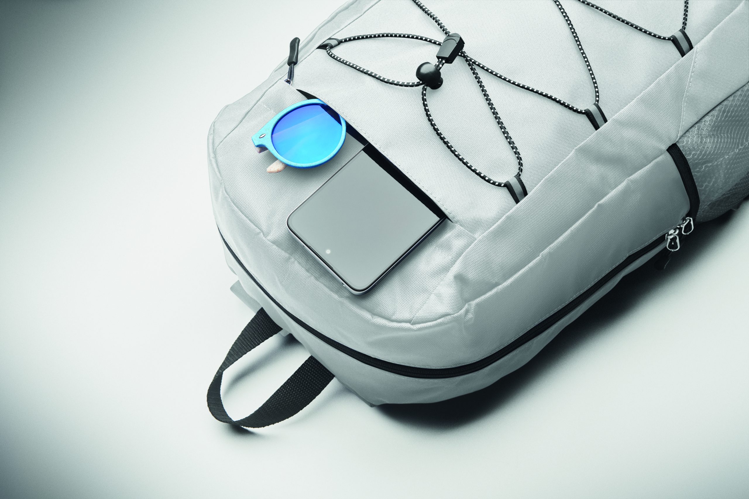 Plecak z poliestru 600D RPET z ozdobnym sznurkiem i przednią kieszenią zapinaną na zamek. Siateczkowe kieszenie po obu stronach.