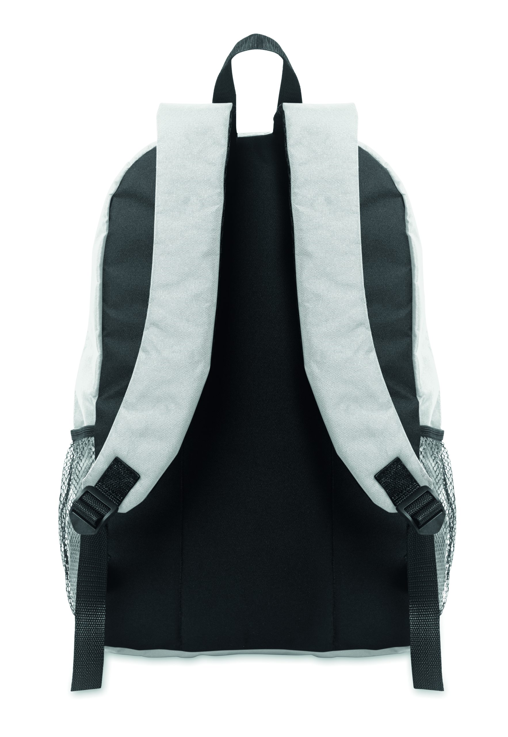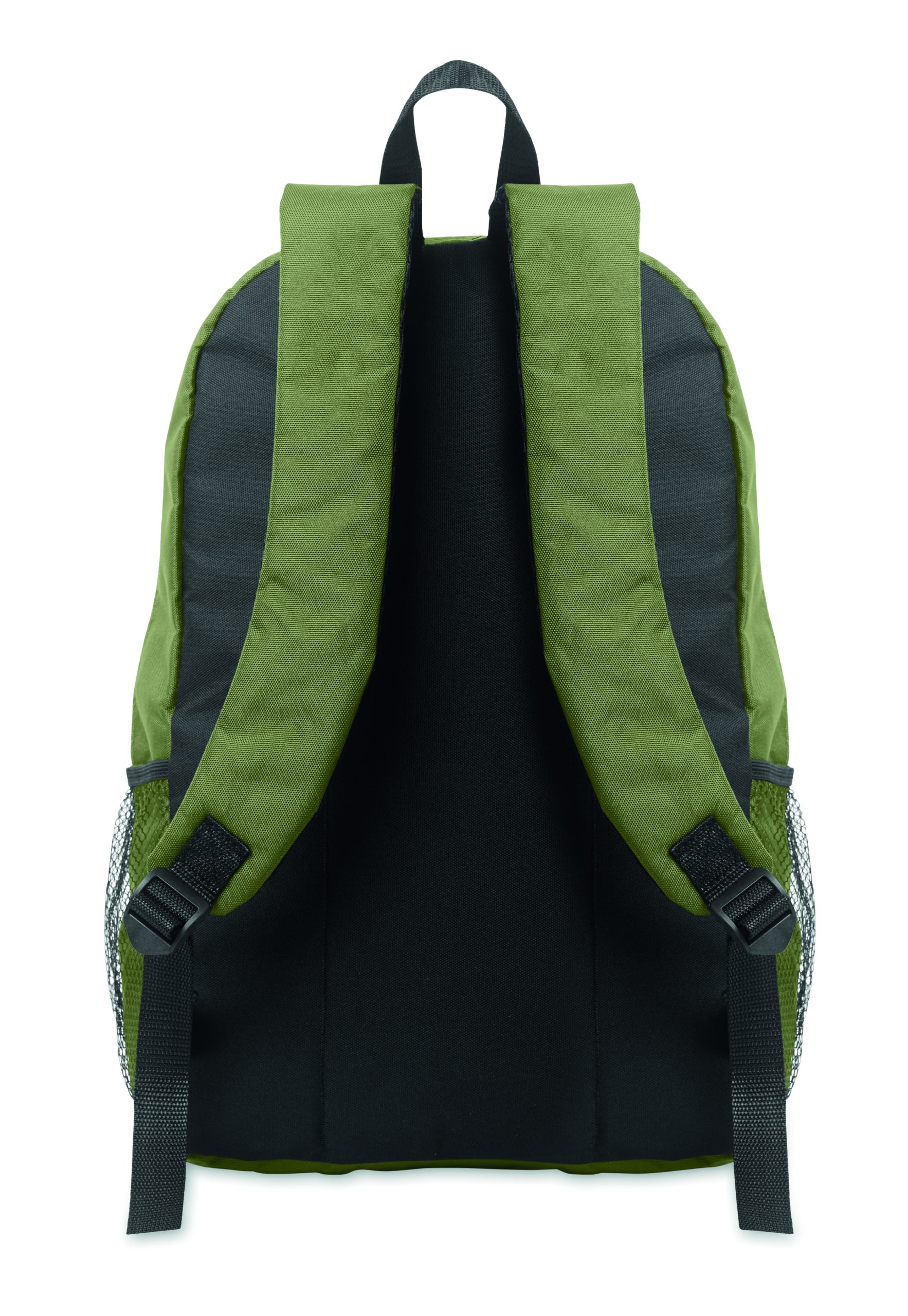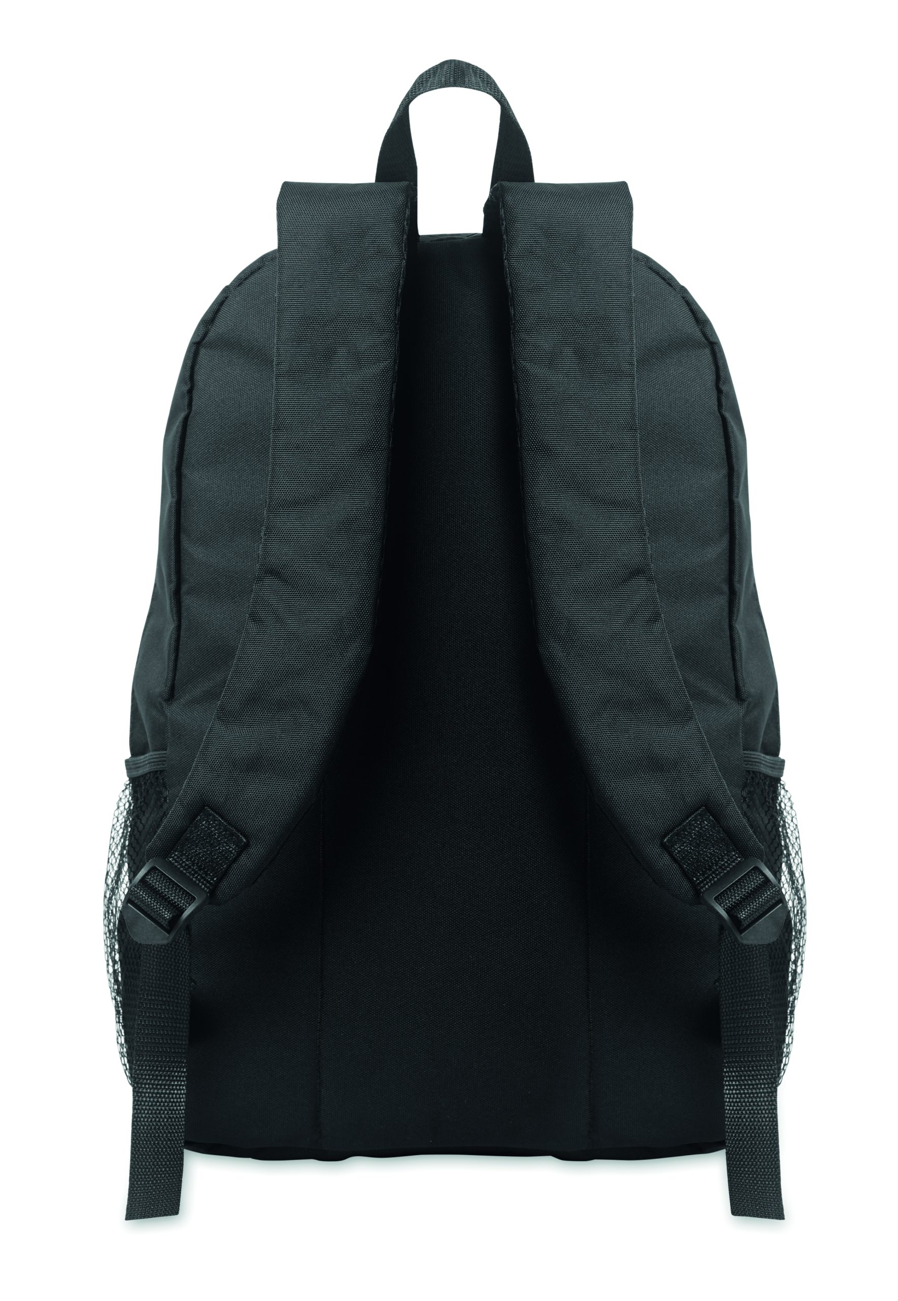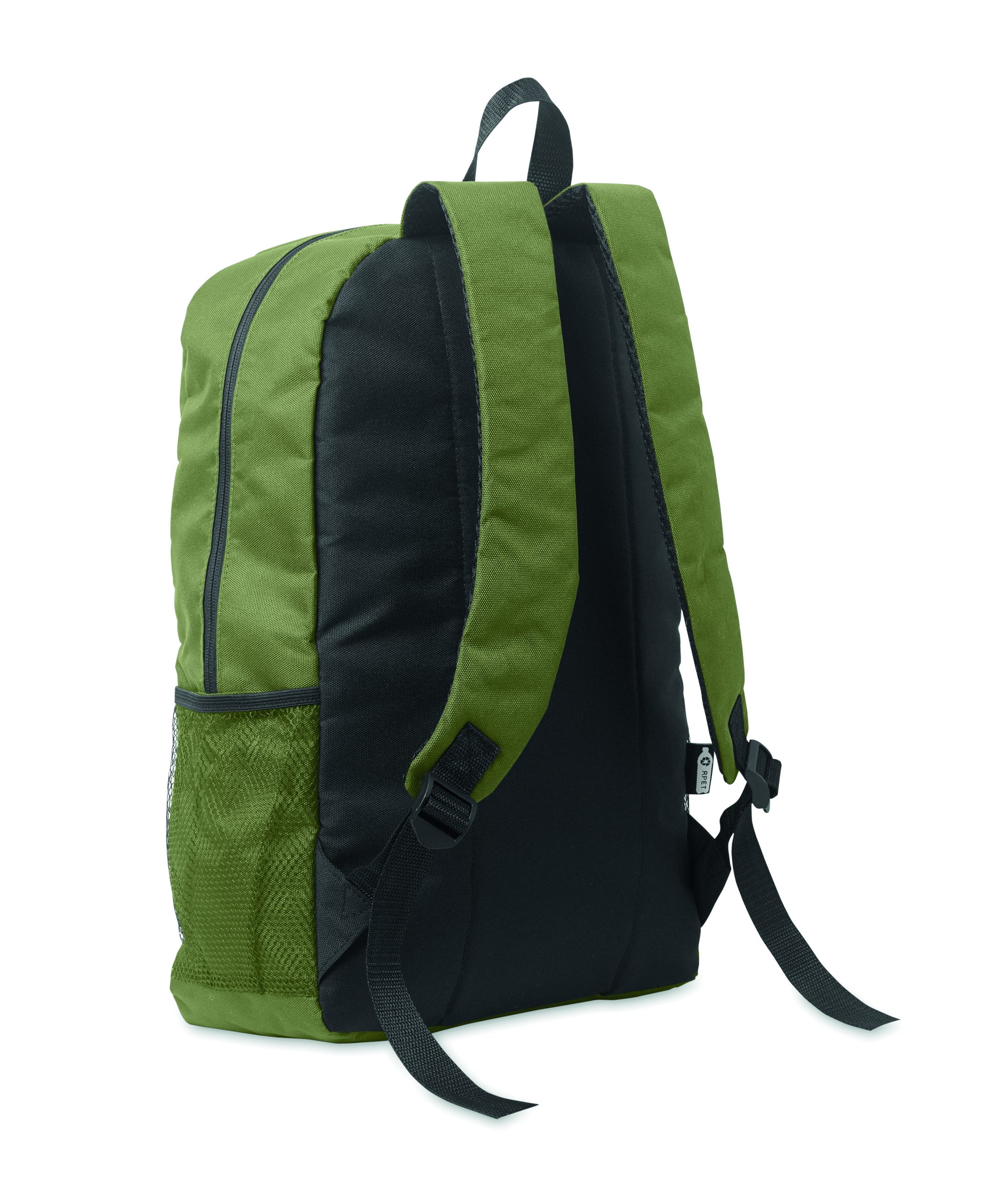 Plecak z poliestru 600D RPET z ozdobnym sznurkiem i przednią kieszenią zapinaną na zamek. Siateczkowe kieszenie po obu stronach.
