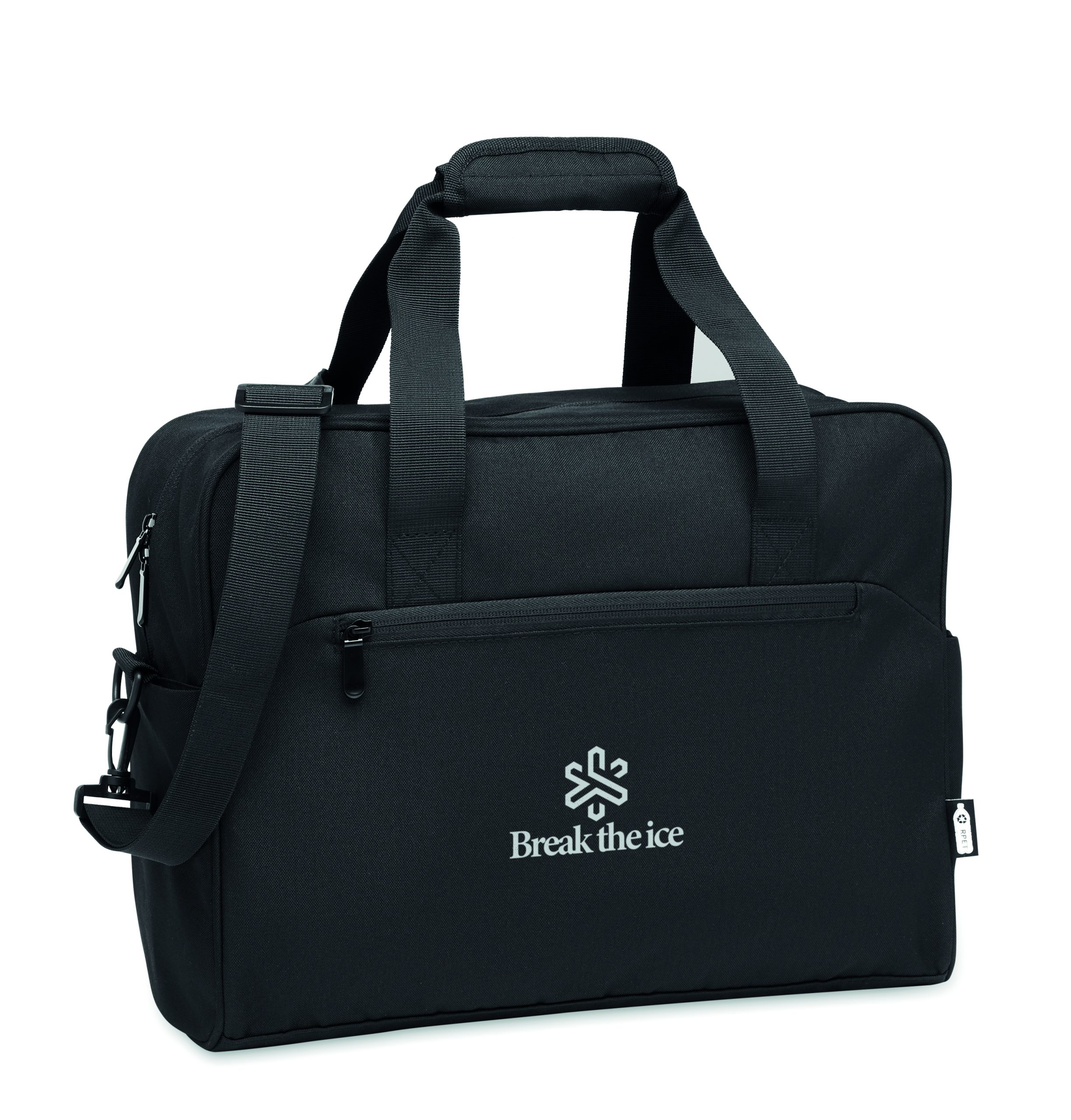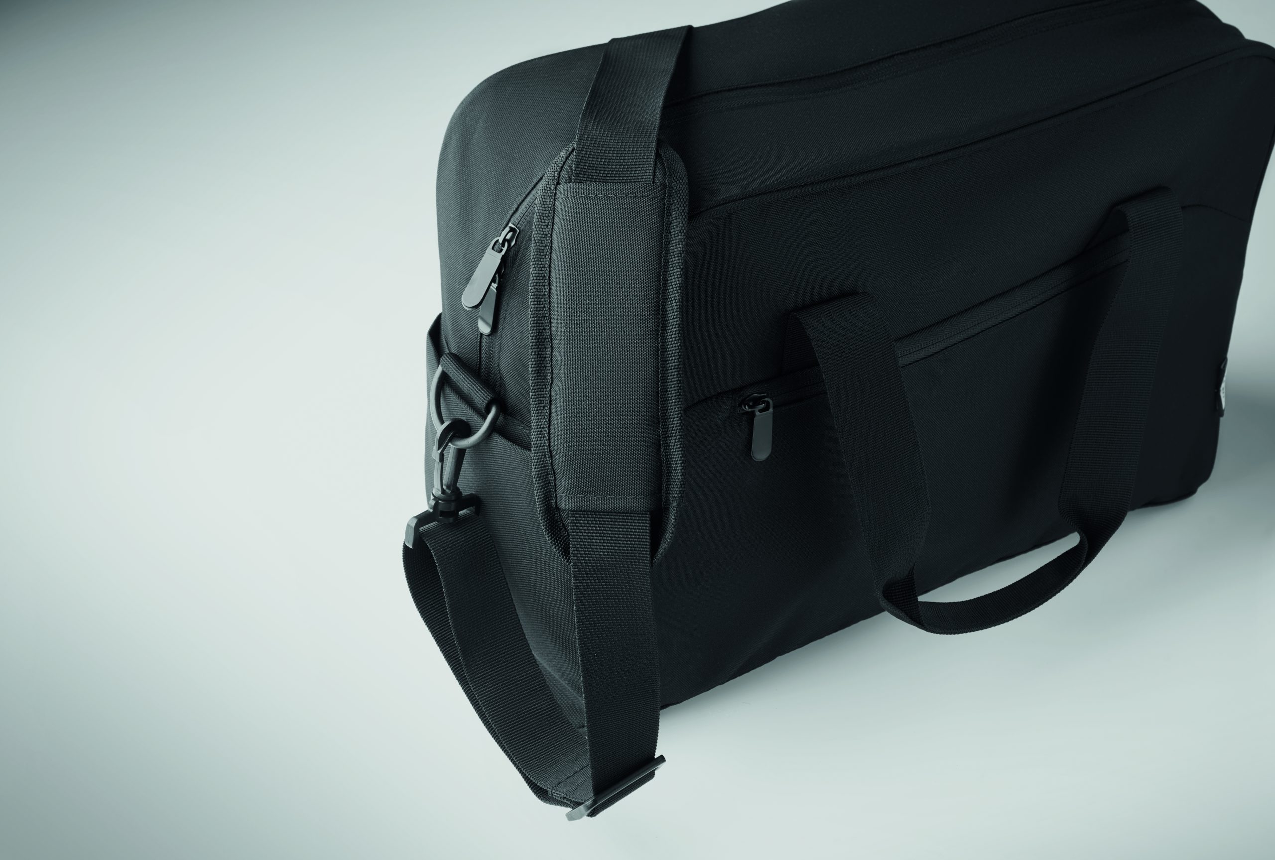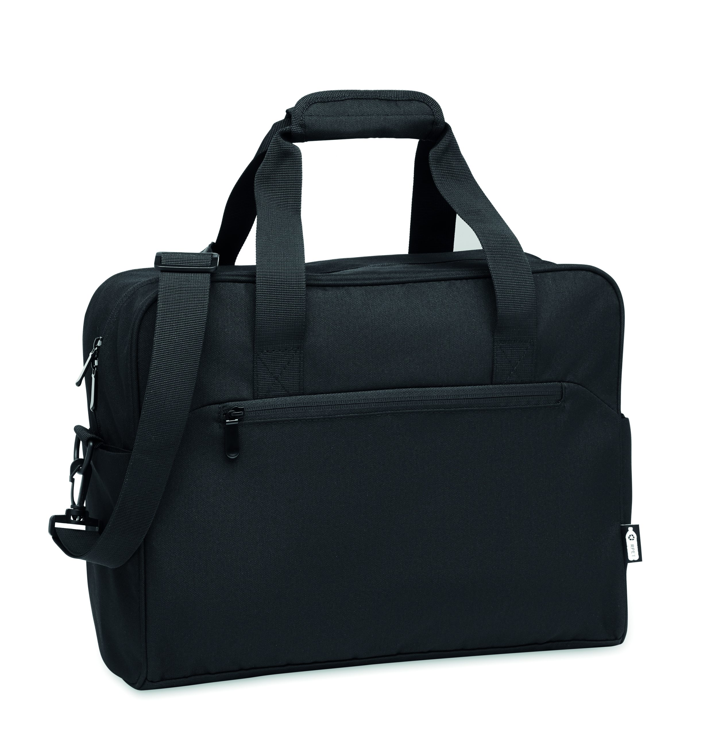 Torba podróżna z materiału 600D RPET z dużą przednią kieszenią zapinaną na zamek i dwiema małymi kieszeniami bocznymi. Zawiera przegrodę na laptopa 15 cali. Wyściełany, odpinany i regulowany pasek na ramię. Pasek do mocowania na walizce.