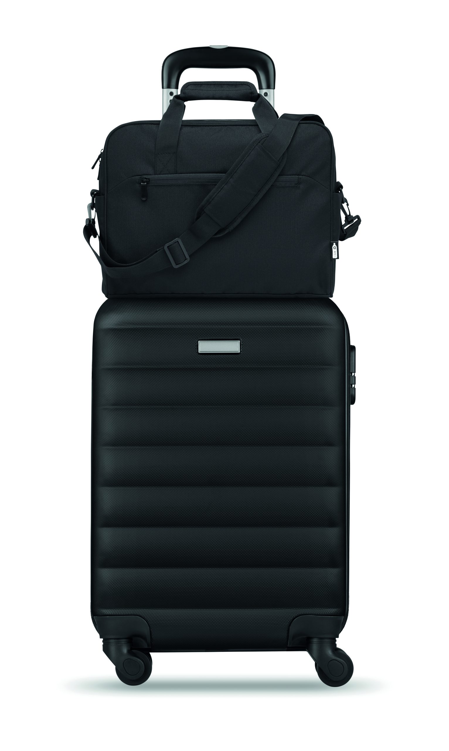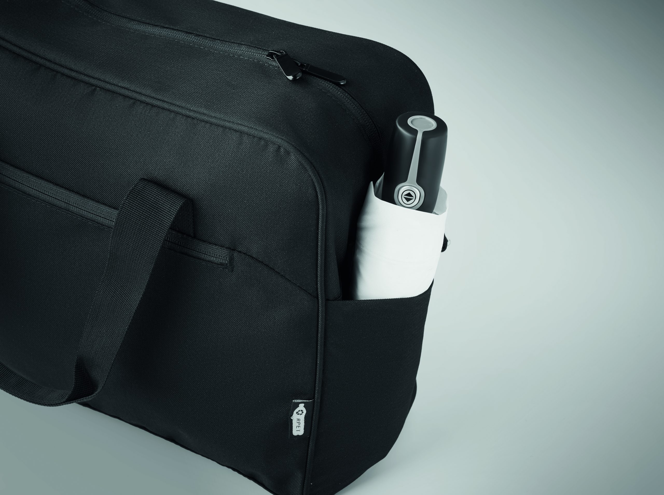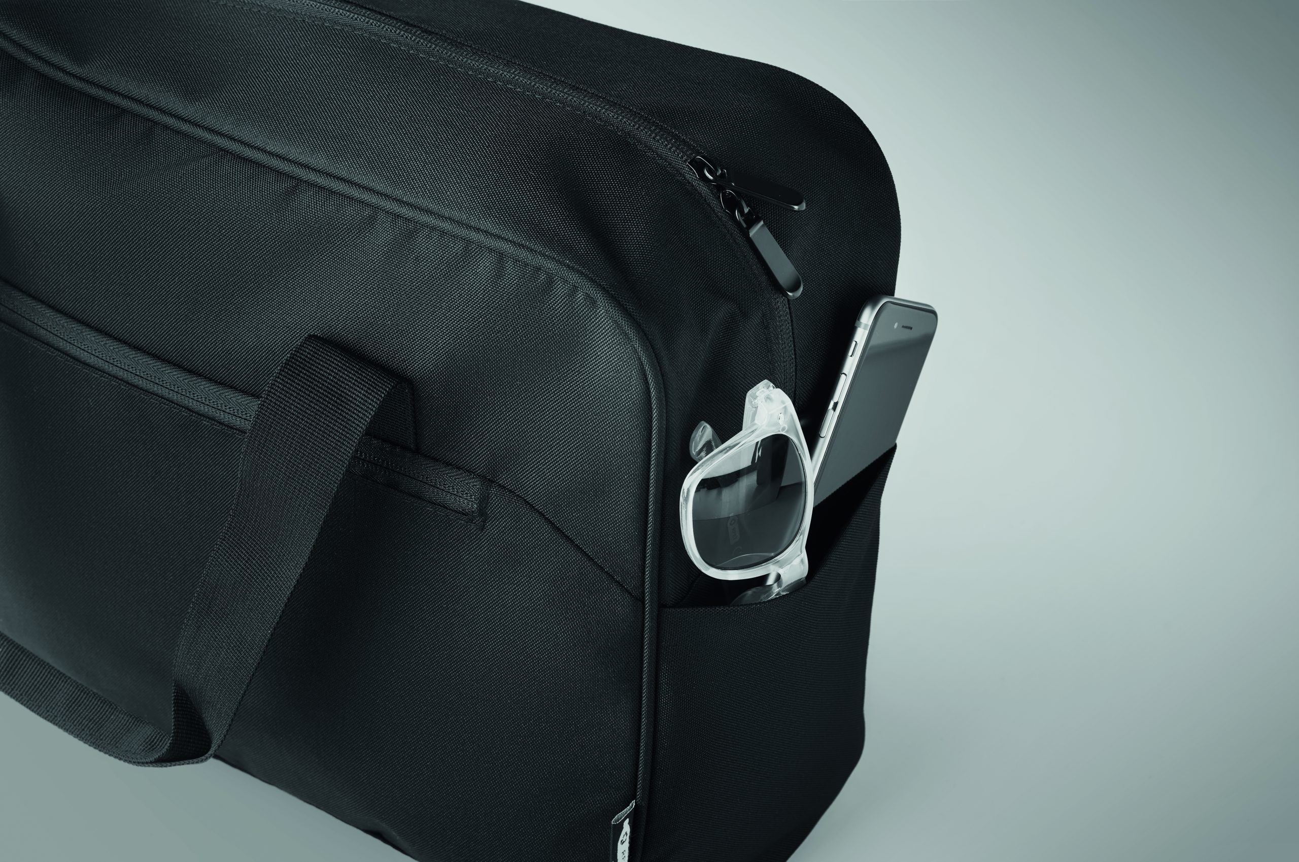 Torba podróżna z materiału 600D RPET z dużą przednią kieszenią zapinaną na zamek i dwiema małymi kieszeniami bocznymi. Zawiera przegrodę na laptopa 15 cali. Wyściełany, odpinany i regulowany pasek na ramię. Pasek do mocowania na walizce.
