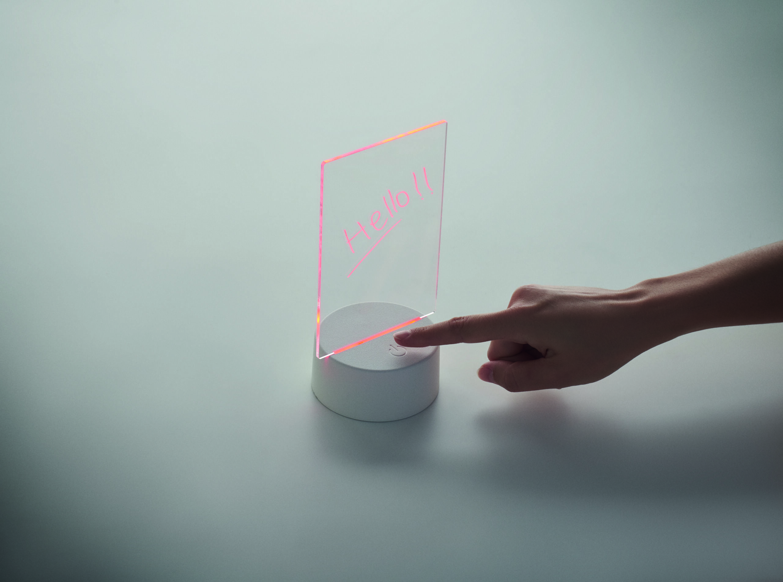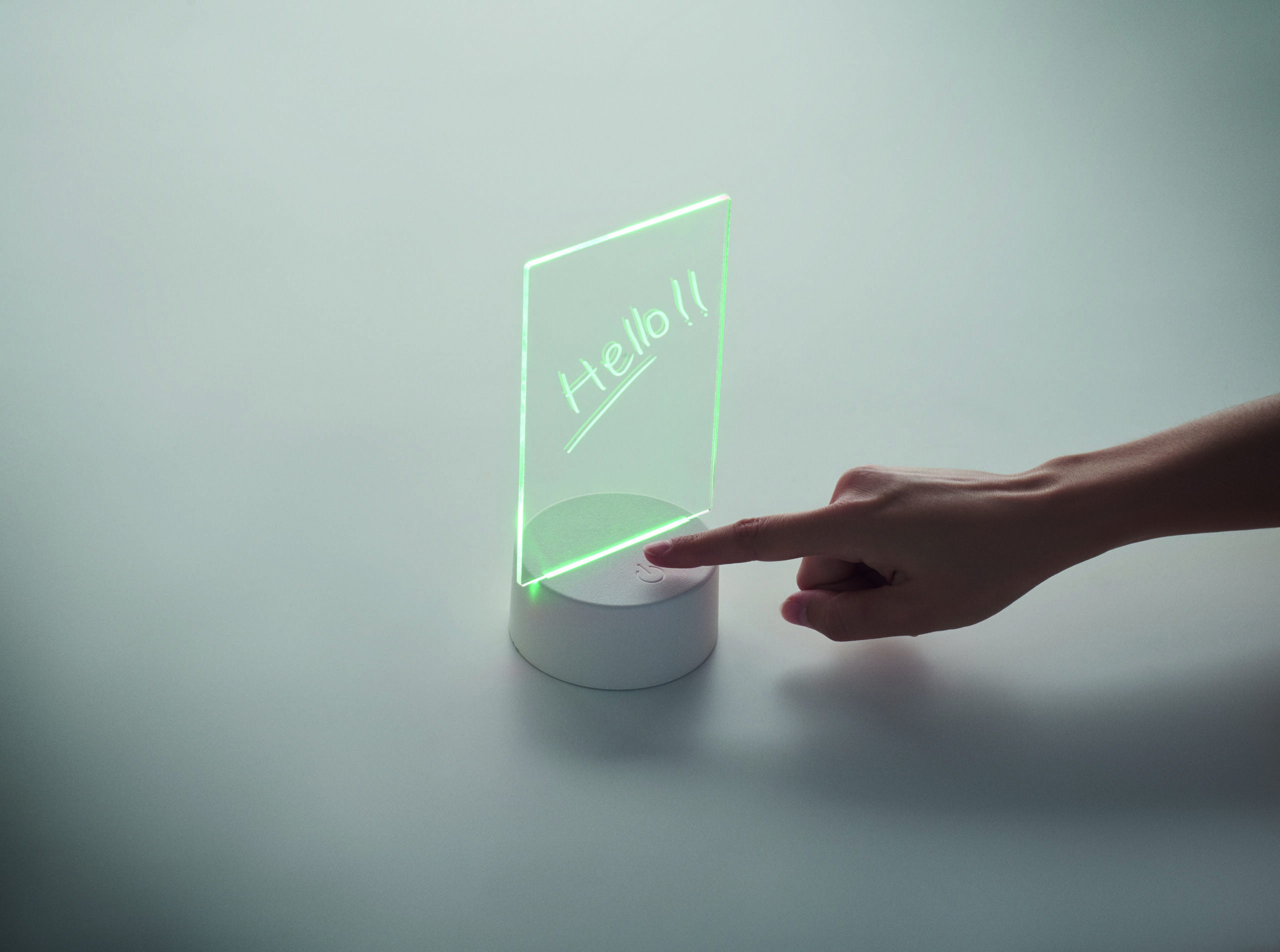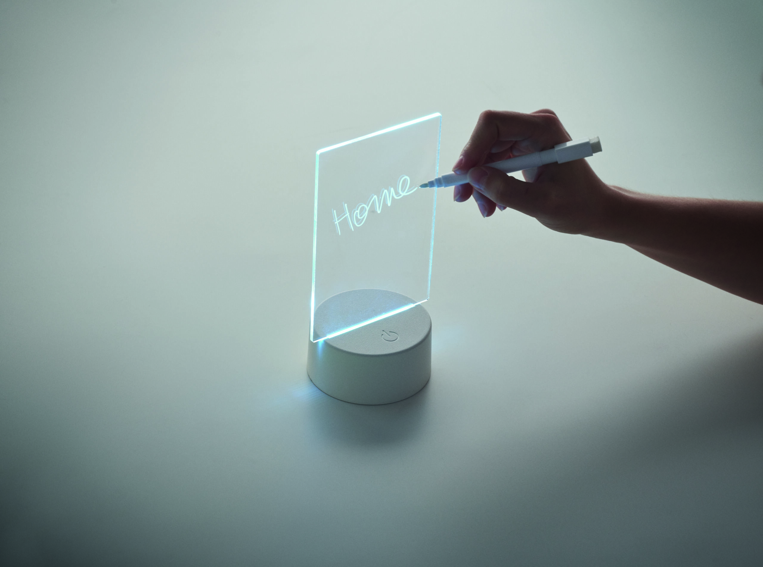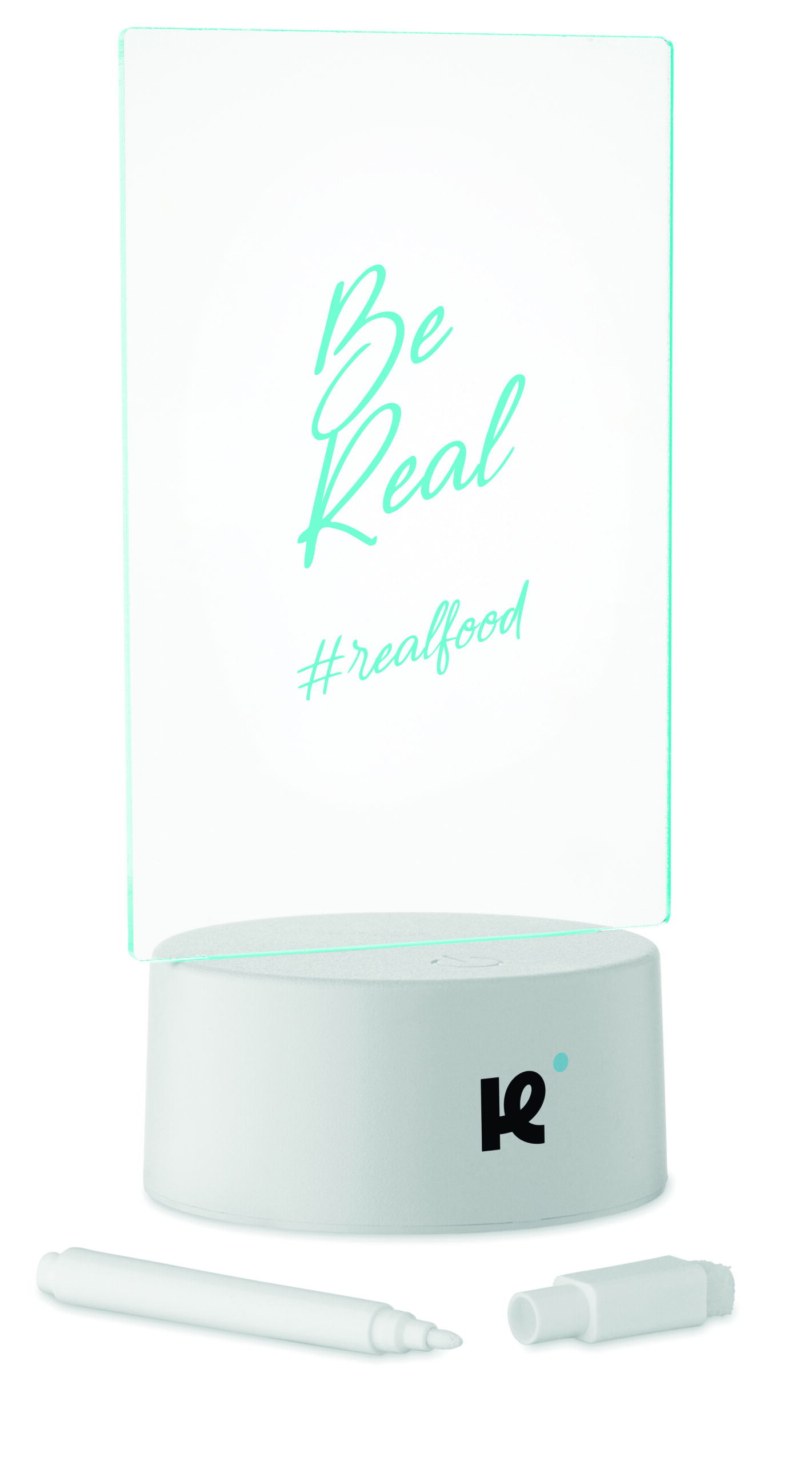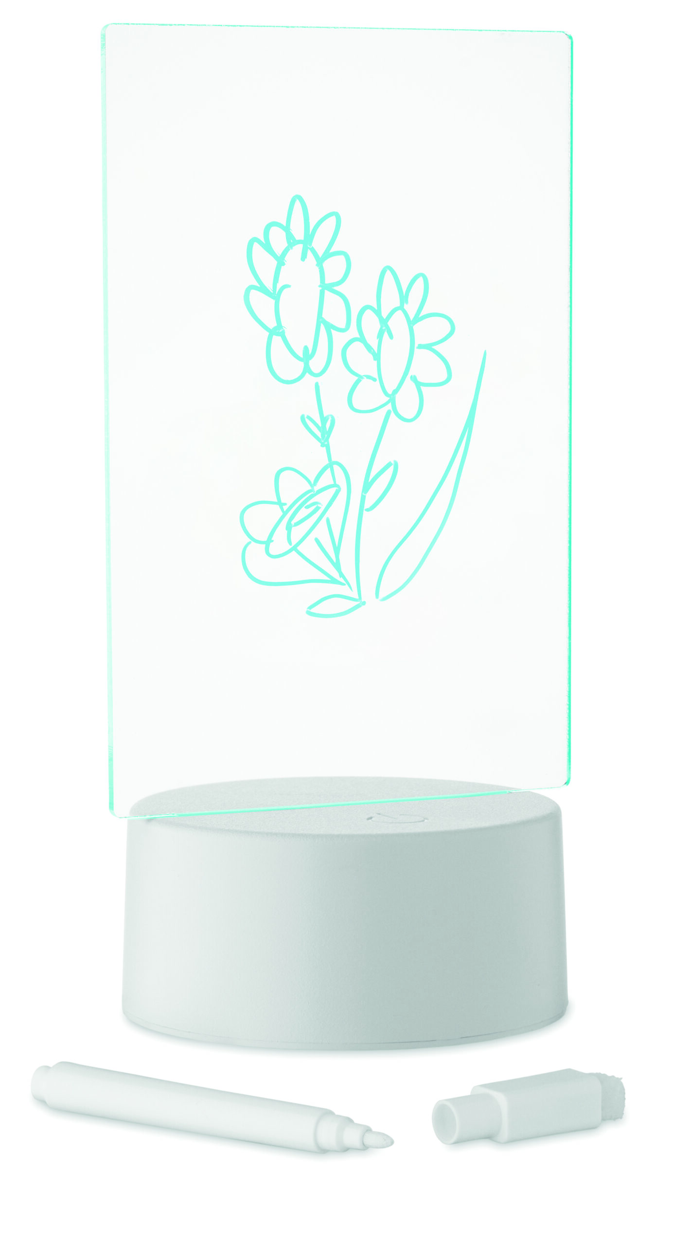 Podświetlana tablica LED ze zmieniającym kolor światłem i zmazywalnym białym markerem. Posiada akrylową tablicę i PS podstawę. Zasilana bateryjnie, wymaga 3 baterii AAA (brak w zestawie).