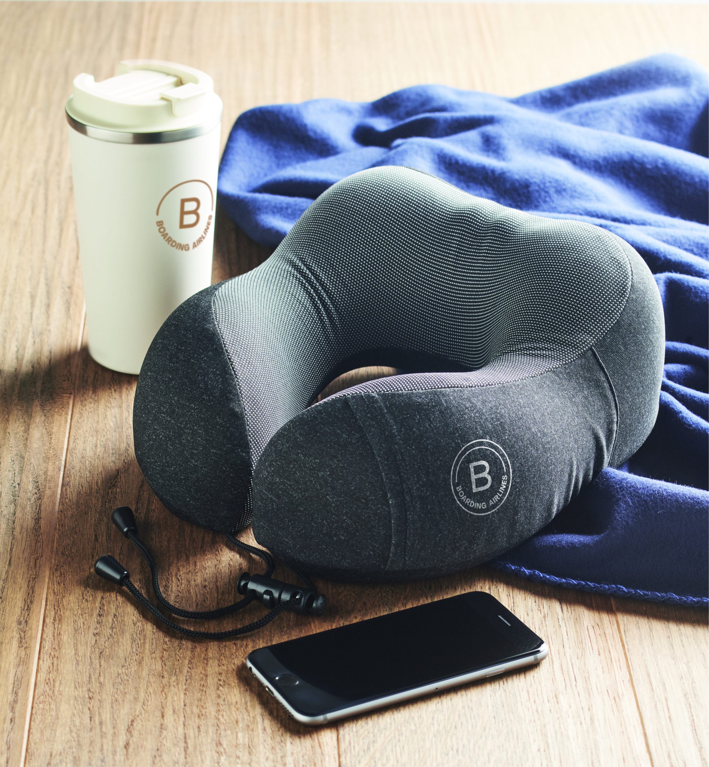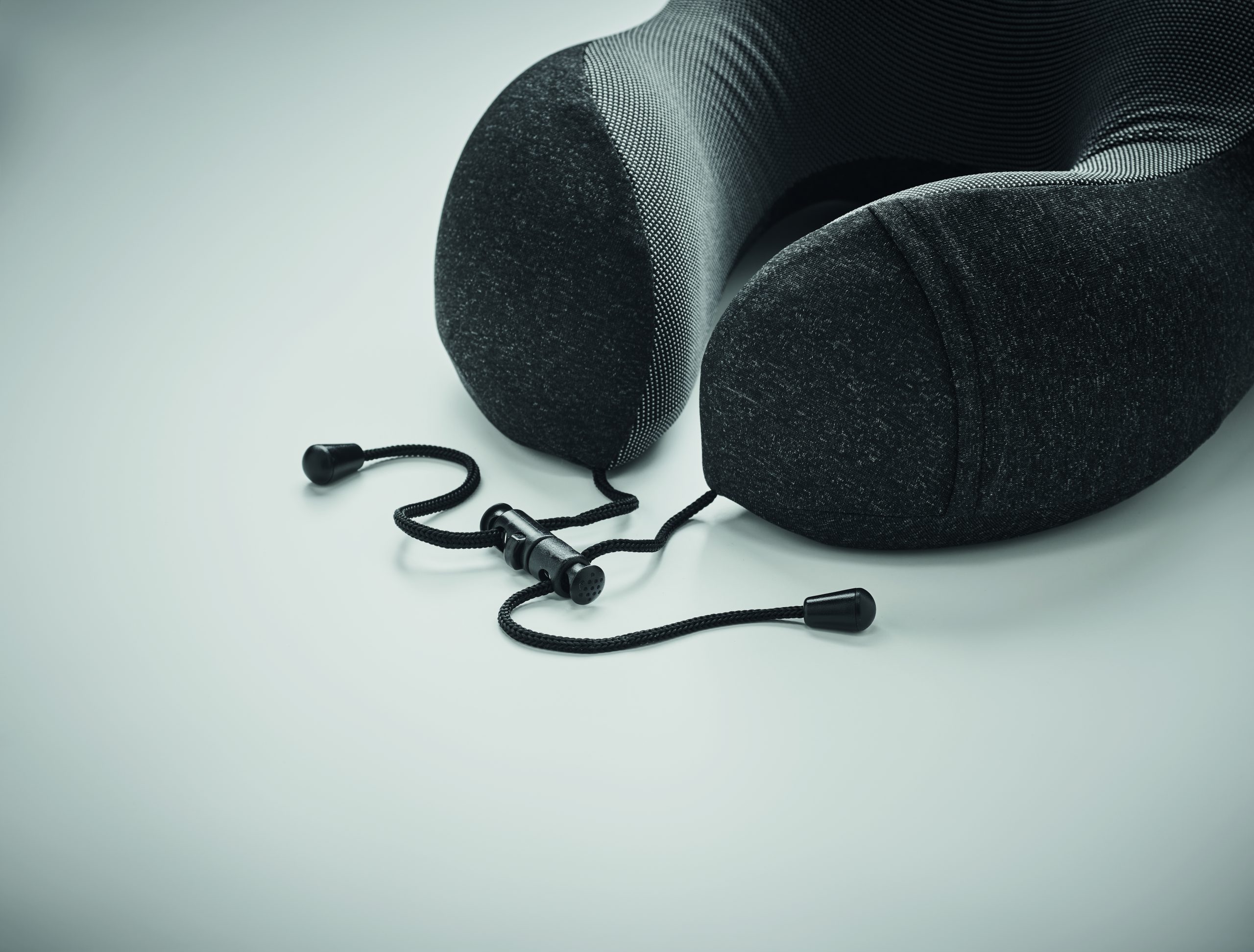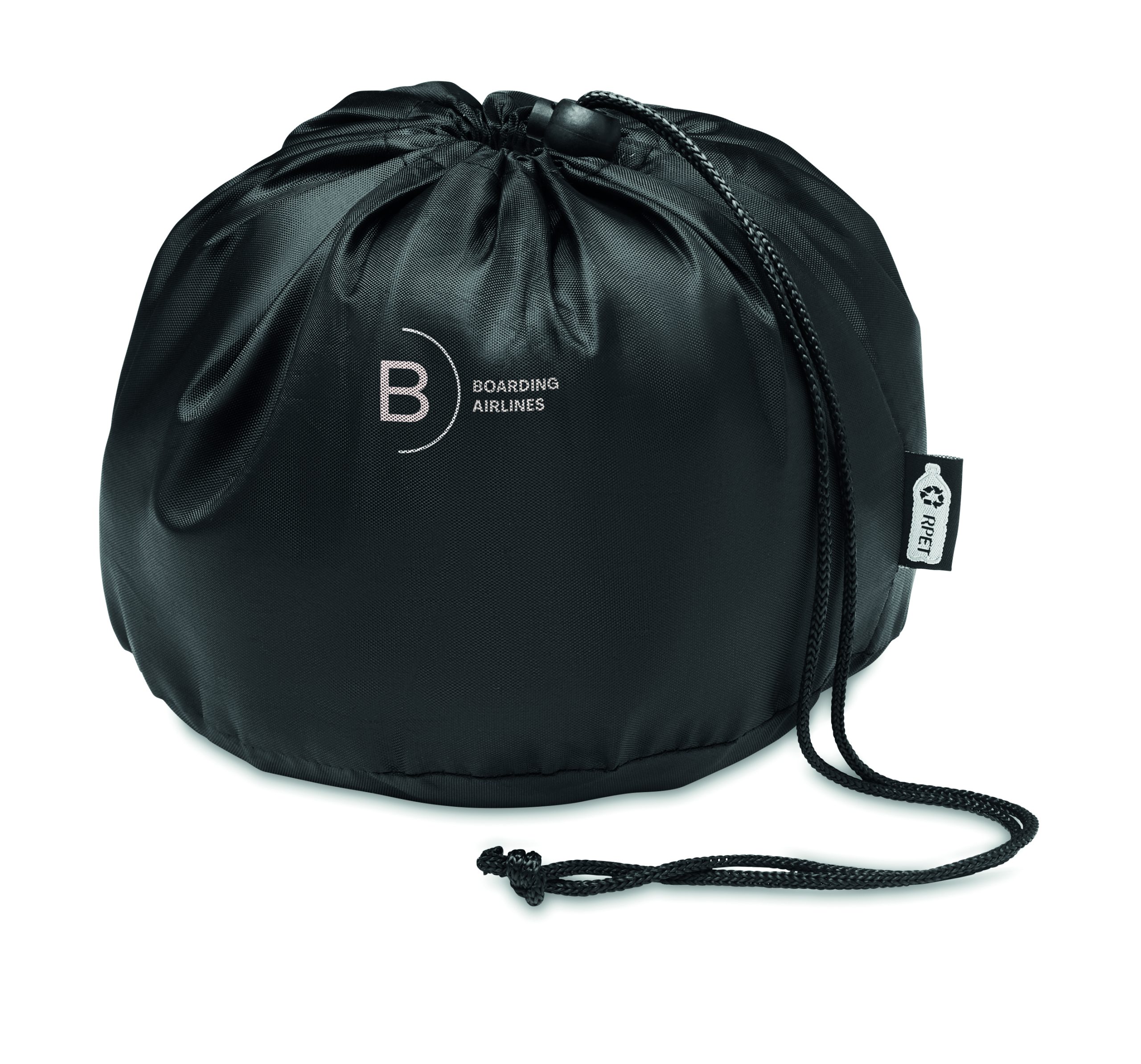 Poduszka podróżna z tkaniny kationowej. W komplecie z torbą z poliestru RPET ze sznurkiem. Często wykorzystywana w samochodzie, pociągu lub samolocie.