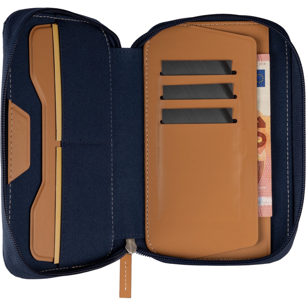 Portfel podróżny na dokumenty, paszport, prawo jazdy, dowód osobisty, zawiera uchwyt na telefon komórkowy, wiele przegródek, mała przednia kieszeń, z ochroną RFID, która zwiększa bezpieczeństwo danych, produkt wykonany z RPET