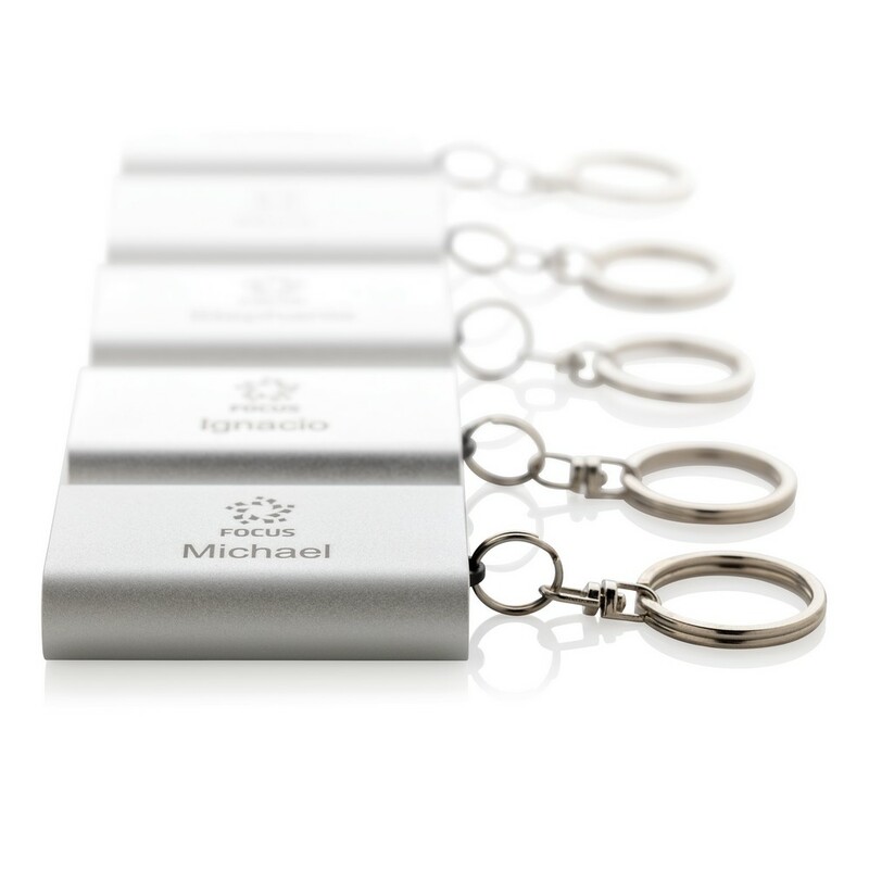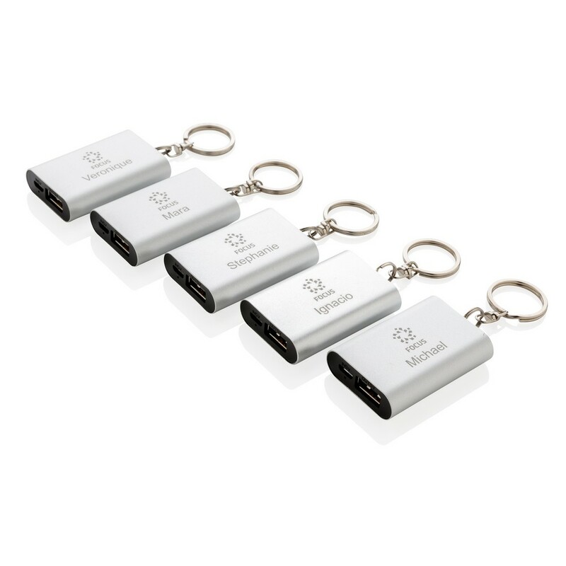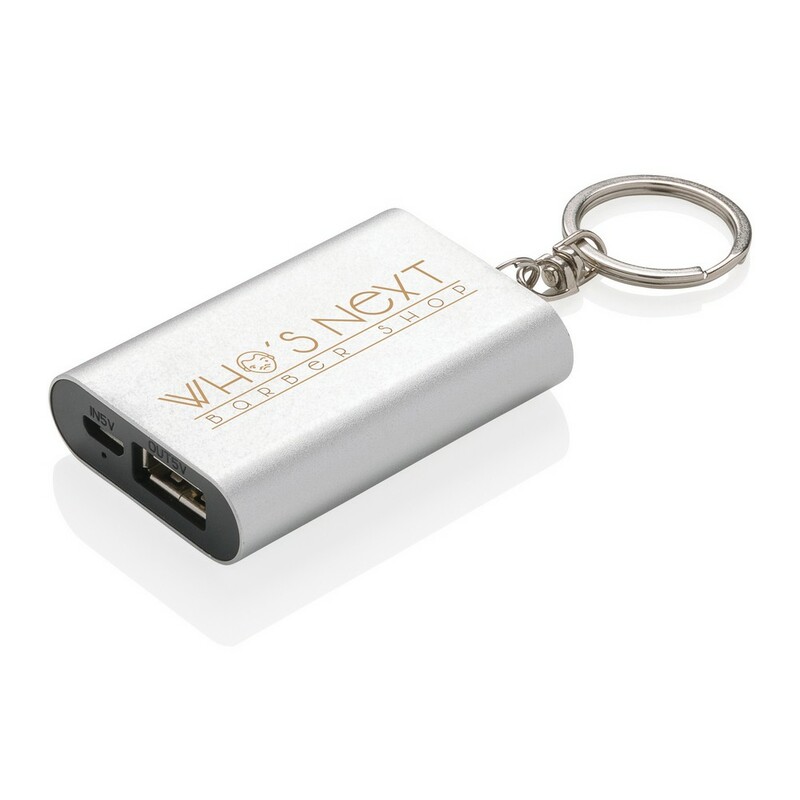Kompaktowy power bank 1000 mAh, brelok do kluczy, lekka aluminiowa obudowa, wbudowany akumulator litowy pozwala na naładowanie telefonu do 50%, wyjście USB 5V/1A, wejście 5V/1A, kabel micro USB w komplecie, ślad węglowy produktu: 0,77 kg CO2