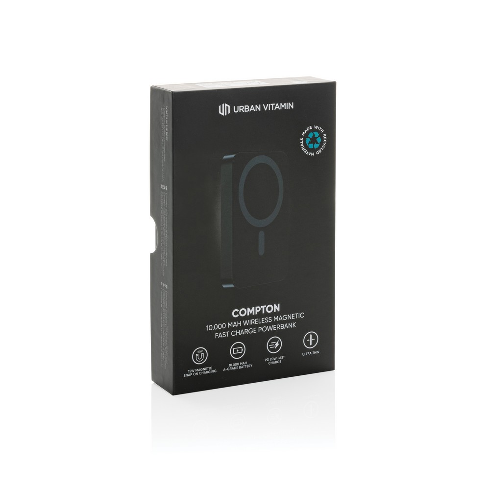 Power bank 10000 mAh, magnetyczna ładowarka bezprzewodowa 15W, szybkie ładowanie przewodowe 20W, wykonany z aluminium i ABS z recyklingu z certyfikatem RCS, wyjście USB typu C, ślad węglowy produktu: 4,13 kg CO2