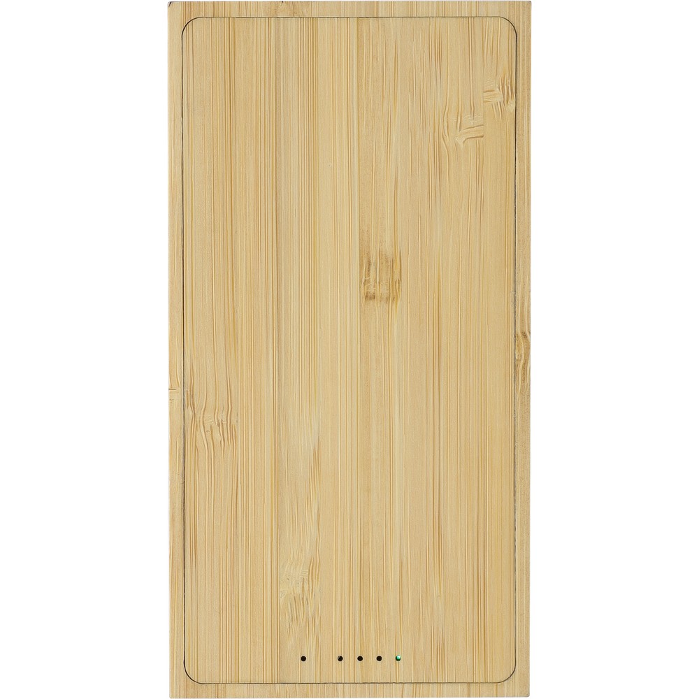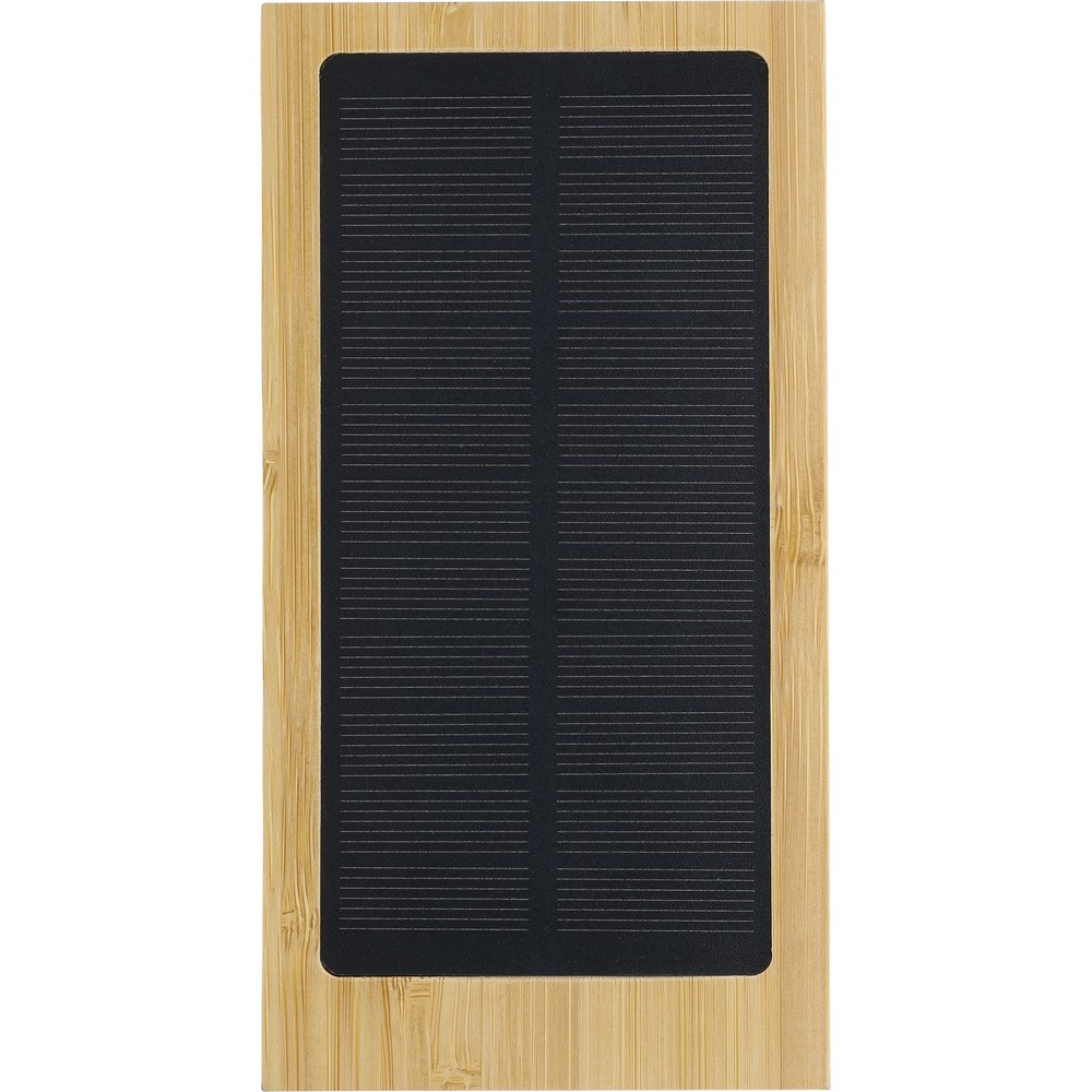 Power bank 10000 mAh, ładowarka słoneczna, podwójne porty USB-A i USB-C, ładowanie bezprzewodowe, diody wskazujące poziom naładowania, panel solarny, biały kabel USB 30 cm w komplecie, zapakowany w brązowe kartonowe pudełko, produkt wykonany z bambusa