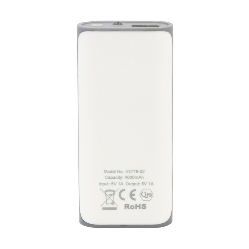 Power bank 4000 mAh, wyjście 5V/1A, wejście 5V/1A, 4 diody wskazujące poziom naładowania, lampka LED, w komplecie kabel micro USB