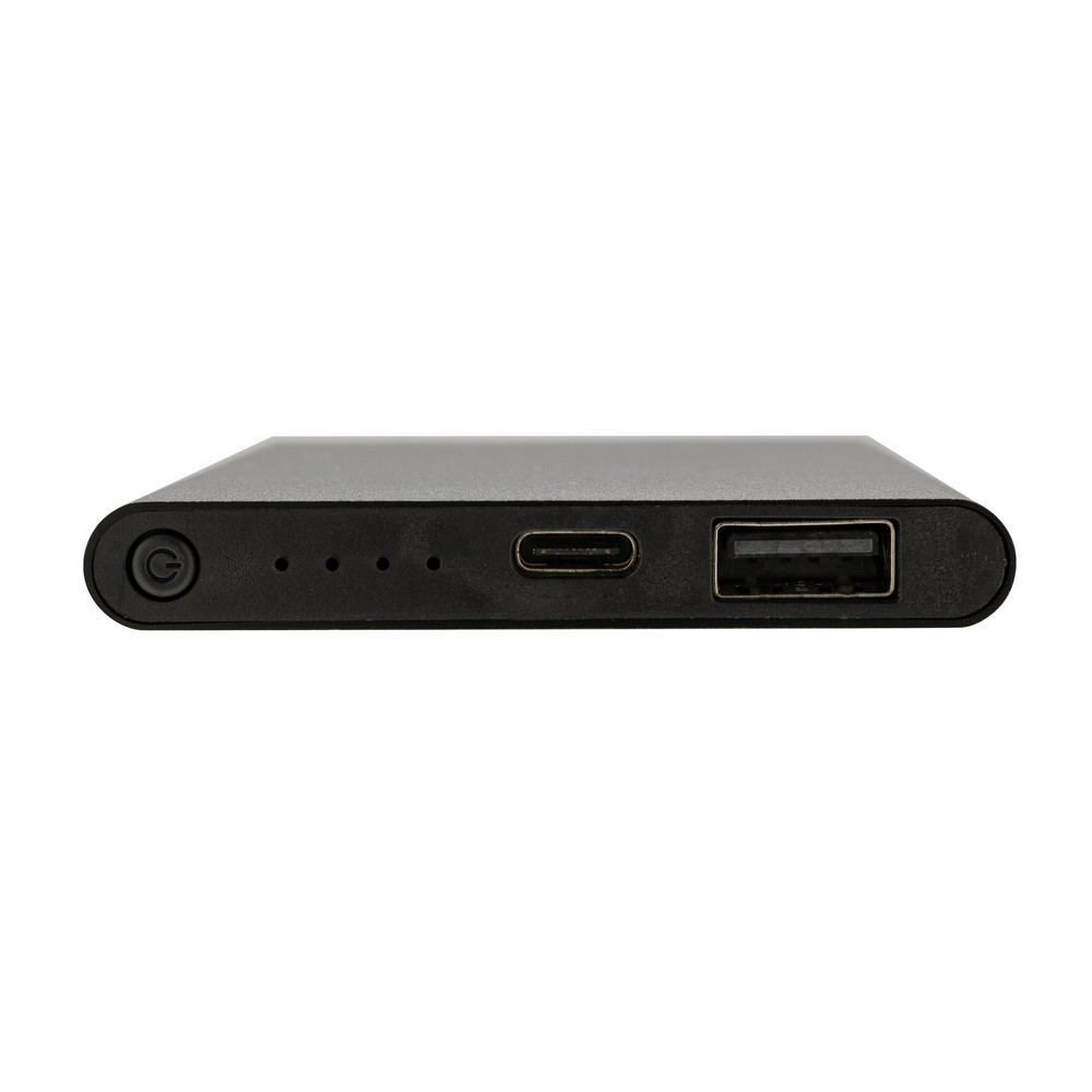Power bank 4000 mAh, wskaźniki poziomu naładowania, wbudowany akumulator litowo-polimerowy klasy A, wykonany z aluminium i ABS z recyklingu, całkowita zawartość materiałów obliczona na podstawie wagi całkowitej przedmiotu: 66%, wejście USB typu C 5V/2A, wyjście USB typu C 5V/2A, wyjście USB 5V/2A, kabel z TPE z recyklingu z certyfikatem RCS w komplecie, w pudełku z papieru z certyfikatem FSC® mix, ślad węglowy produktu: 1,83 kg CO2