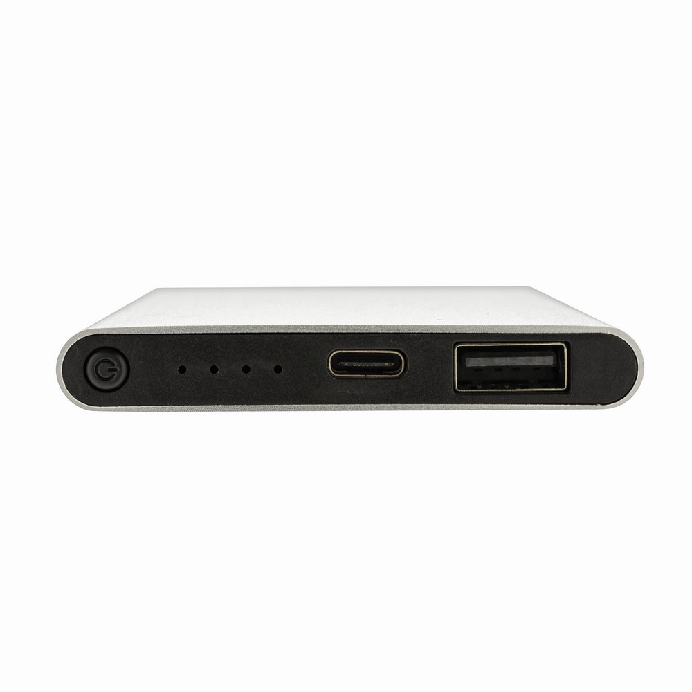 Power bank 4000 mAh, wskaźniki poziomu naładowania, wbudowany akumulator litowo-polimerowy klasy A, wykonany z aluminium i ABS z recyklingu, całkowita zawartość materiałów obliczona na podstawie wagi całkowitej przedmiotu: 66%, wejście USB typu C 5V/2A, wyjście USB typu C 5V/2A, wyjście USB 5V/2A, kabel z TPE z recyklingu z certyfikatem RCS w komplecie, w pudełku z papieru z certyfikatem FSC® mix, ślad węglowy produktu: 1,83 kg CO2