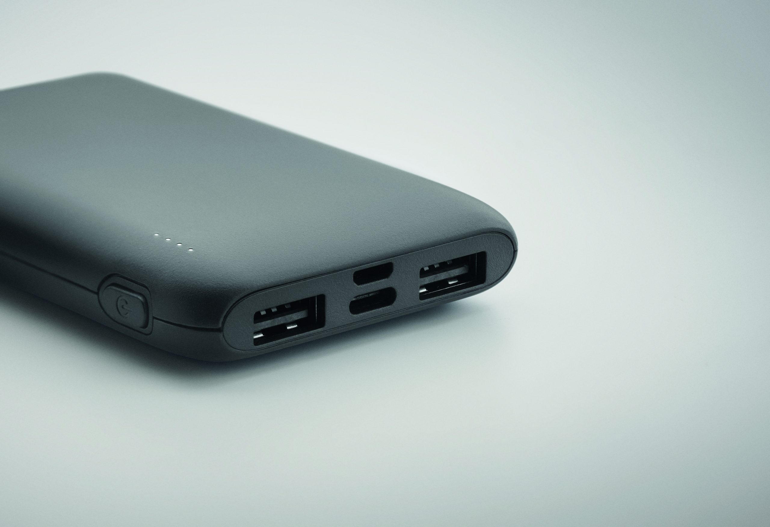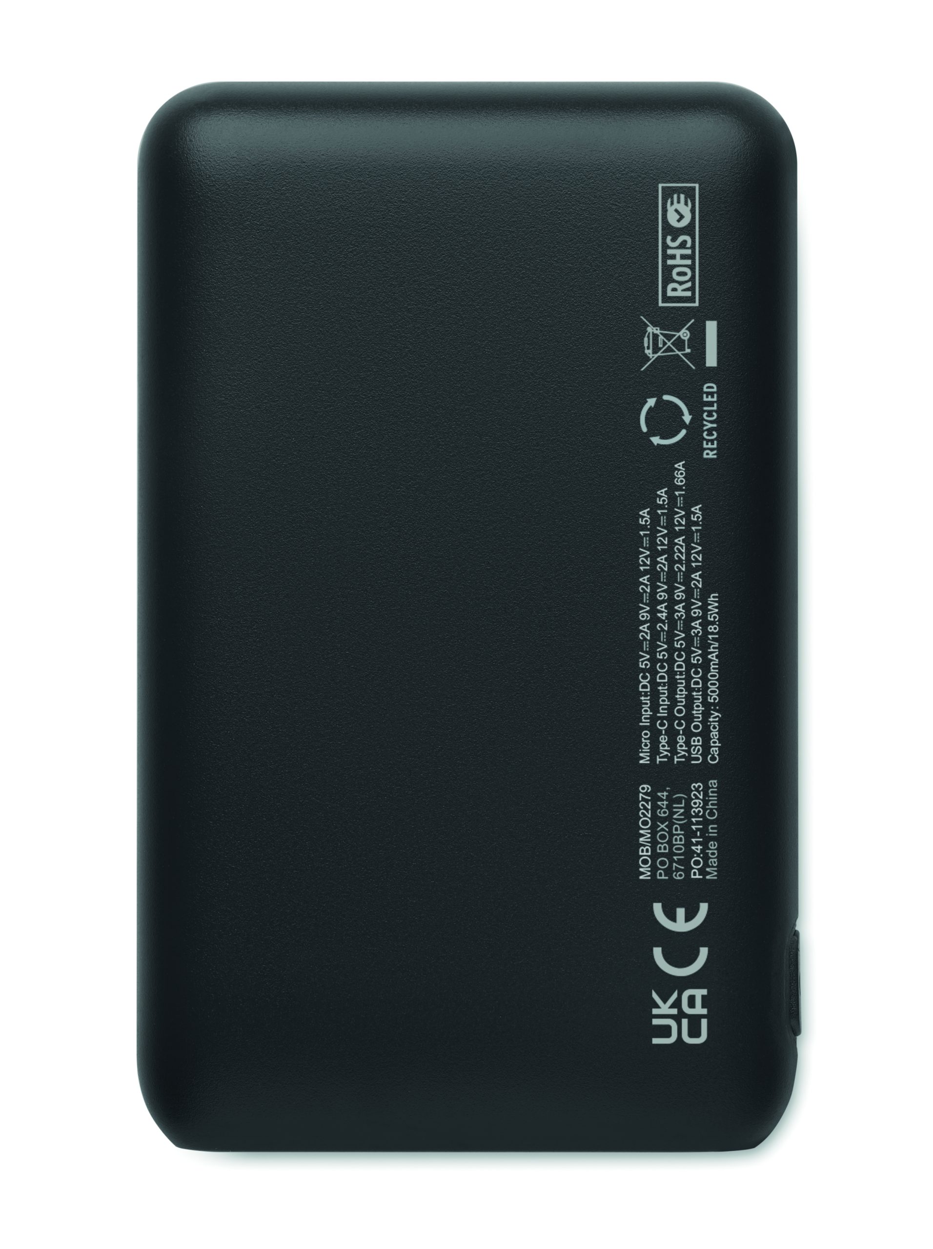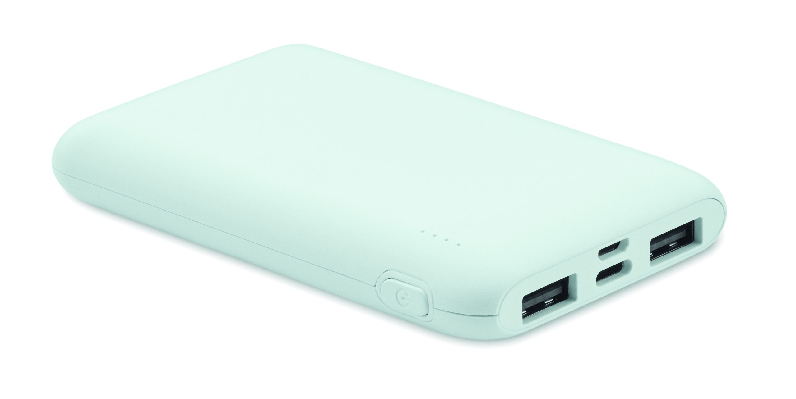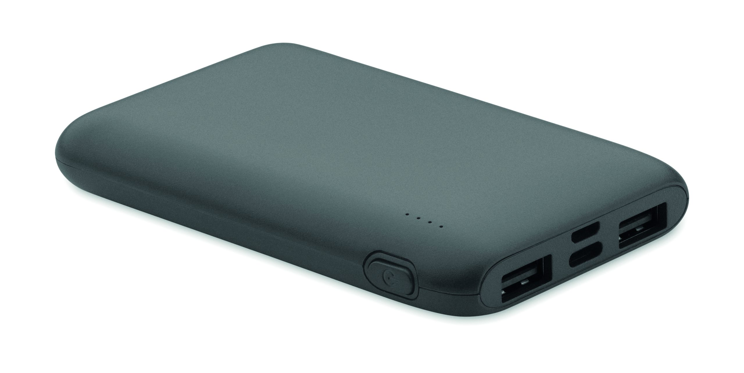 Power bank 5000 mAh z ABS pochodzącego z recyklingu. Pojemność dla smartfonów, Wyjście: 1 x Typ-C, 2 x Typ-A i 1 x Typ-B. Wejście: 2 w 1 typu C i typu A.