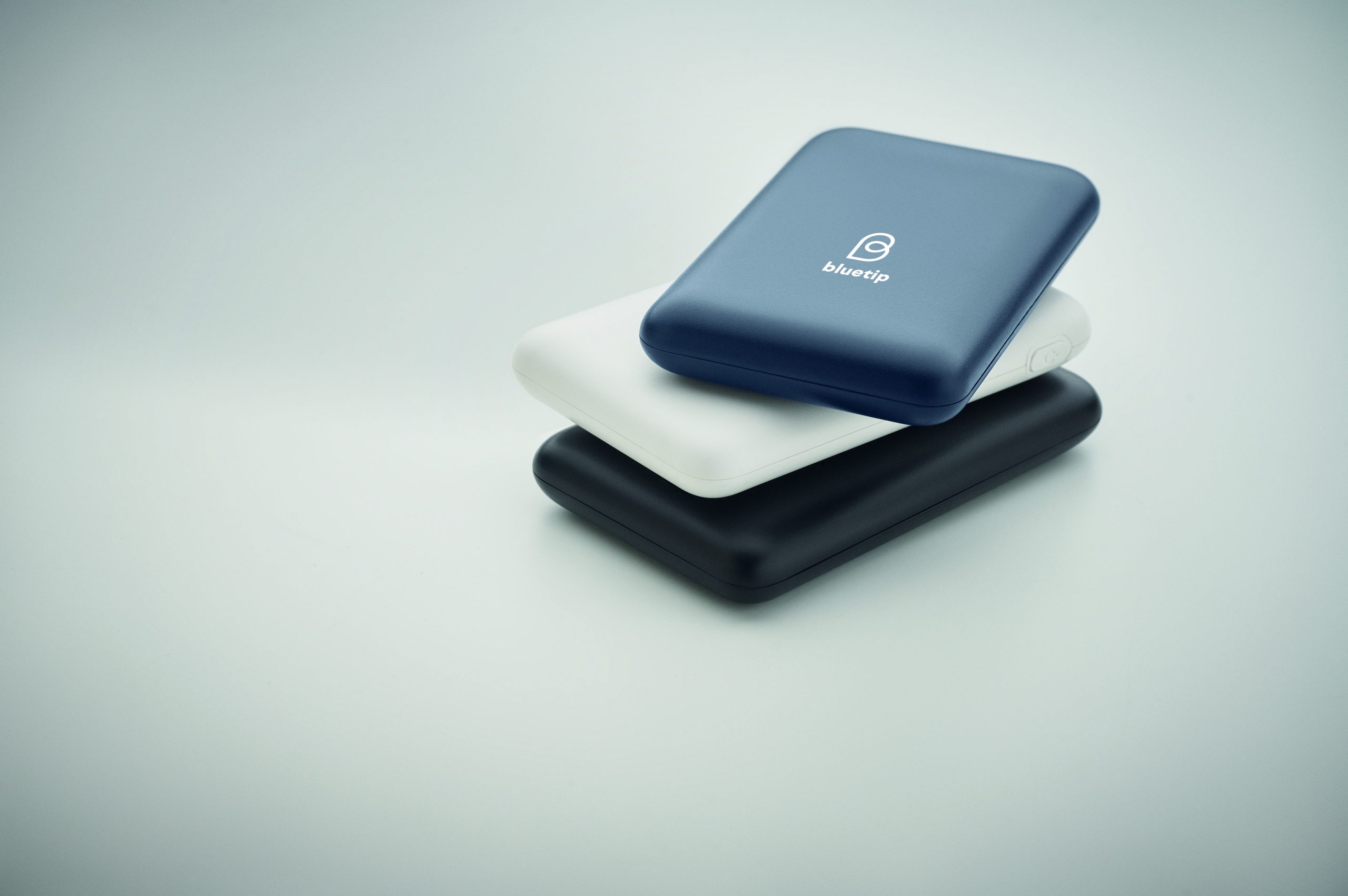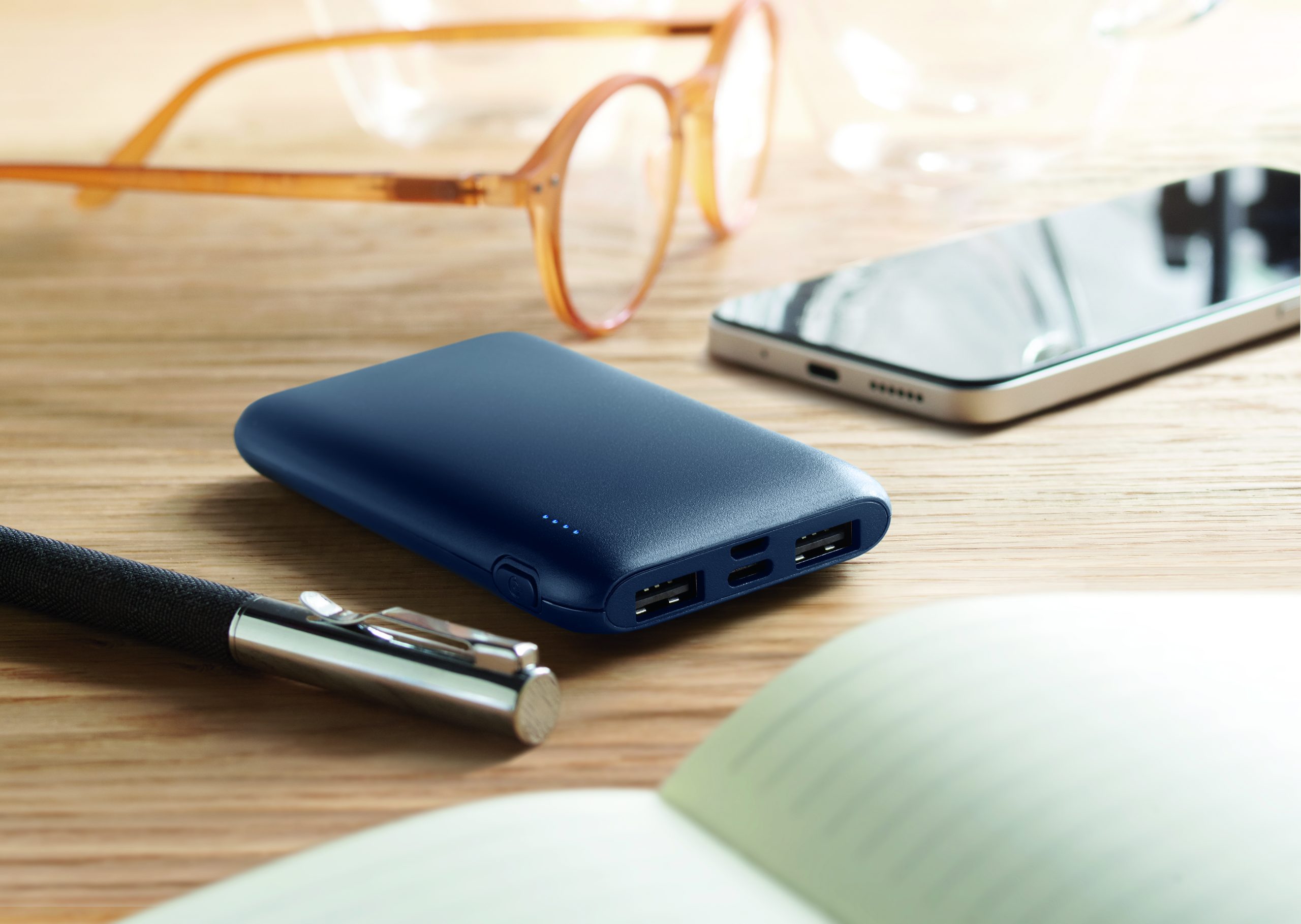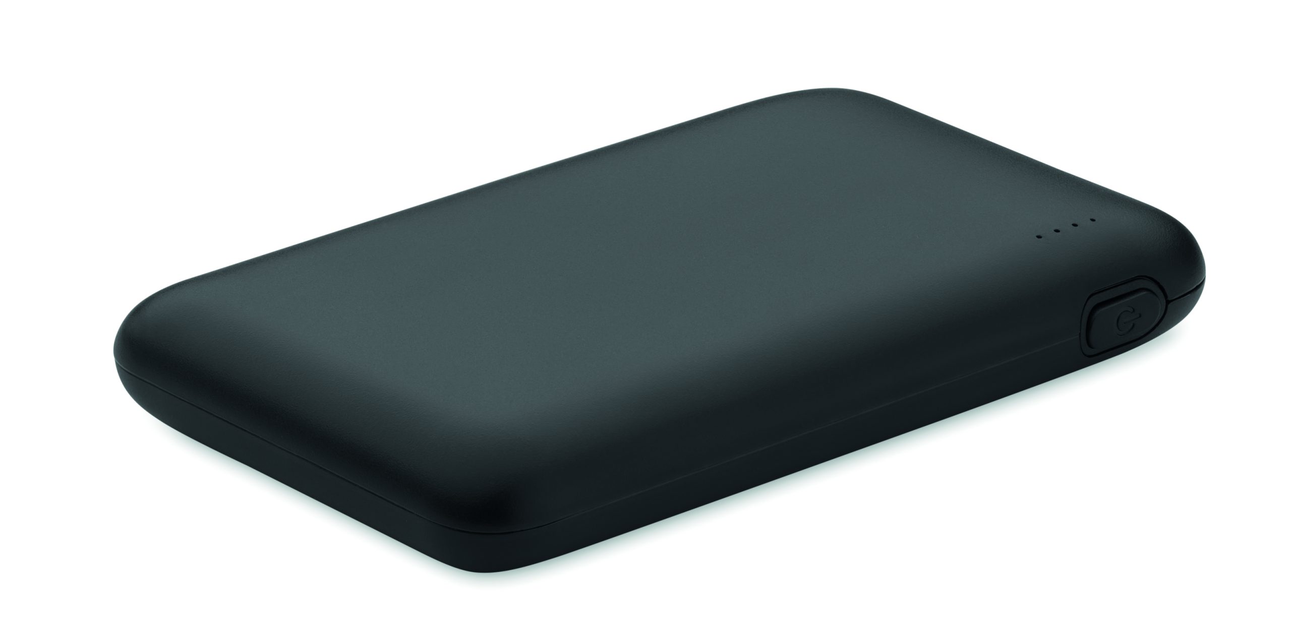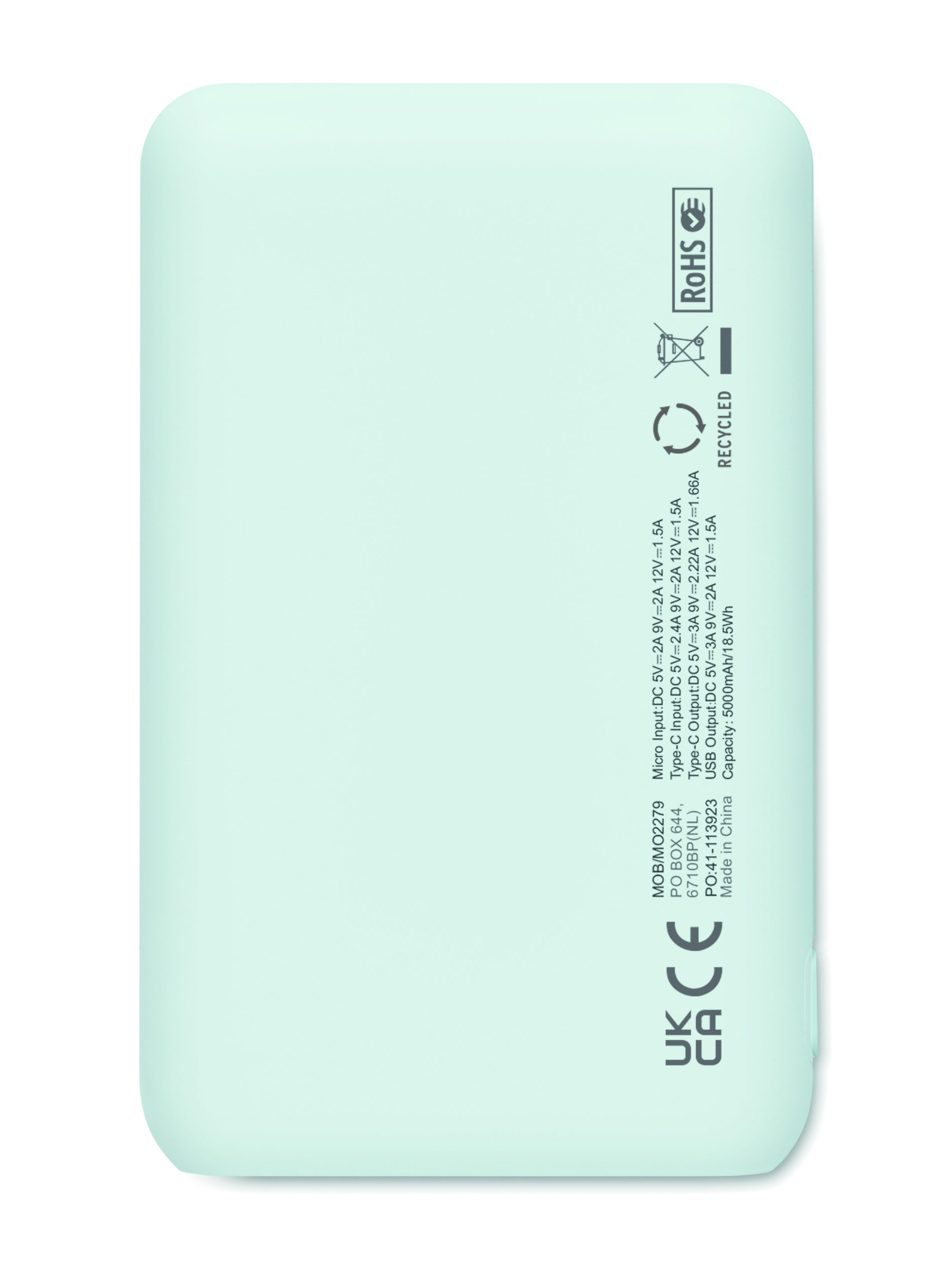 Power bank 5000 mAh z ABS pochodzącego z recyklingu. Pojemność dla smartfonów, Wyjście: 1 x Typ-C, 2 x Typ-A i 1 x Typ-B. Wejście: 2 w 1 typu C i typu A.