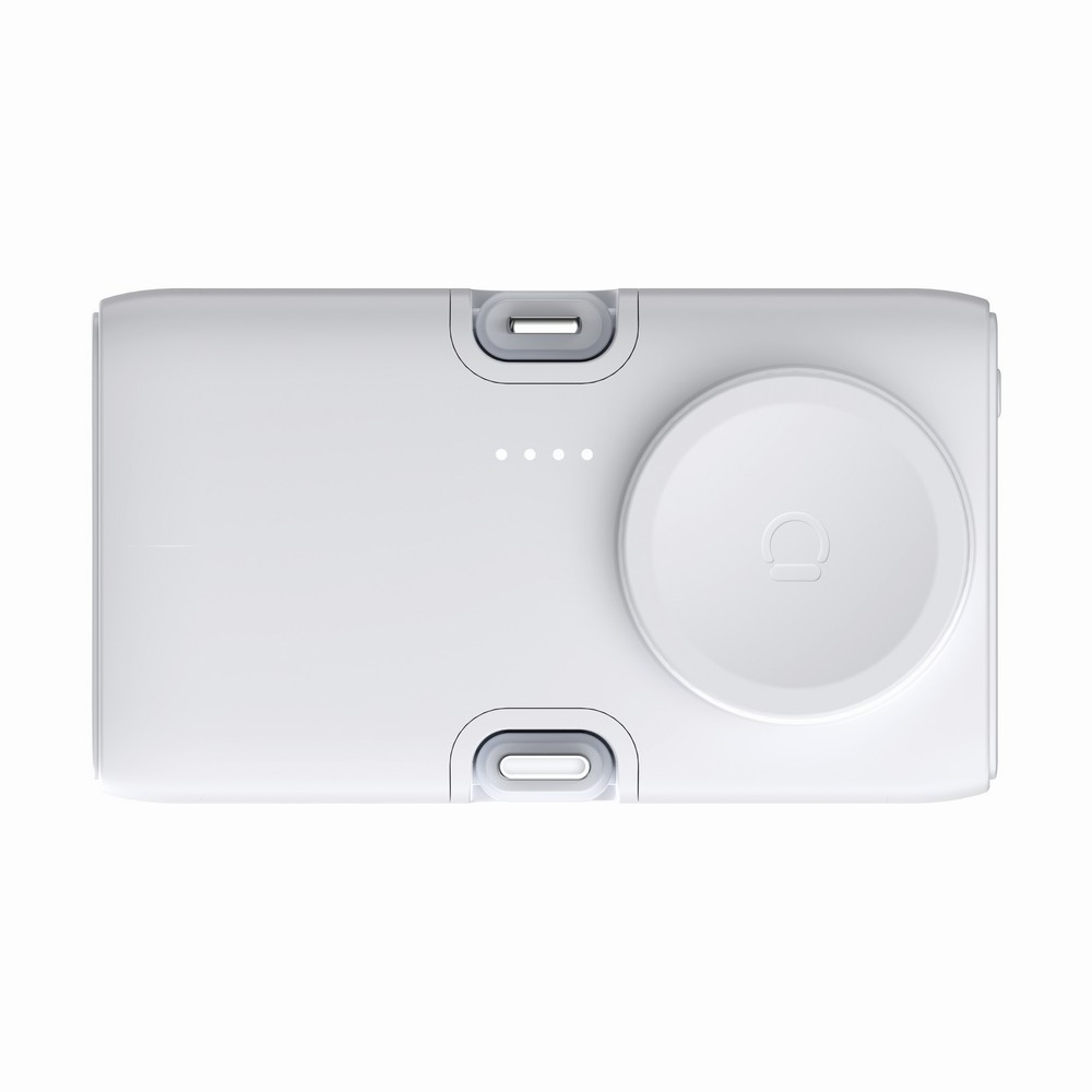 Power bank 5000 mAh, zintegrowana ładowarka bezprzewodowa do zegarka (tylko iOS), szybkie ładowanie do 20W, zintegrowane wyjścia USB-C i iOS, stojak na telefon, wyjście USB-C, działa z urządzeniami posiadającymi możliwość ładowania indukcyjnego, wykonana z ABS z recyklingu, całkowita zawartość materiałów z recyklingu obliczona na podstawie wagi całkowitej produktu: 24%