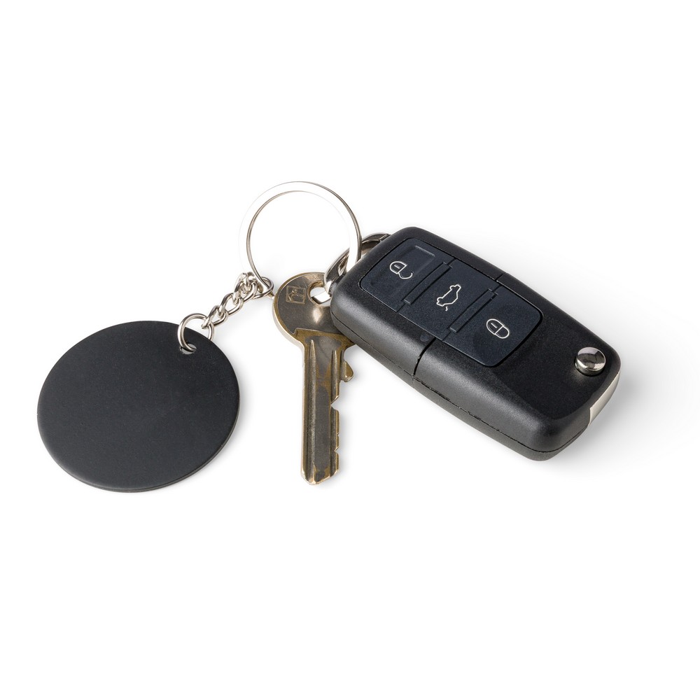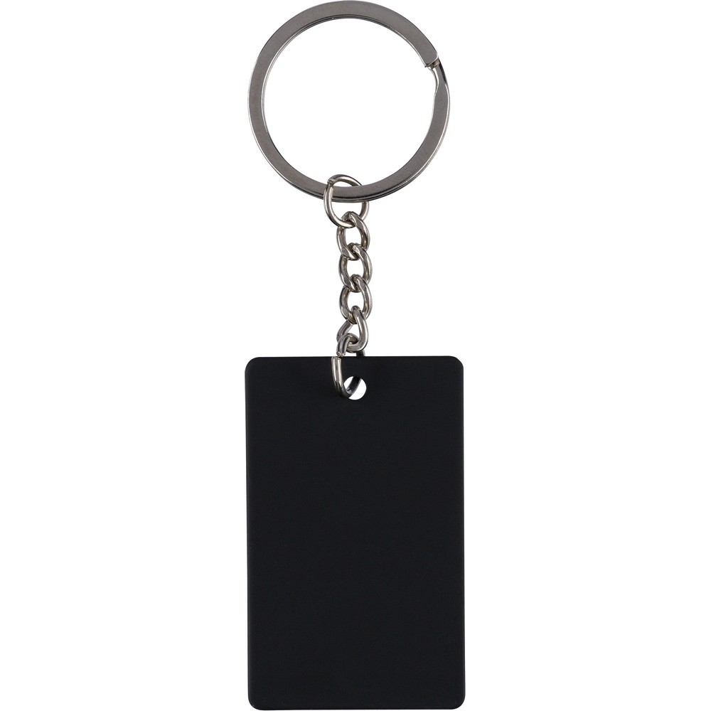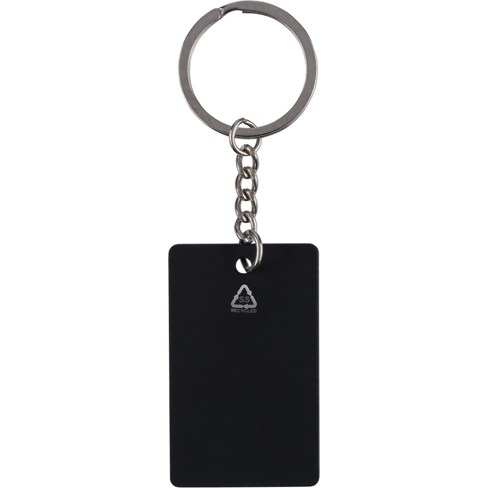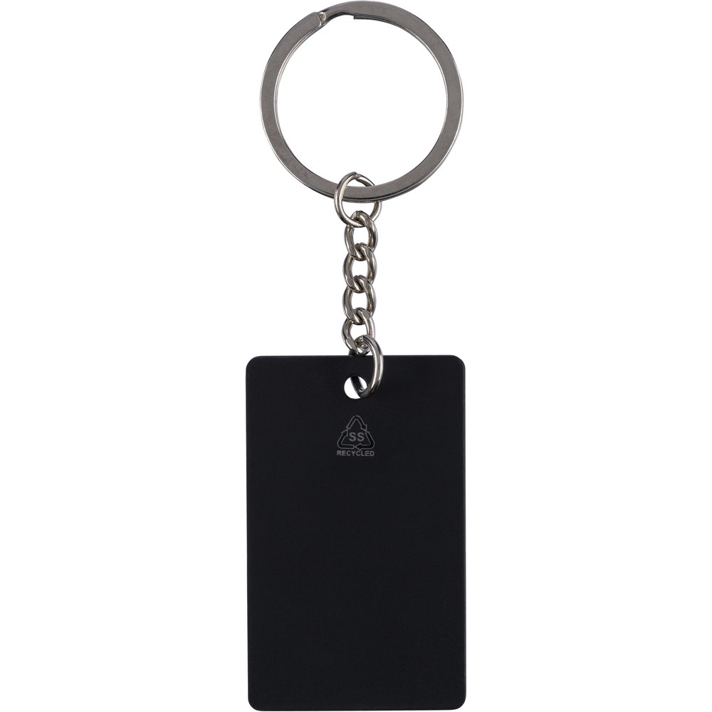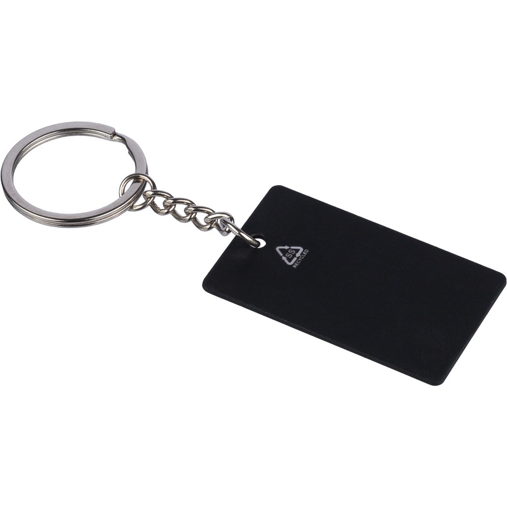 Prostokątny brelok do kluczy, ikona recyklingu na produkcie, zapakowany w kraftową kopertę, produkt wykonany ze stali nierdzewnej z recyklingu