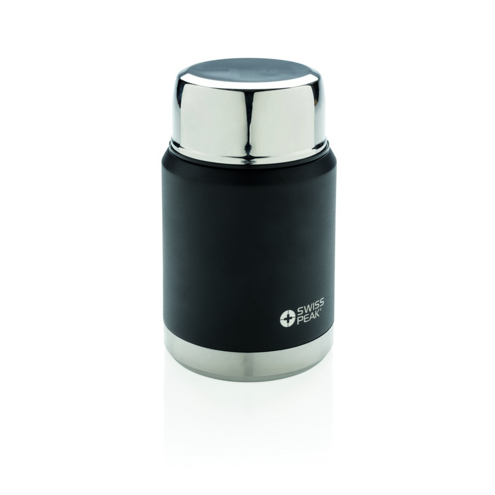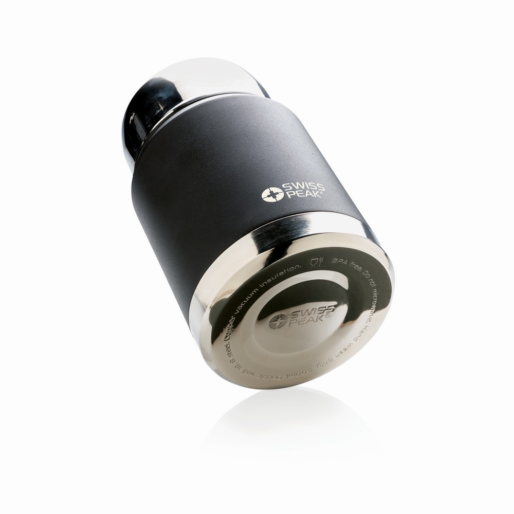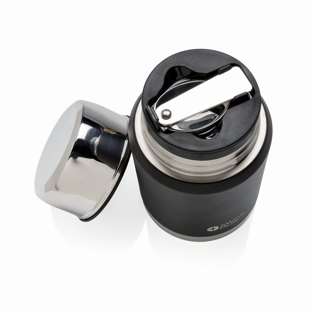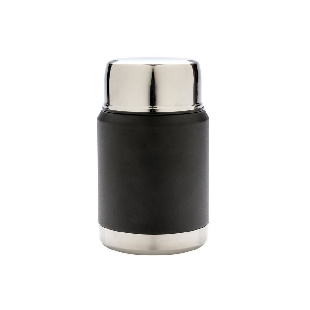 Próżniowy pojemnik na żywność 500 ml, podwójne ścianki, wnętrze ze stali nierdzewnej 18/8, szczelny, powlekany proszkowo czarny kolor cechujący się niezwykłą trwałością i odpornością na wyblaknięcie czy popękanie, ściana wewnętrzna pokryta miedzią o wysokim poziomie przewodnictwa, utrzymuje temperaturę napojów ciepłych do 8 h oraz zimnych do 24 h, łyżka ze stali nierdzewnej 18/8 w komplecie, wyłącznie mycie ręczne, ślad węglowy produktu: 3,94 kg CO2
