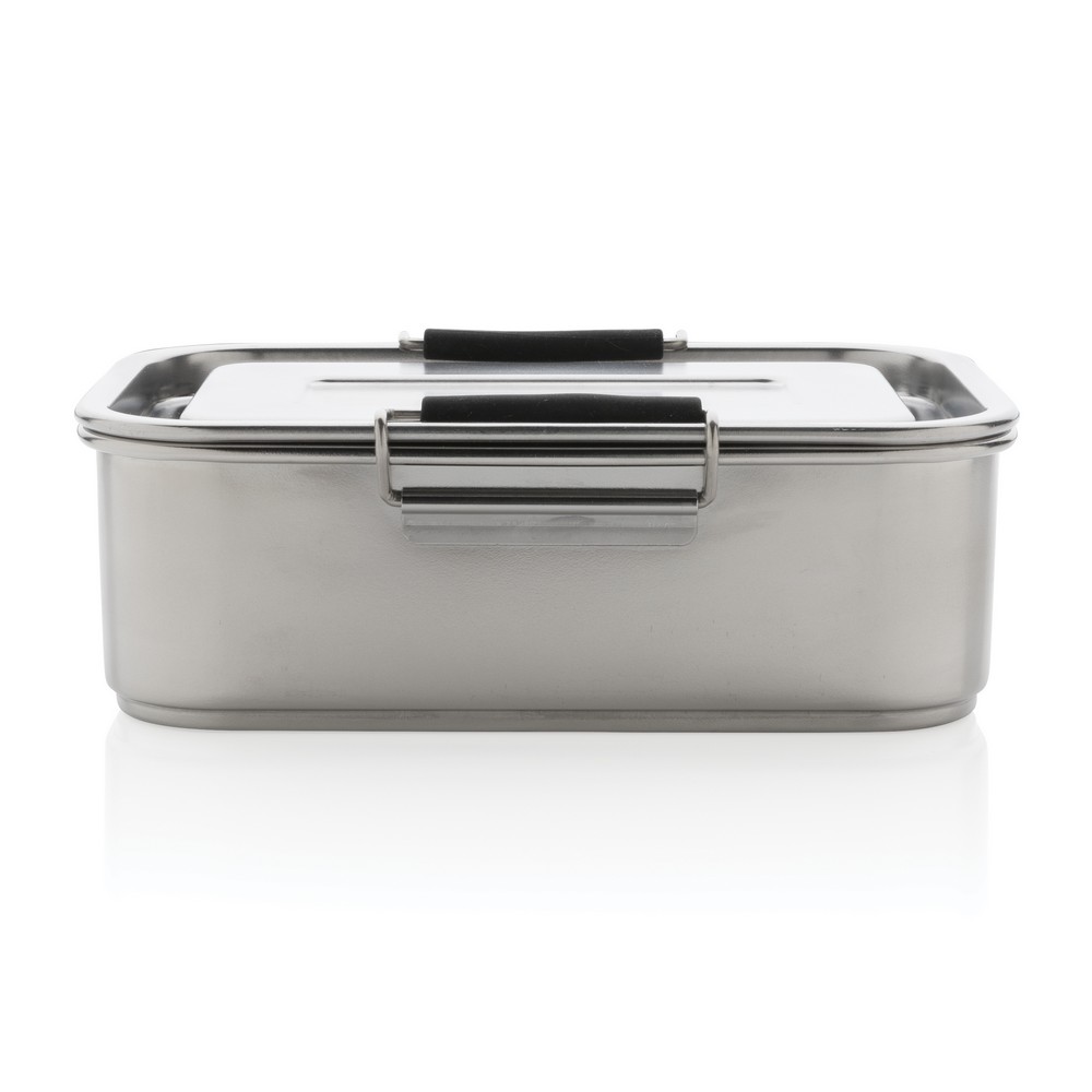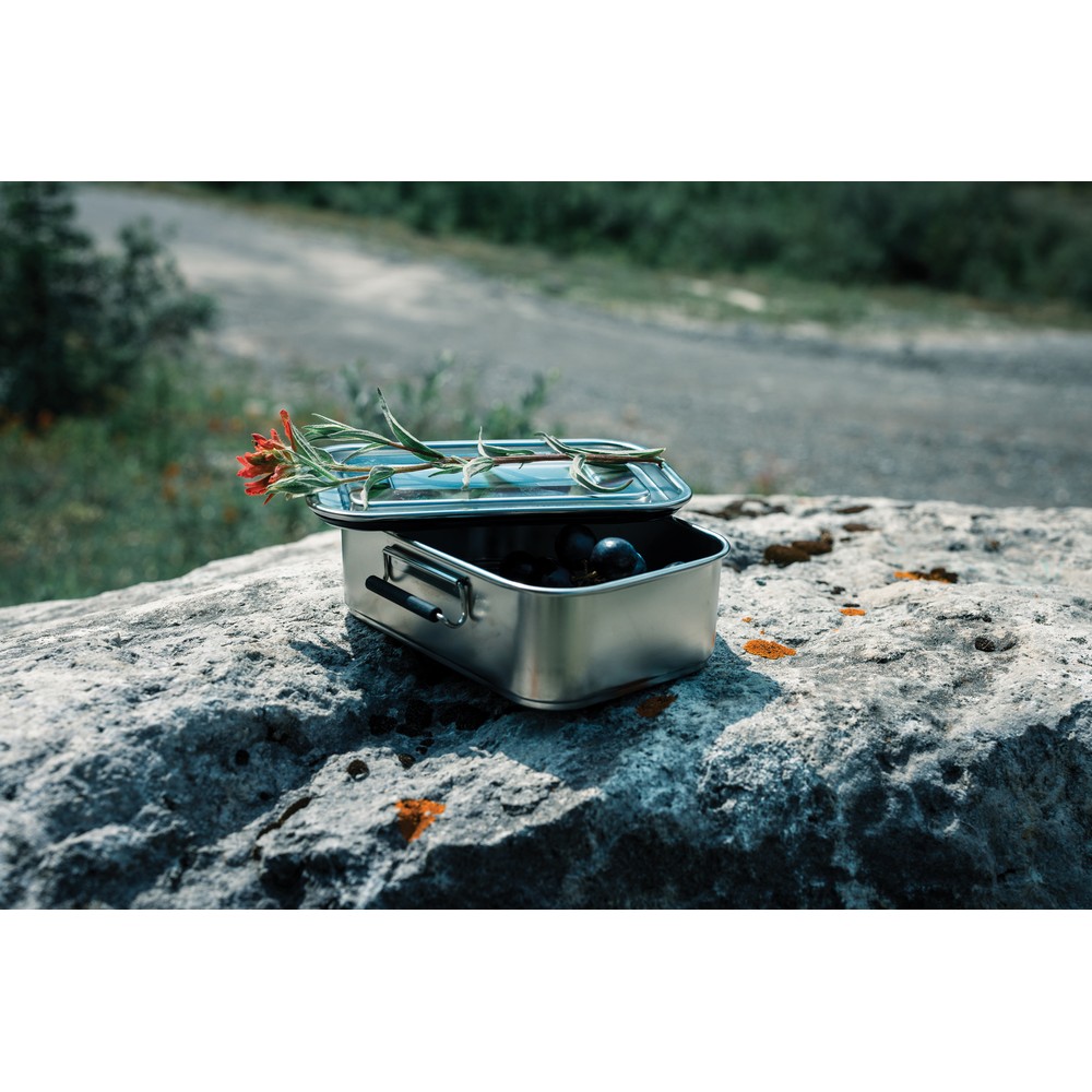 Pudełko śniadaniowe 800 ml, lunchbox, zamykane na 2 zatrzaski, solidne i szczelne, wykonane w 95% ze stali nierdzewnej z recyklingu, wykorzystane materiały posiadają certyfikat GRS (Global Recycled Standard) który gwarantuje, że wykorzystane materiały pochodzą z recyklingu, zawartość materiału z recyklingu jest obliczana w oparciu o wagę całkowitą przedmiotu, wyłącznie do zimnych potraw, nie należy używać w kuchence mikrofalowej i myć w zmywarce, w opakowaniu z papieru kraftowego z certyfikatem FSC® (Forest Stewardship Council), ślad węglowy produktu: 1,33 kg CO2