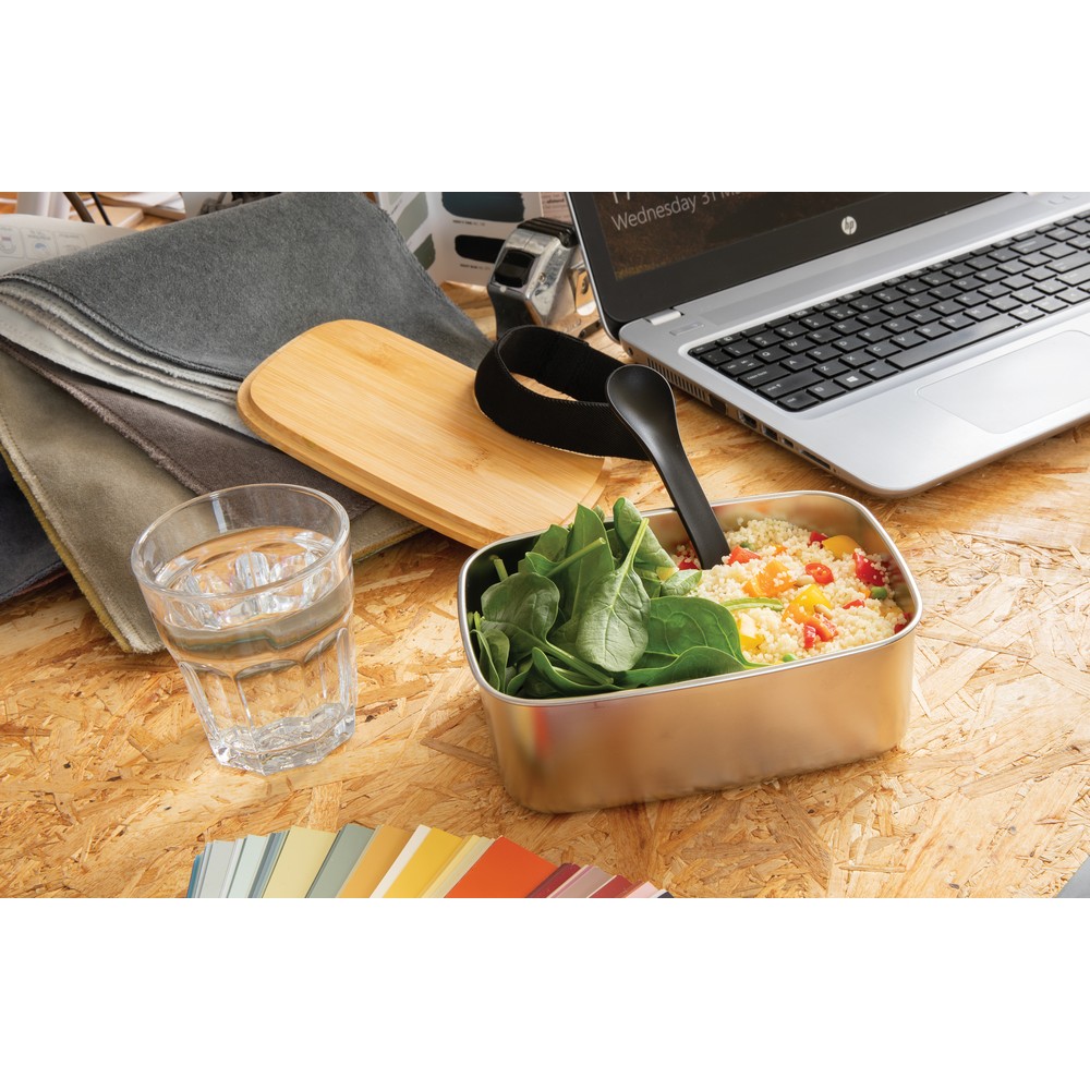 Pudełko śniadaniowe, lunchbox o pojemności 1500 ml, wykonane ze stali nierdzewnej, bambusowe wieczko, w komplecie łyżkowidelec i elastyczny pasek, można myć w zmywarce z wyjątkiem bambusowego wieczka, ślad węglowy produktu: 2,18 kg CO2
