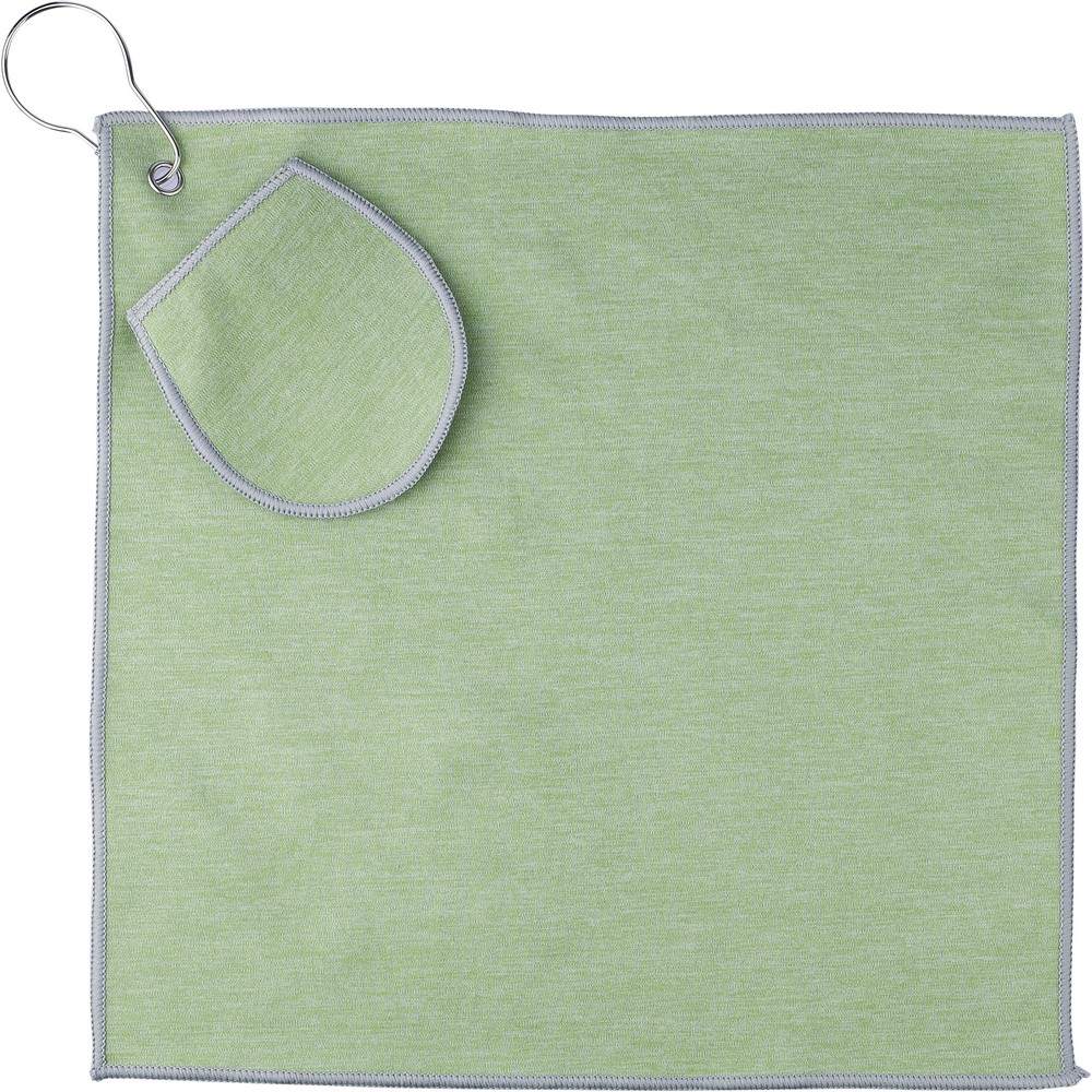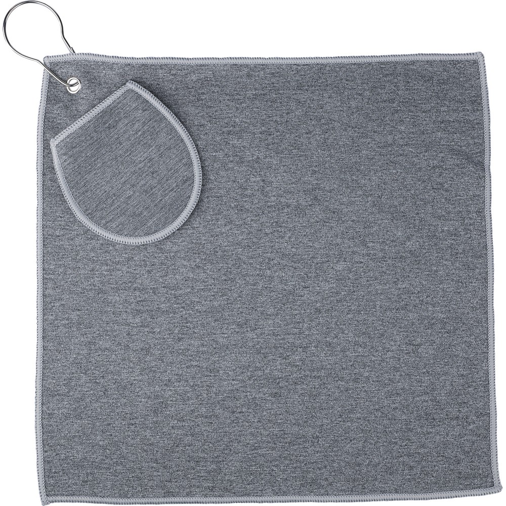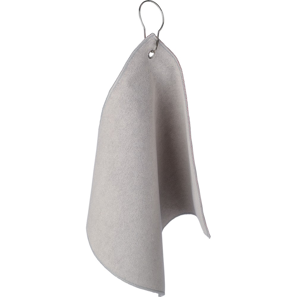 Ręcznik golfowy, z wbudowaną kieszonką na piłkę golfową, wyposażony w metalowy haczyk umożliwiający łatwe przymocowanie do torby, wewnątrz znajduje się ikona RPET na metce, można prać w pralce (na zimno), produkt wykonany z RPET