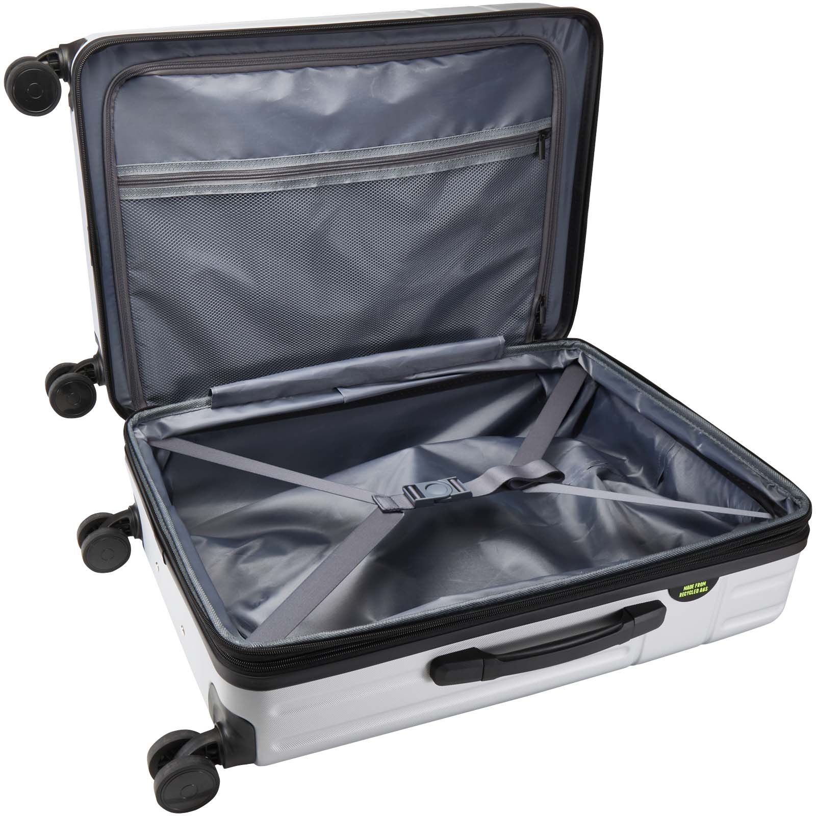 Wykonana z odpornego na uderzenia, tworzywa sztucznego podchodzącego z recyklingu z wyściółką RPET, 60-centrymetrowa rozszerzalna torba podróżna Rover została zaprojektowana dla nowoczesnych odkrywców, którzy cenią sobie trwałość i przemyślany design. Dzięki dużej pojemności 70 l i rozszerzalnej przestrzeni na dodatkowe rzeczy, idealnie nadaje się na dłuższe podróże. Wózek z certyfikatem GRS (wraz z nadrukiem certyfikatu) wyposażony jest w dwururową aluminiową ramę i 4-kołowy system obrotowy o zakresie 360 stopni, zapewniający łatwą mobilność. Zintegrowany zamek szyfrowy TSA zapewnia dodatkowe bezpieczeństwo, a wygodny uchwyt gwarantuje wygodę w podróży. Wewnątrz znajdują się paski kompresyjne i przegrody zapinane na suwak, dzięki którym Twoje rzeczy pozostaną uporządkowane przez całą podróż.