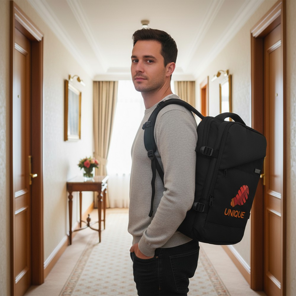 Plecak kabinowy Exclusive Collection, rozszerzalna konstrukcja pomaga dostosować wymiary plecaka do wymogów transportu oraz indywidualnych potrzeb użytkownika, dwie przegrody główne zamykane na zamek błyskawiczny, dwa regulowane paski kompresyjne ułatwiające stabilizacje plecaka, miękkie i regulowane paski na ramię umożliwiające dopasowanie ich długości do własnych preferencji, produkt wykonany z poliestru i PU