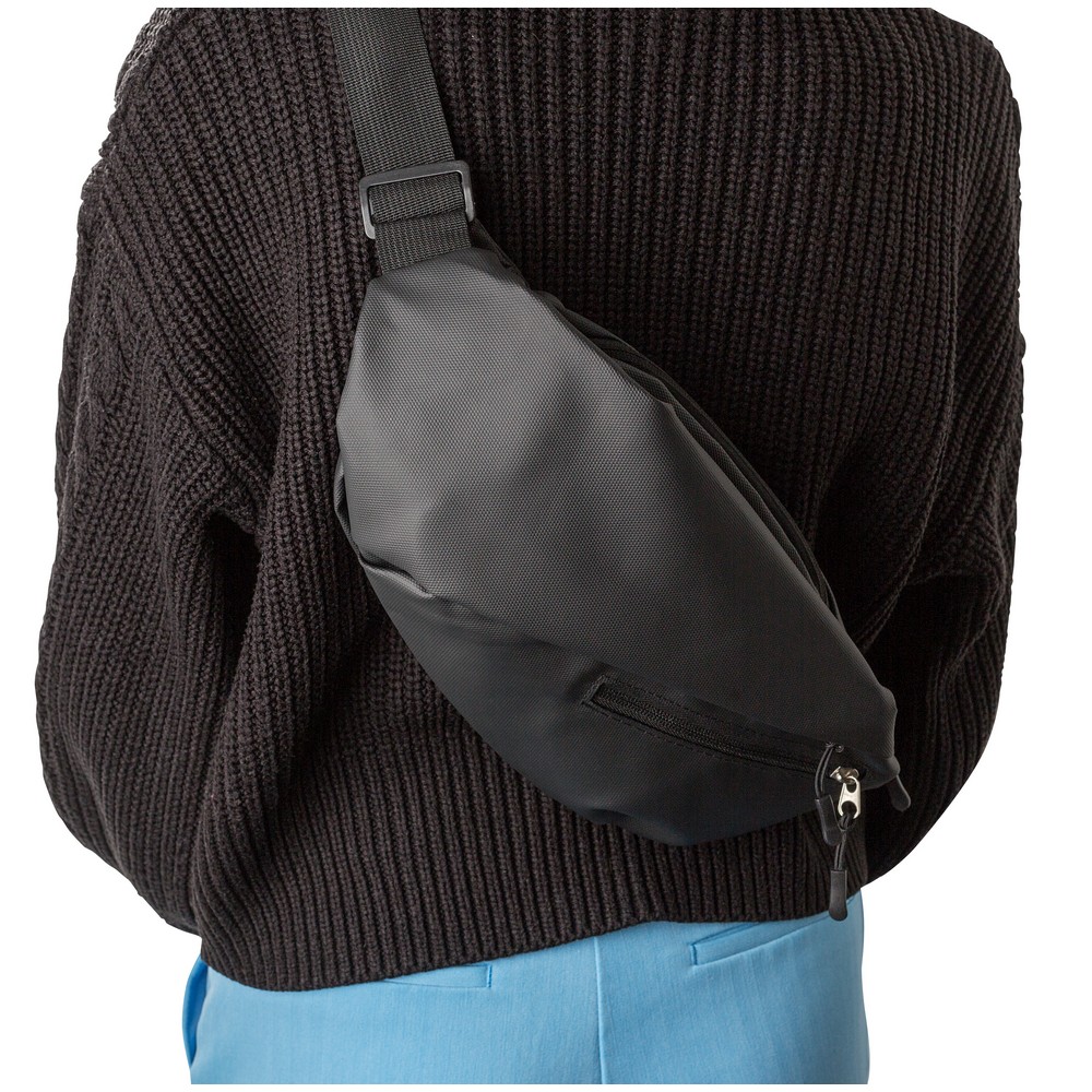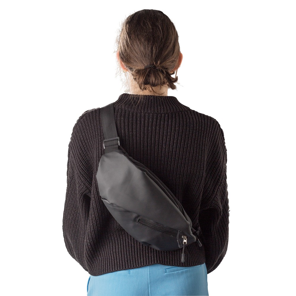 Saszetka zapinana w pasie, wodoodporna, przegroda główna oraz przednia kieszeń na zamek błyskawiczny, kieszenie wewnątrz komory głównej, regulowany pasek