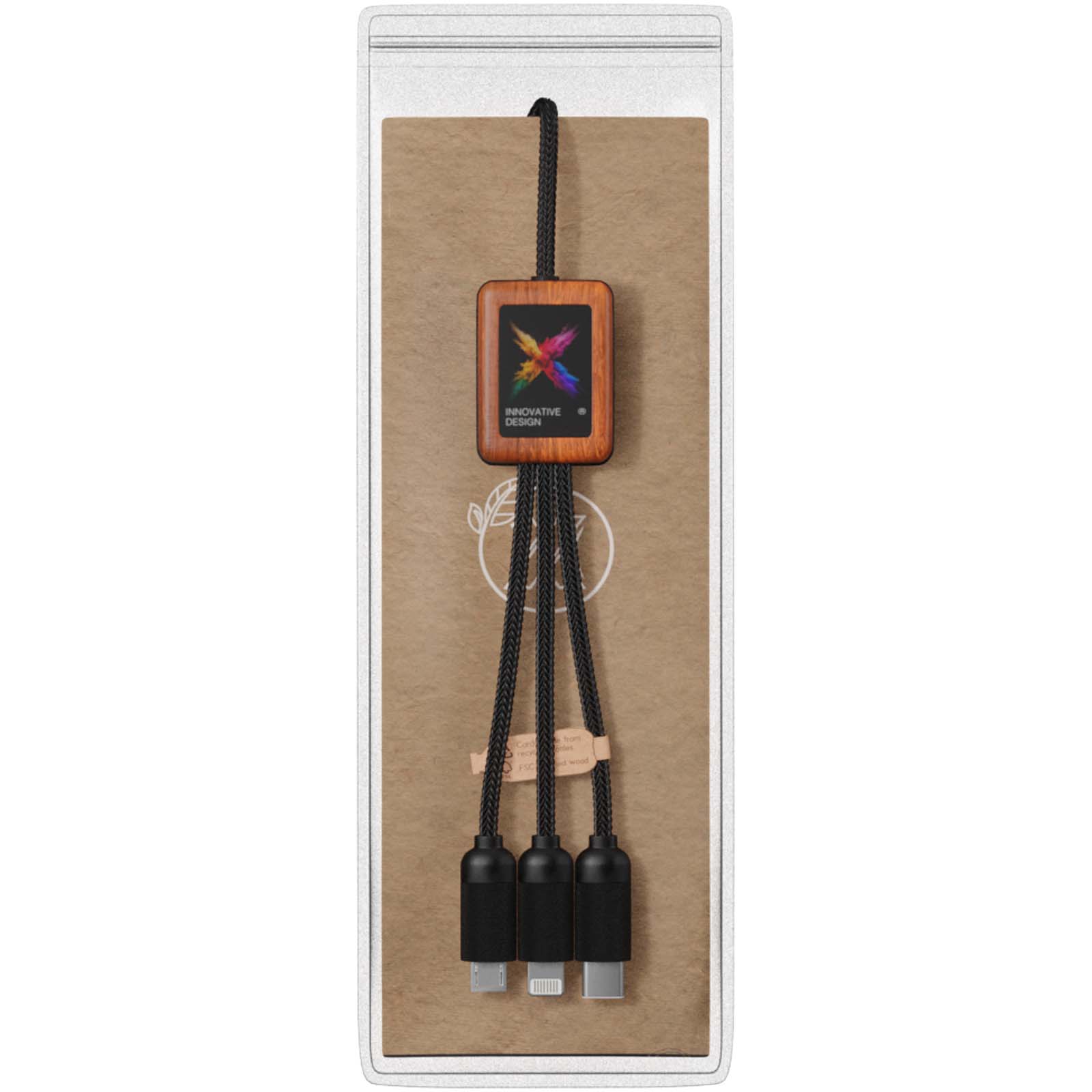 Kabel do ładowania z podświetlanym logo z tworzywa sztucznego PET 5-w-1 z kwadratową bambusową obudową. Podświetlane logo jest widoczne po obu stronach. Posiada 3 złącza (typ C, micro USB, iPhone) i podwójne złącze USB do uniwersalnego zastosowania. Dostarczane w etui z tworzywa sztucznego TPU z kartą z papieru Kraft. Długość kabla: 1 metr. 3-letnia gwarancja.