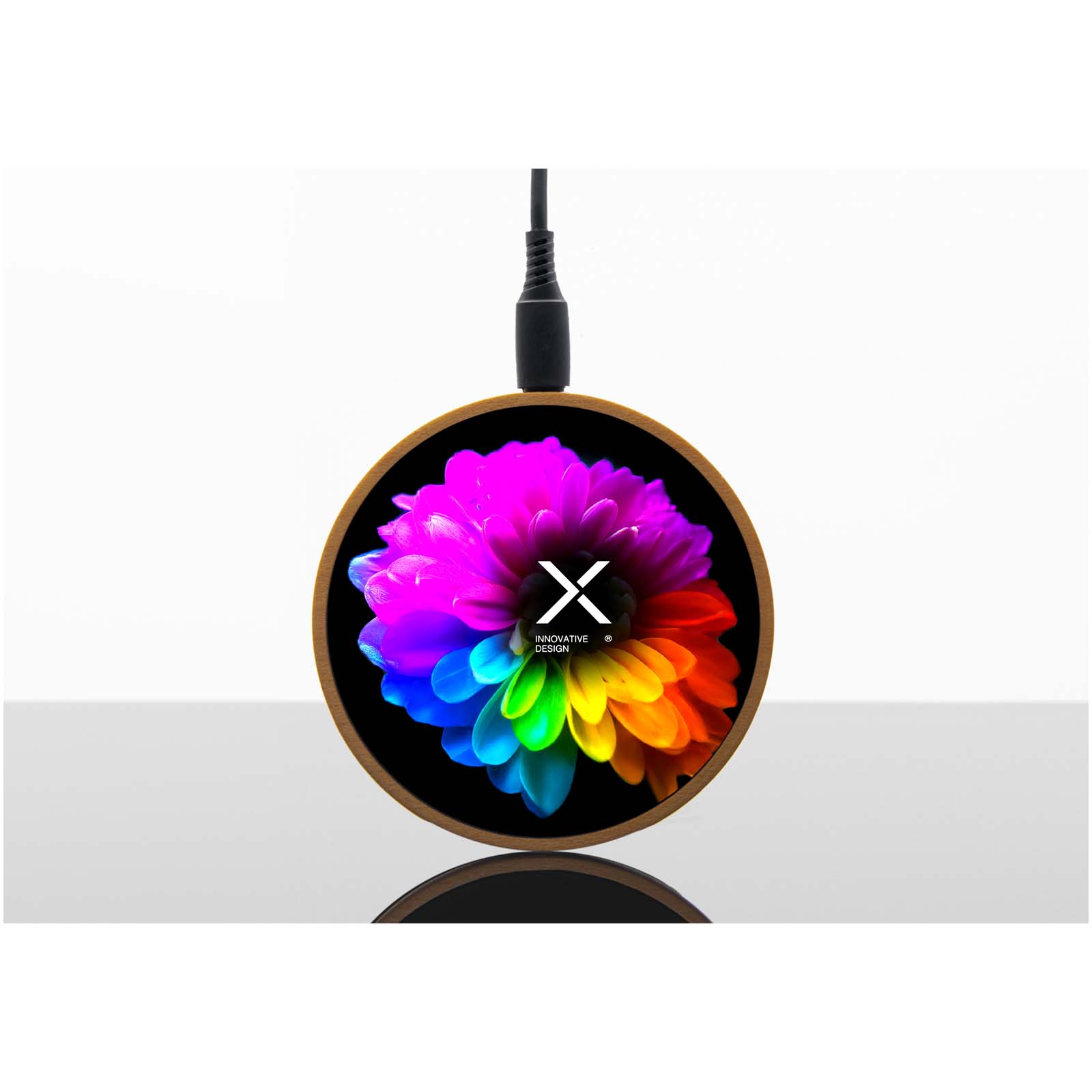 Bezprzewodowa stacja ładująca o mocy 10 W wykonana z gumy i drewna z certyfikatem FSC, z kablem ładującym wykonanym z plastiku z recyclingu. Może być ozdobiona podświetlanym logo. Dostarczana w czarnym pudełku upominkowym typu kraft z magnetycznym zamknięciem. Patent EUROPE EUIPO.