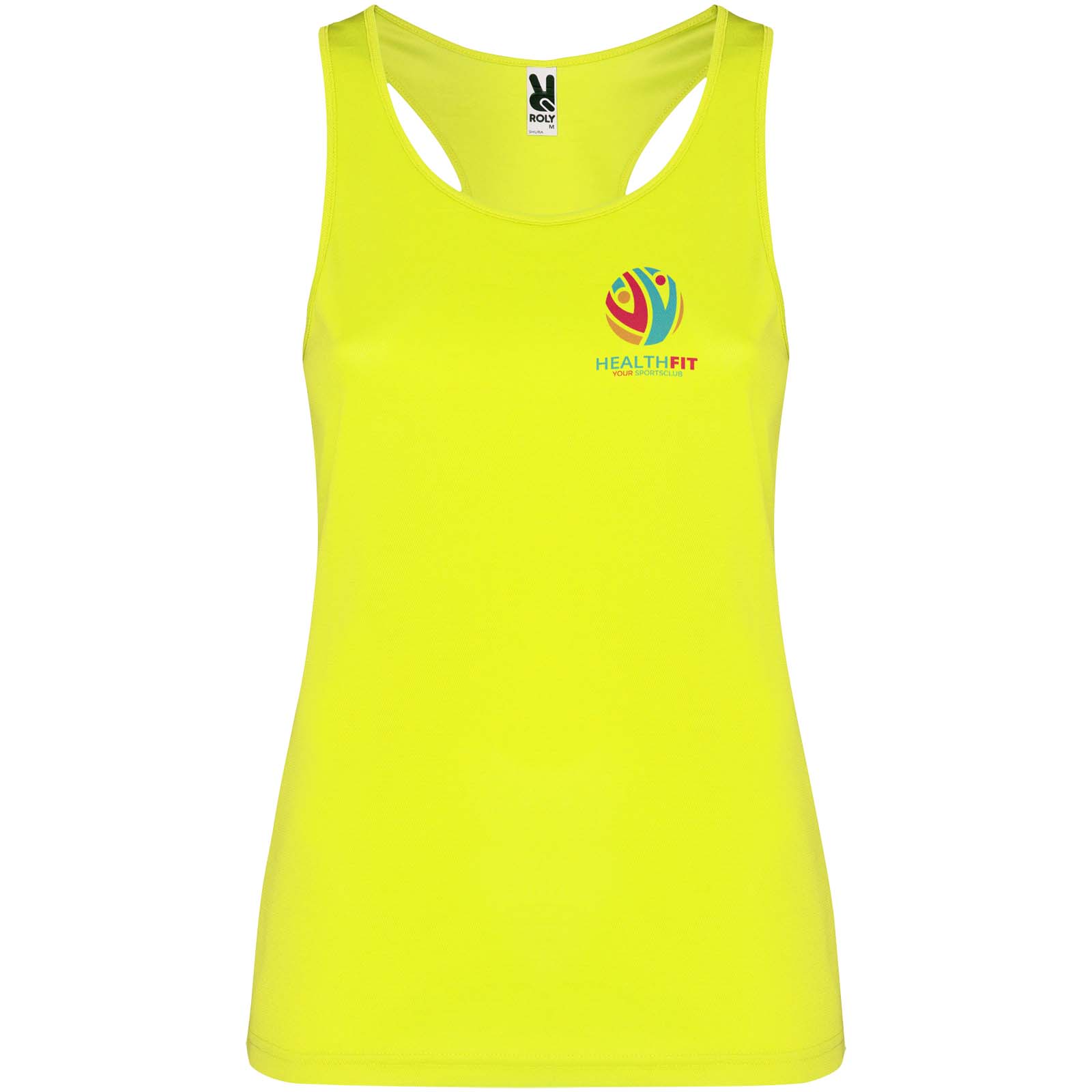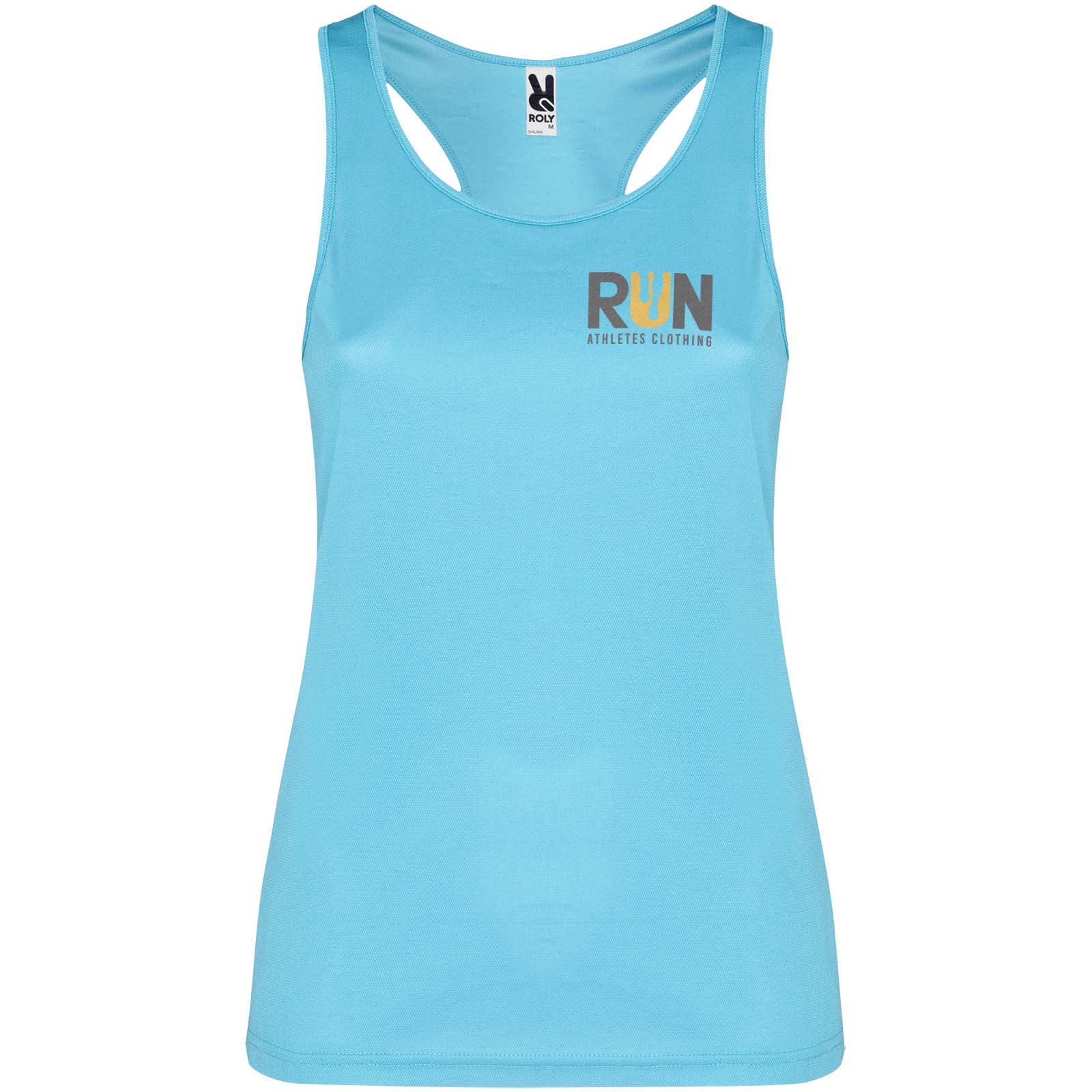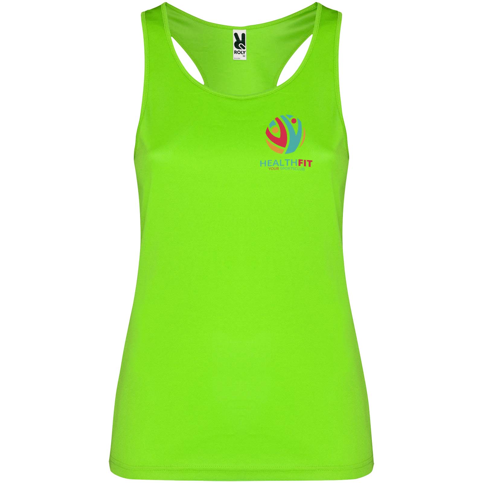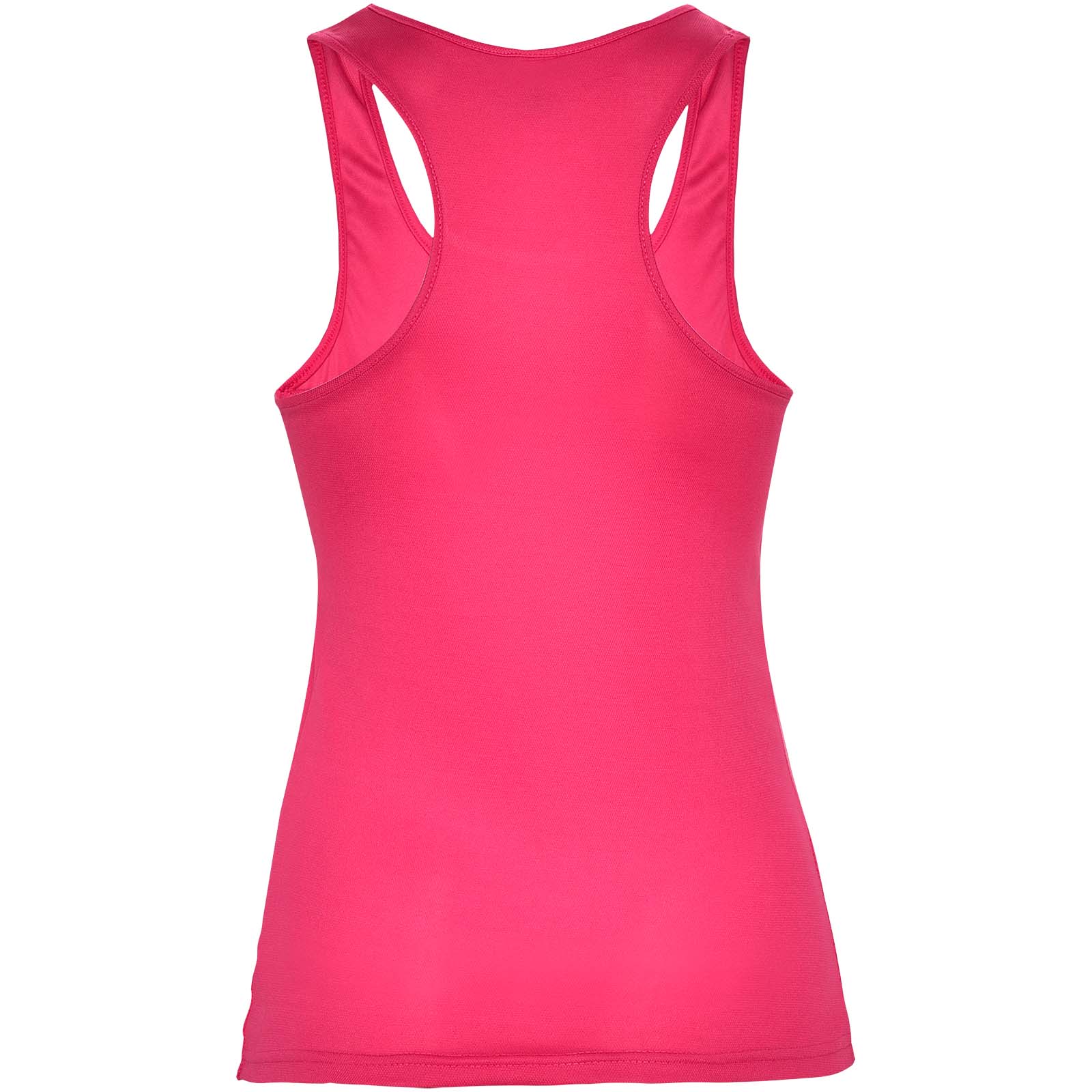 Techniczny, oddychający materiał, łatwy do prania i suszenia. Prążkowane otwory na ramiona i dekolt. Tył typu racerback i szwy boczne. Usuwalna etykieta.