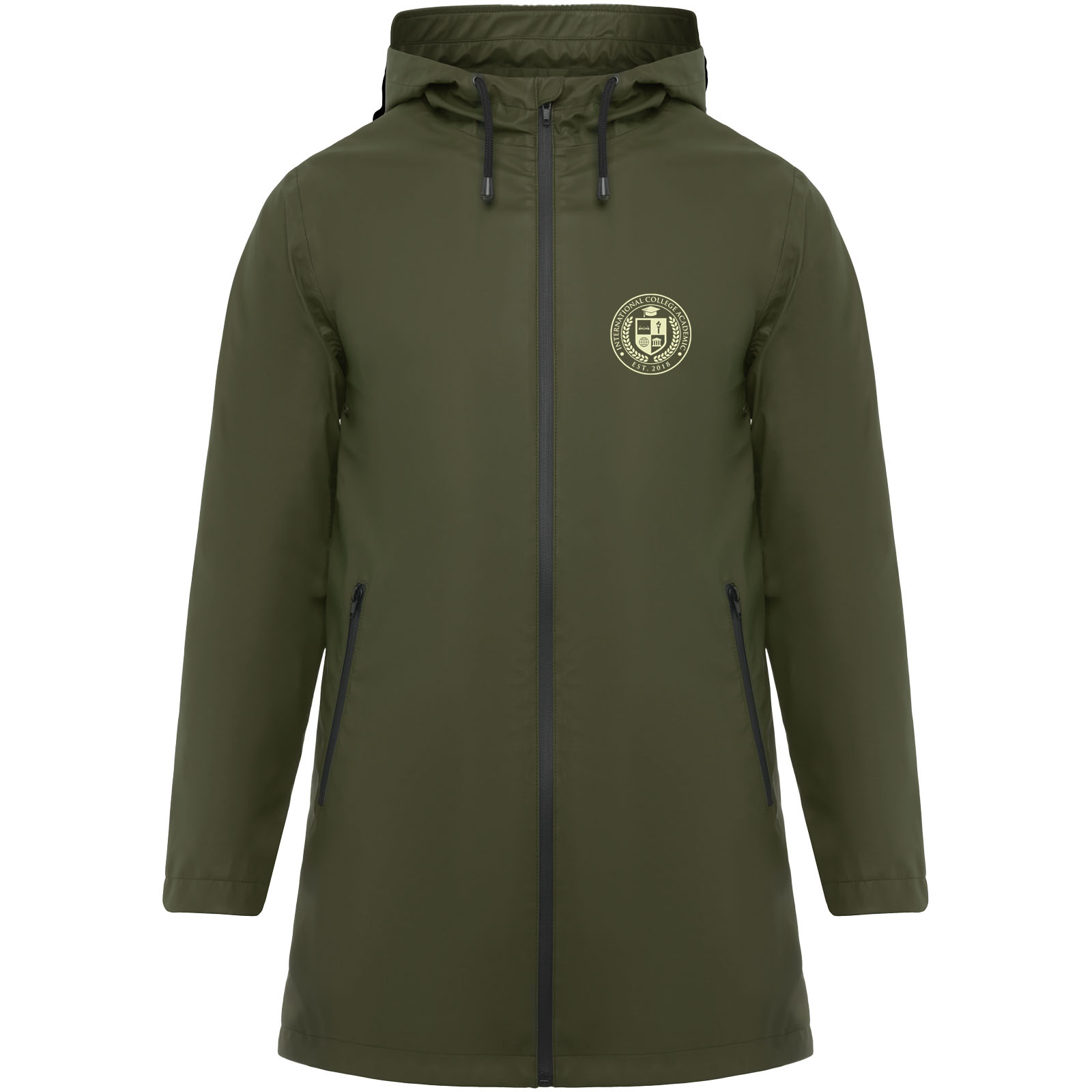 Wodoodporna kurtka przeciwdeszczowa. Kaptur z daszkiem. Zgrzewane zamki błyskawiczne i szwy. Kontrastowe detale w kolorze czarnym. Dwie kieszenie boczne z zamkiem błyskawicznym. Rozcięcie z tyłu. Usuwalna metka. Wodoodporna.