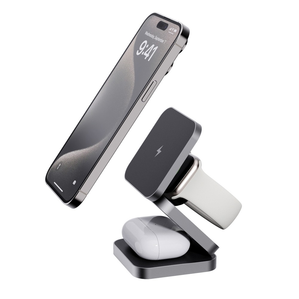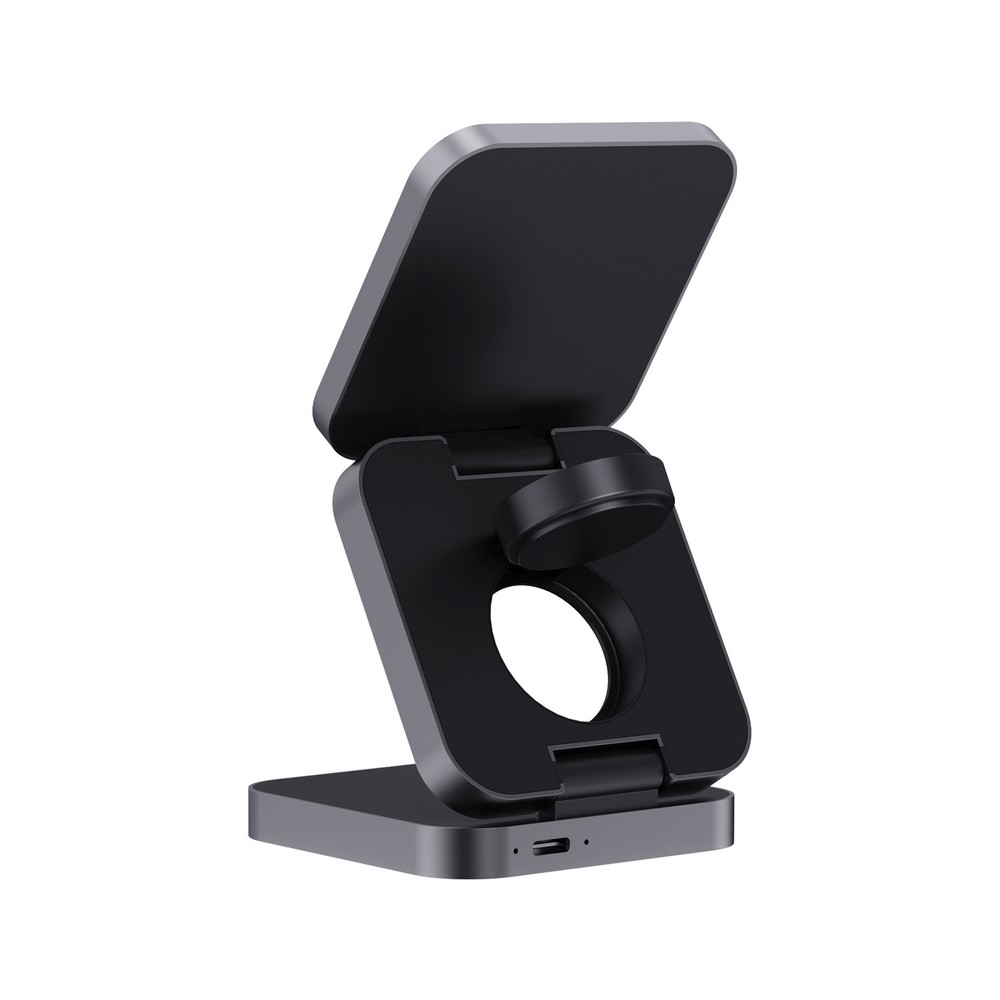 Ładowarka bezprzewodowa 3 w 1, składana, magnetyczna ładowarka bezprzewodowa 15W, ładowarka bezprzewodowa 5W do słuchawek i drobnych akcesoriów, ładowarka bezprzewodowa 2,5W do smartwatchy (tylko iOS), wykonana z PU z recyklingu, działa z telefonami posiadającymi możliwość ładowania indukcyjnego, wejście 9V/3A, wyjście dla telefonu 9 V/1.1 A, 9 V/1.67 A, 15 W, wyjście dla słuchawek 5V/1A, 5W, wyjście smartwatcha 5V/0.5A, kabel 120 cm z TPE z recyklingu w komplecie, w pudełku z certyfikatem FSC® mix