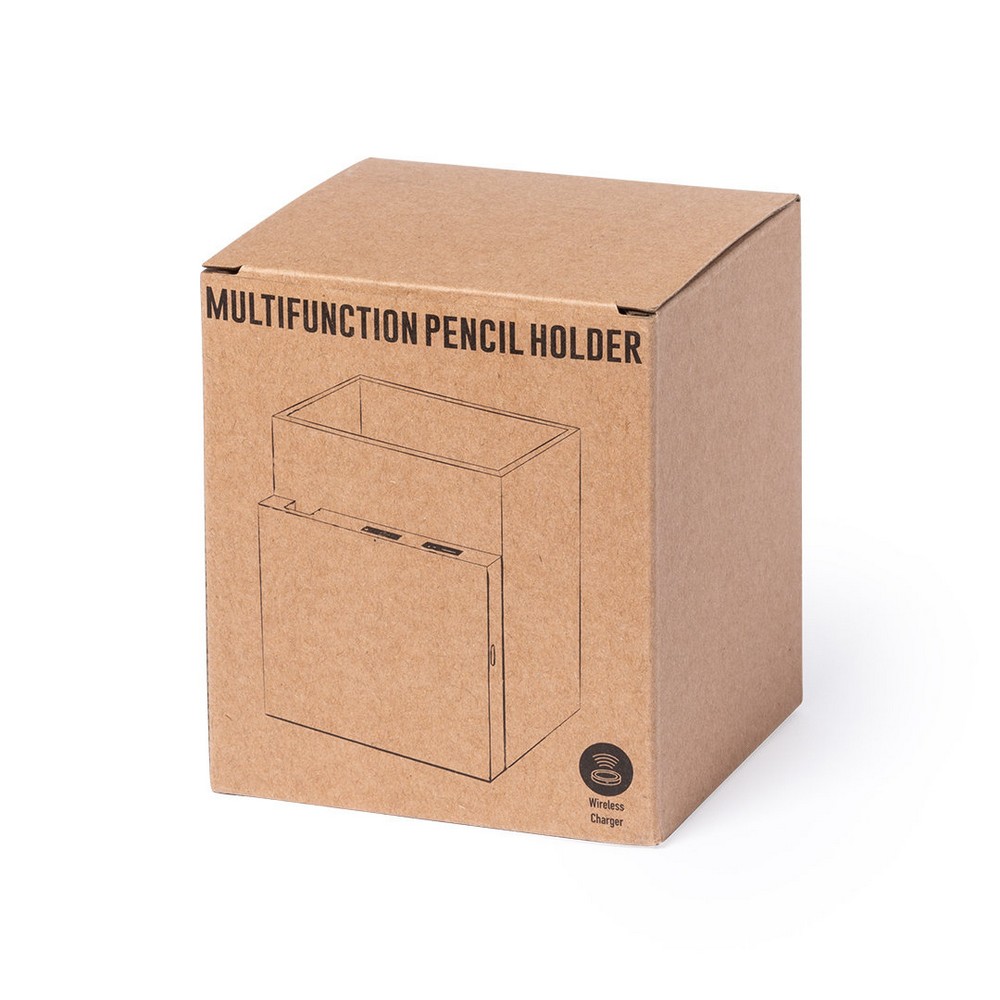 Składana ładowarka bezprzewodowa 5W wykonana z kartonu z recyklingu, działa z telefonami posiadającymi możliwość ładowania indukcyjnego, wejście micro USB 5V/2A, hub USB 2.0 z 2 portami, pojemnik na przybory do pisania, stojak na telefon, kabel micro USB w komplecie
