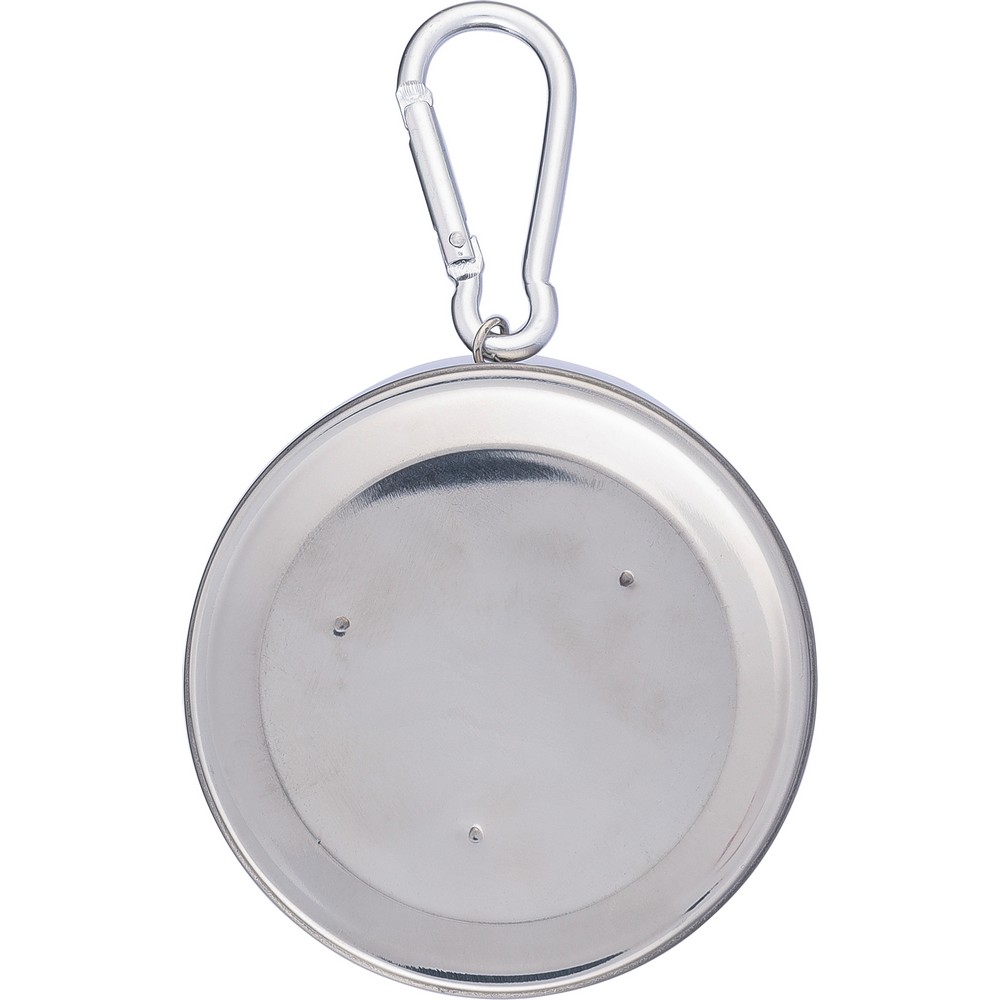 Składany kubek podróżny 220 ml z metalowym karabińczykiem umożliwiającym przypinanie, składana konstrukcja ułatwia pakowanie i przenoszenie, zapakowany w brązowy kartonik, produkt wykonany ze stali nierdzewnej
