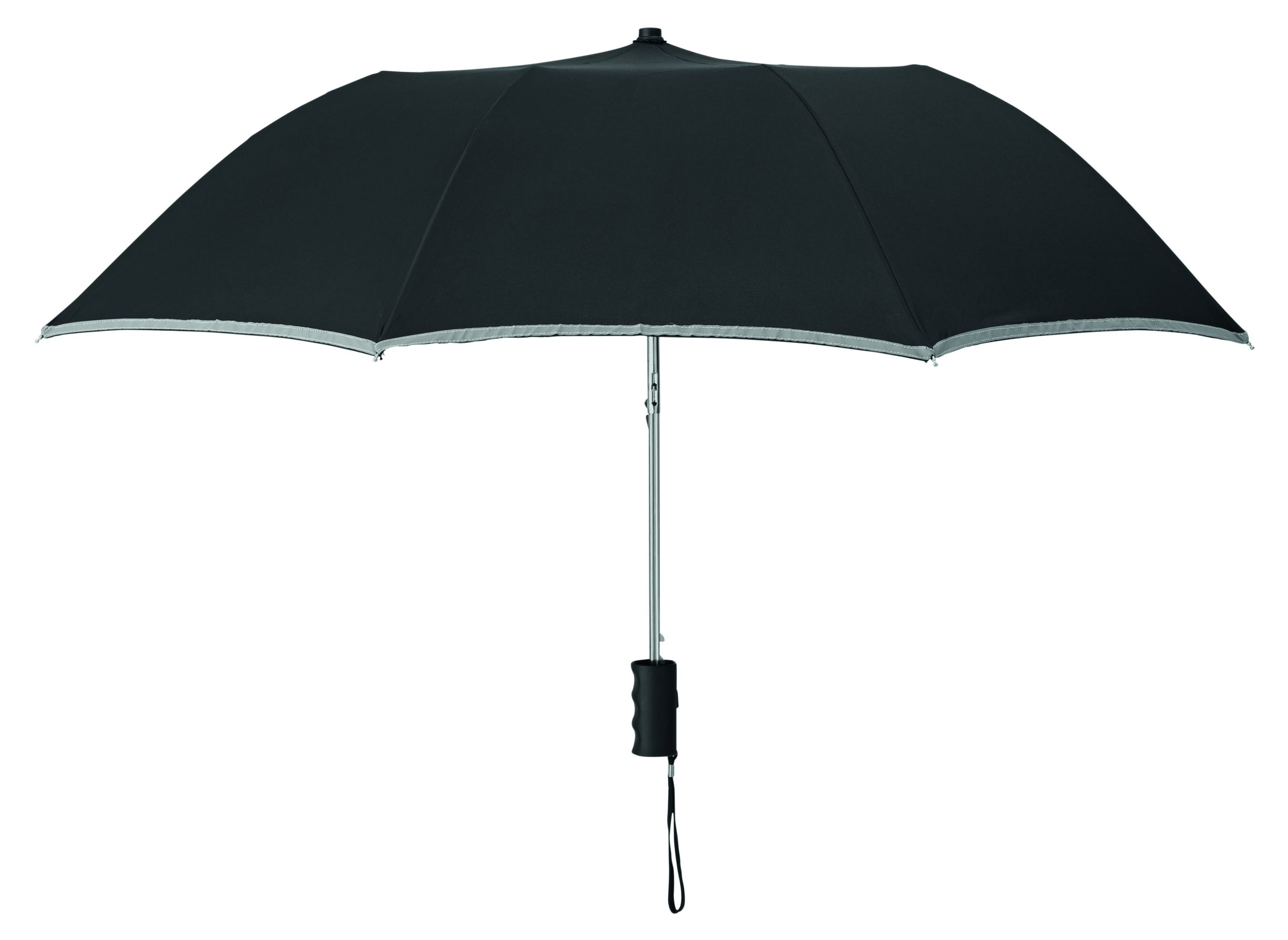 Parasol o średnicy 21 cali. Składany na 2, otwierany automatycznie. Wykonany z poliestru pongee, plastikowa rączka ze smyczką. Trzon, żebra i koncówki ocynkowane. W etui z tego samego materiału z elementami odblaskowymi. Zamykany manualnie.