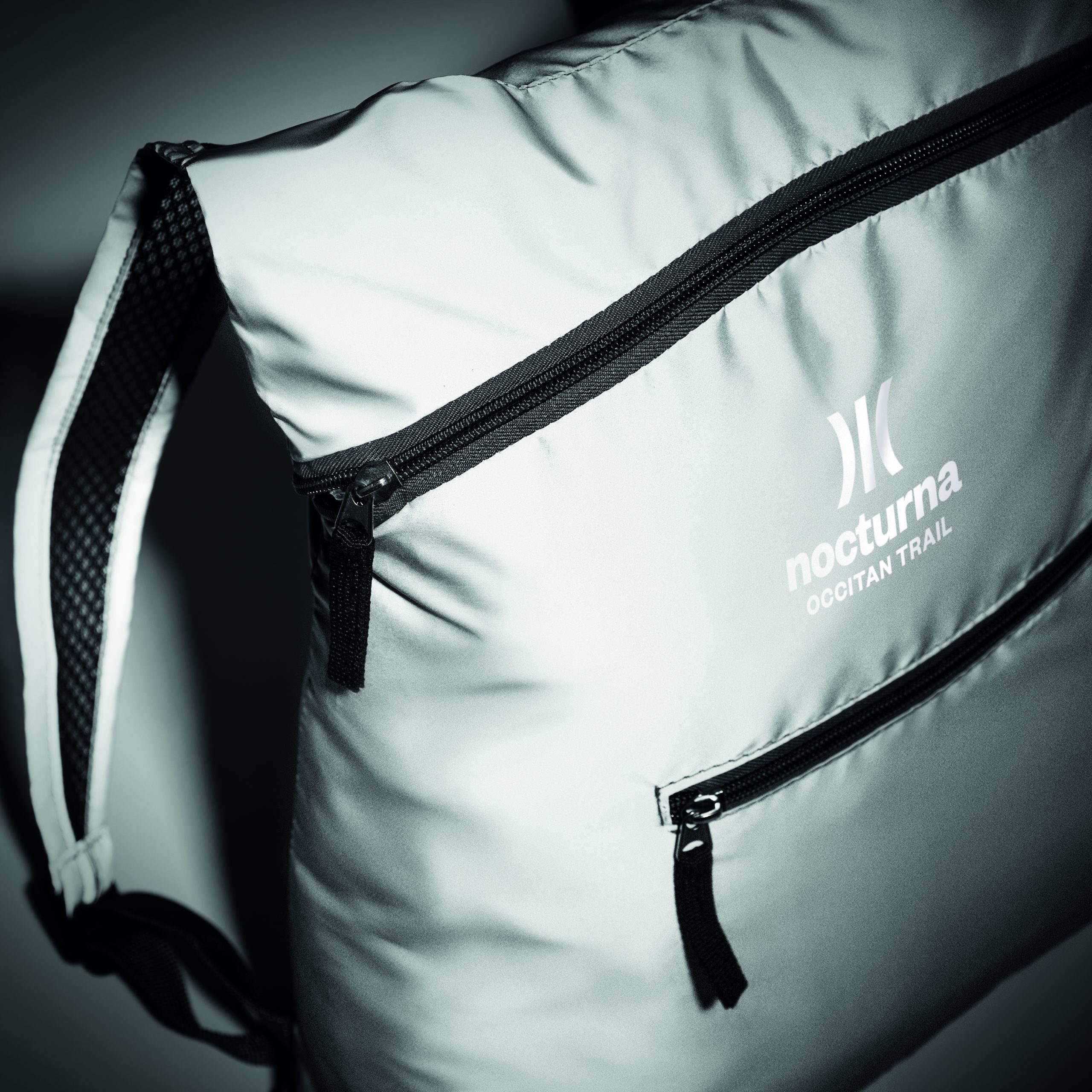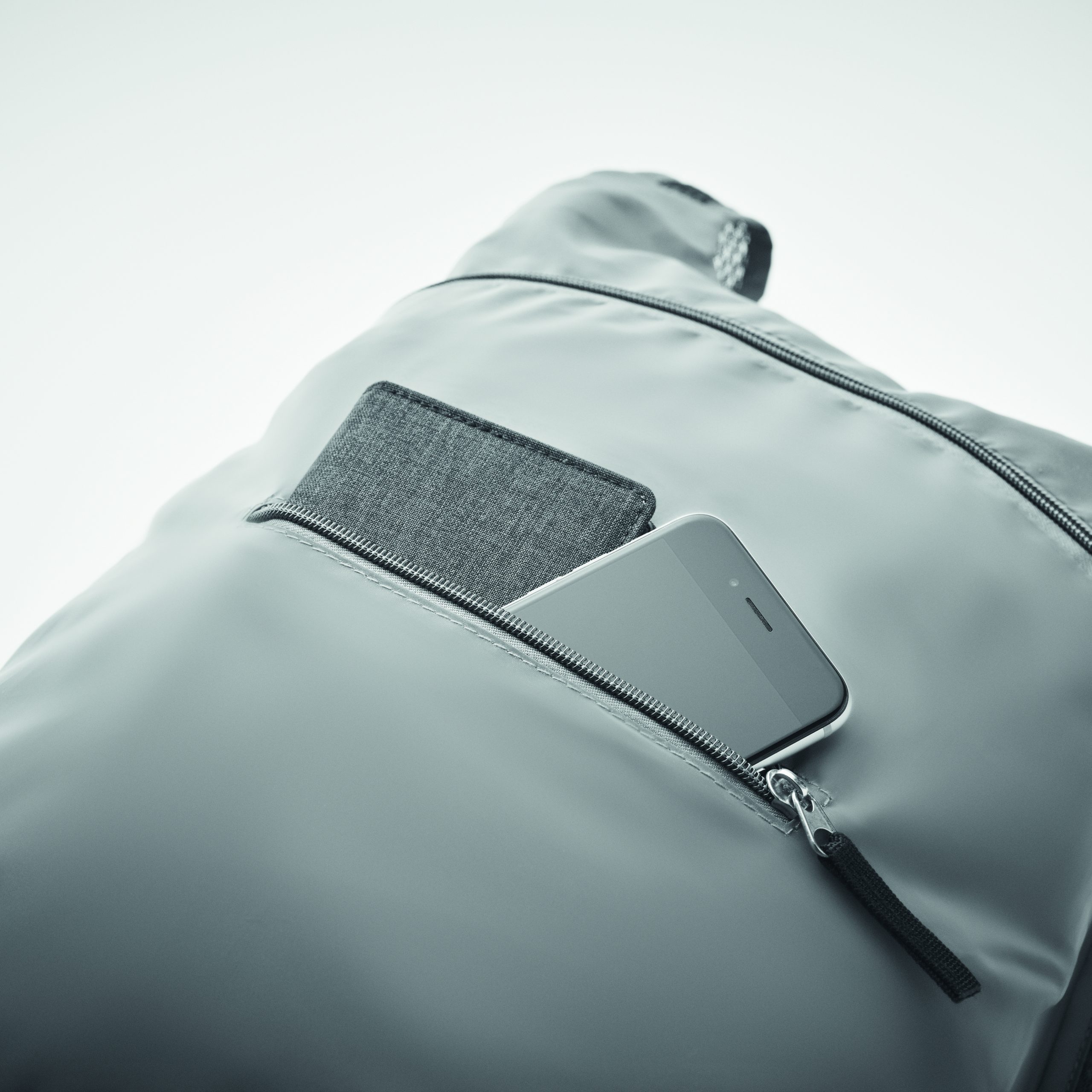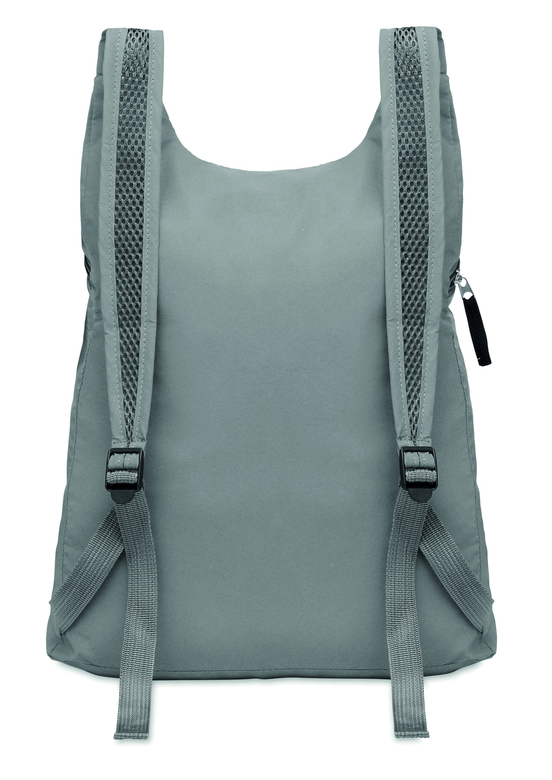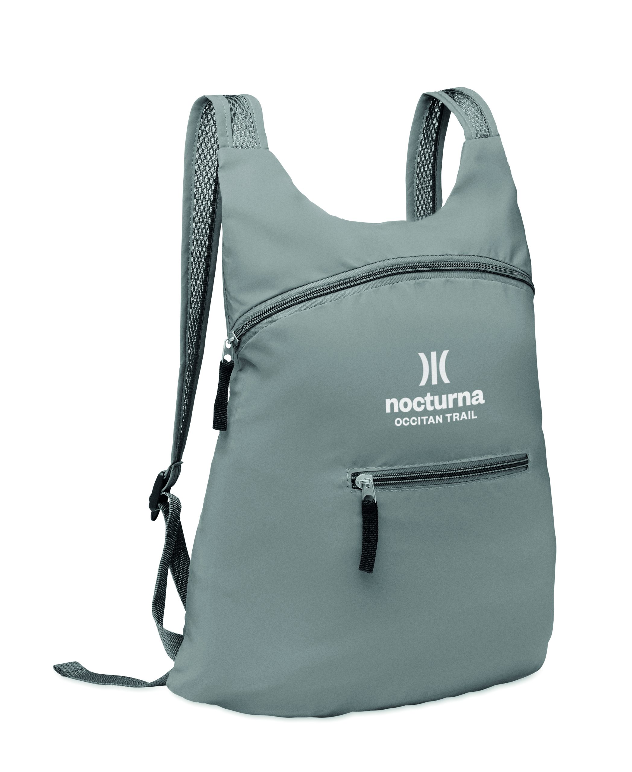 Składany plecak sportowy z odblaskowego poliestru 190T z przednią kieszenią zapinaną na zamek błyskawiczny. Regulowane i odpinane szelki.