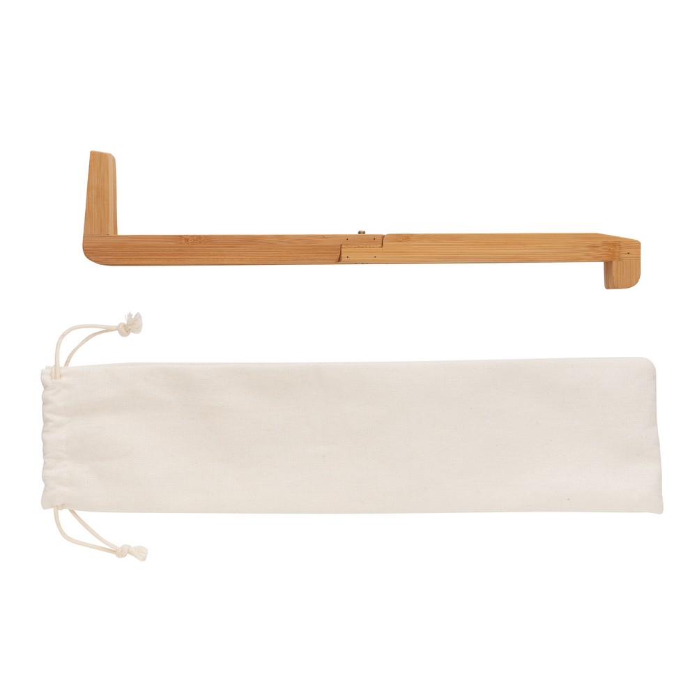 Składany stojak na laptopa, tablet, wykonany z wytrzymałego, naturalnego bambusa, podstawka zapewnia odpowiedni poziom cyrkulacji powietrza pod urządzeniem oraz właściwe położenie ekranu, kompatybilny z laptopami do 15,6″, może również służyć jako stojak na książkę, bawełniane etui w komplecie, ślad węglowy produktu: 0,42 kg CO2