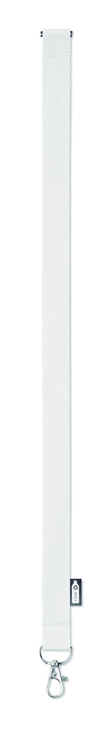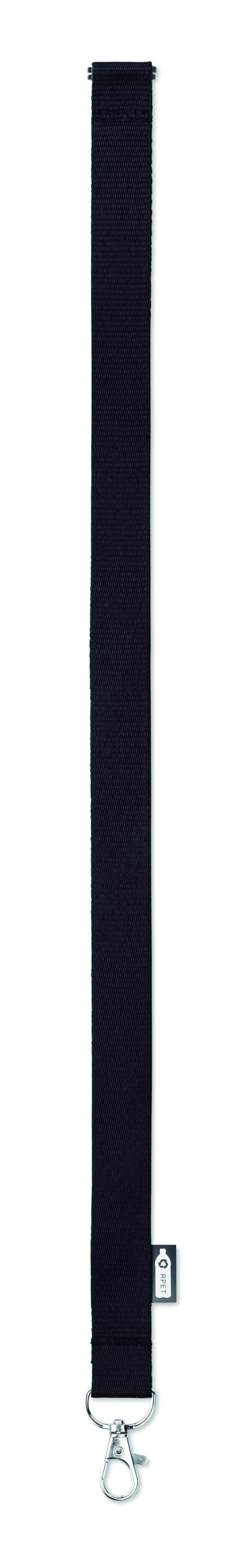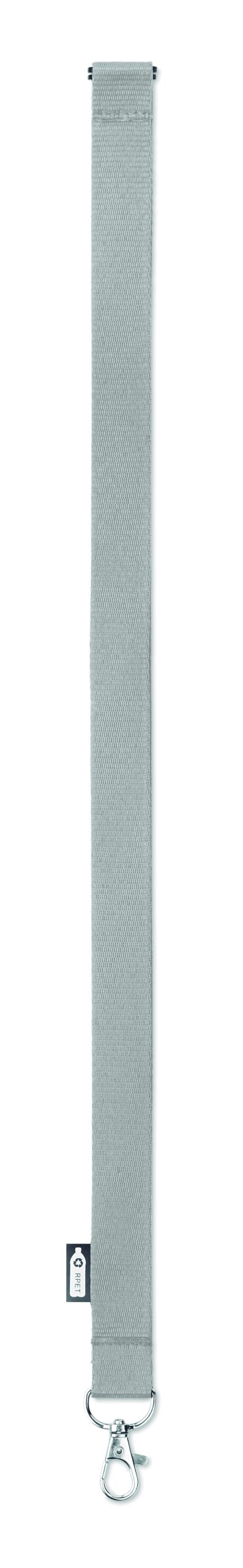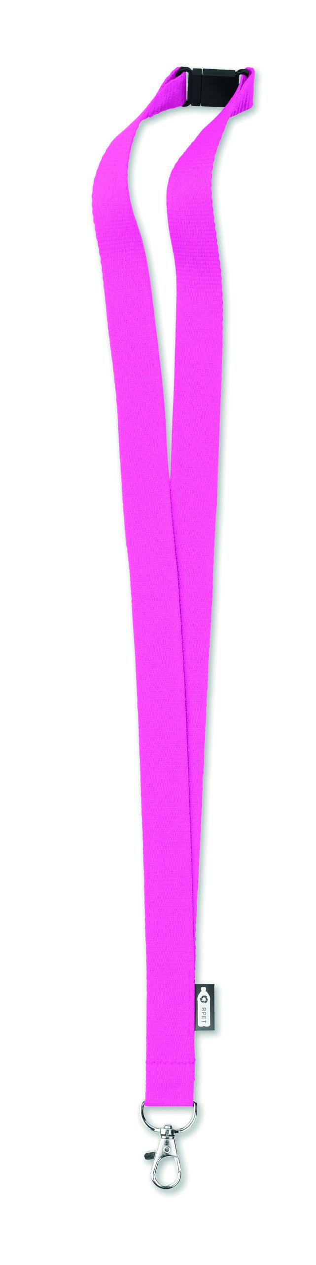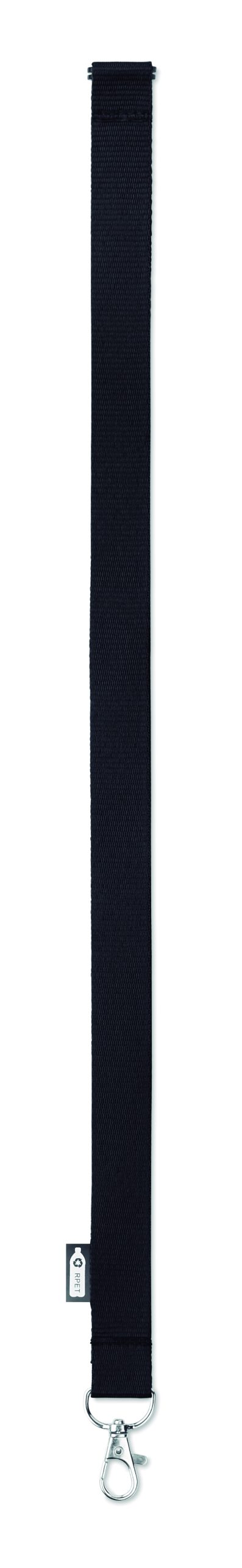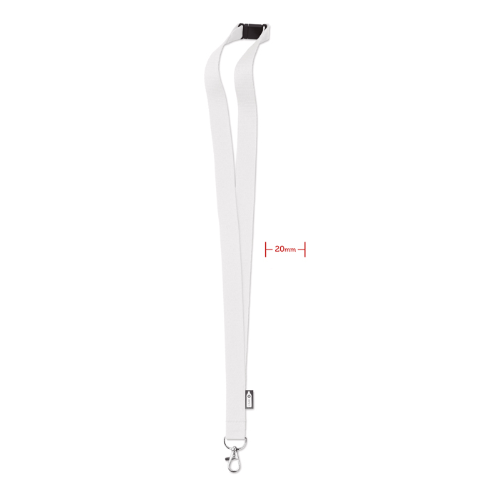 Smycz z RPET z metalowym karabińczykiem i złączka bezpieczeństwa. Szerokość 20 mm. Znakowanie sublimacją jest możliwe tylko na białych produktach.