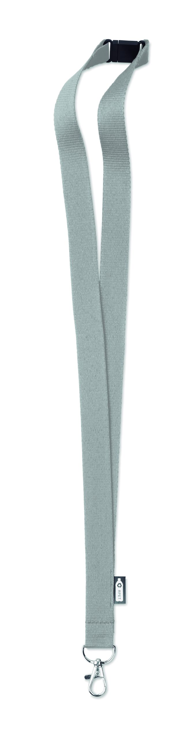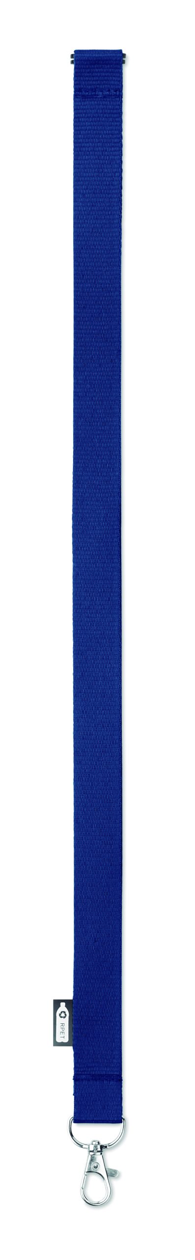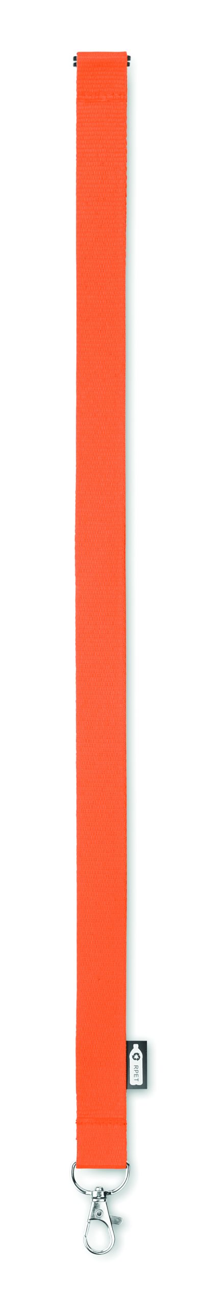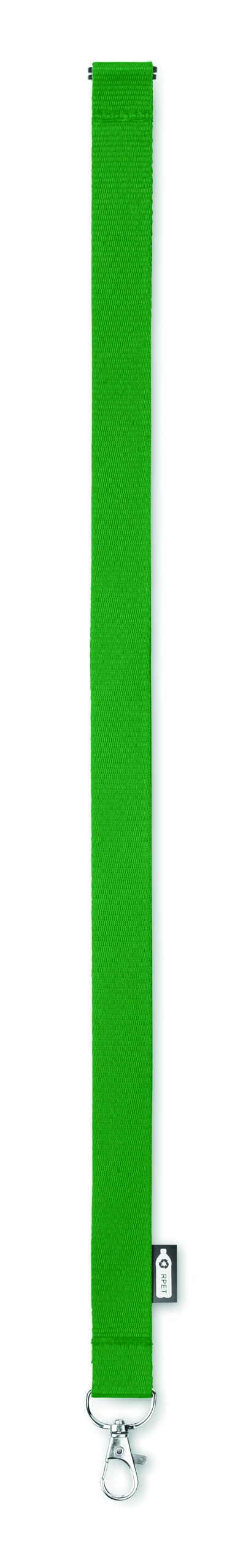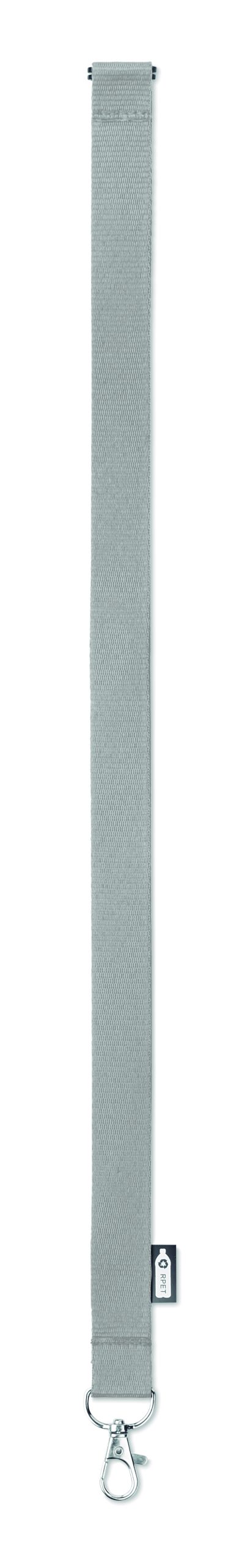 Smycz z RPET z metalowym karabińczykiem i złączka bezpieczeństwa. Szerokość 20 mm. Znakowanie sublimacją jest możliwe tylko na białych produktach.