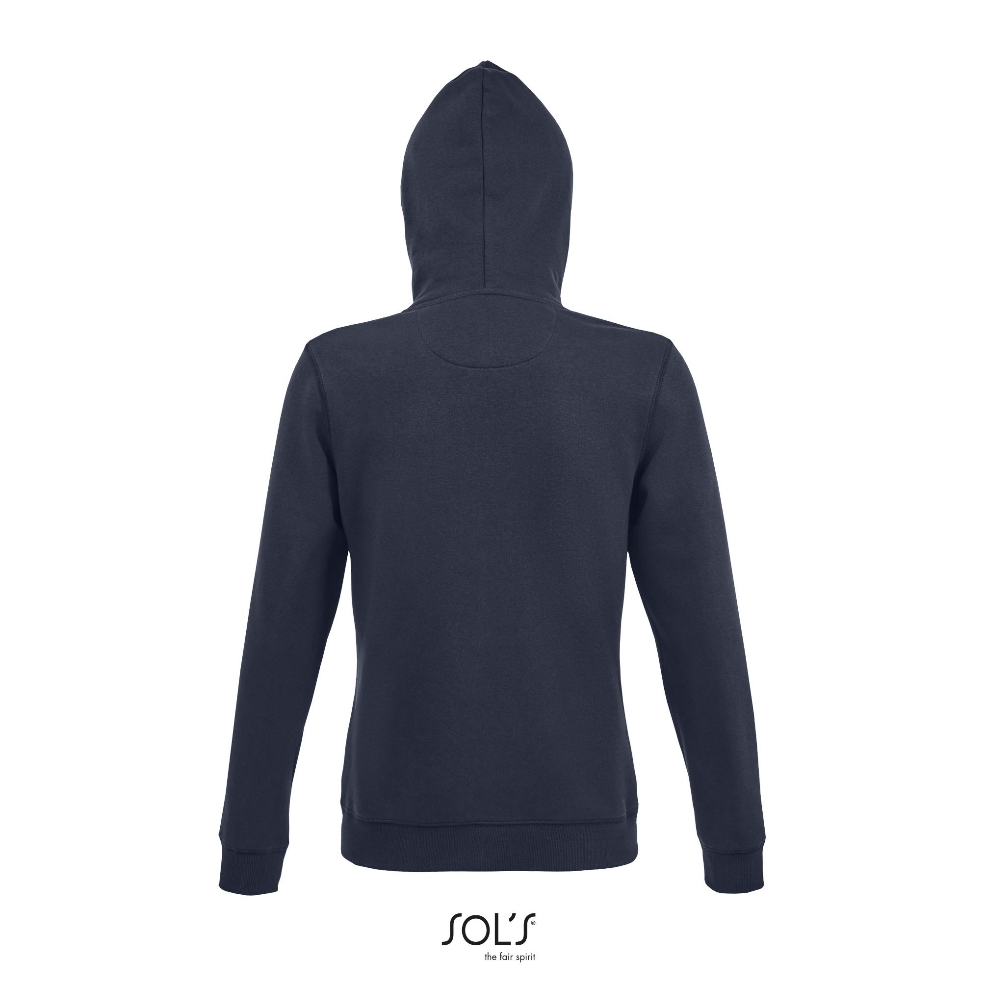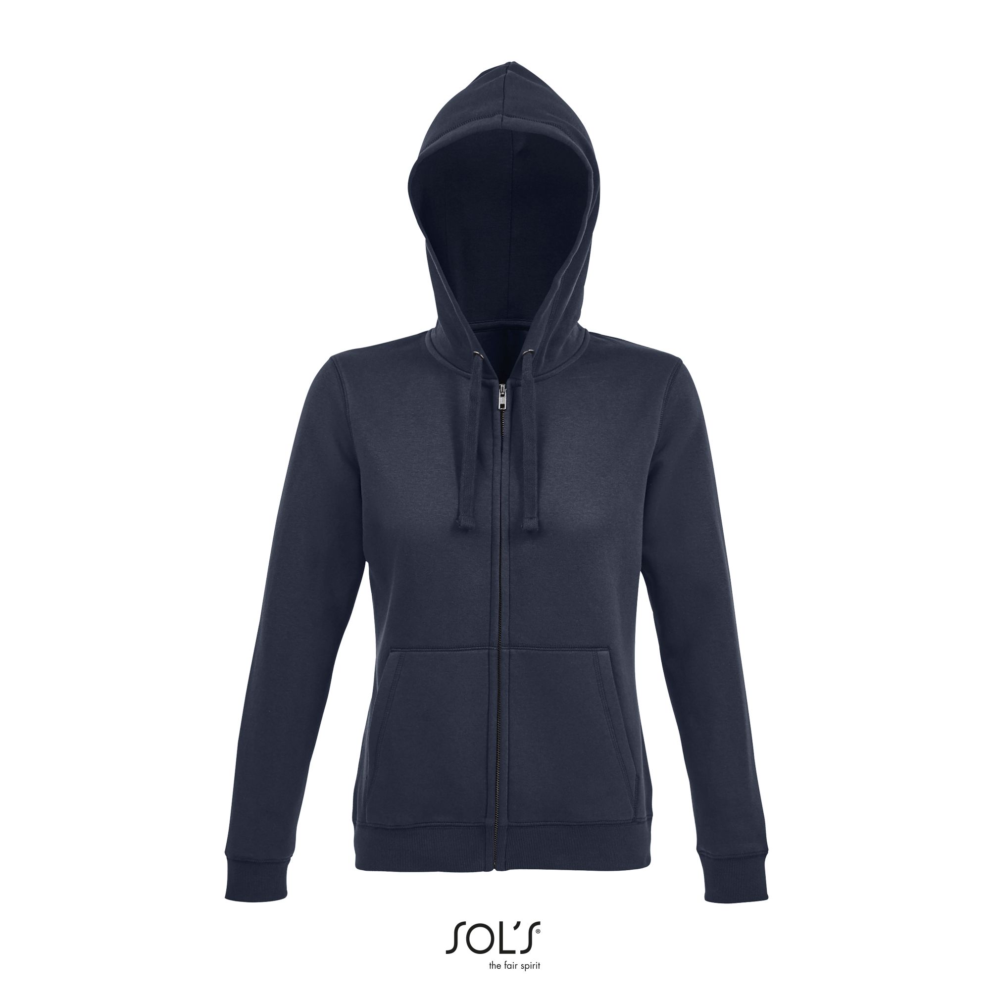 SOL’S SPIKE WOMEN. Damska bluza z kapturem na zamek błyskawiczny, 80% bawełna ring spun. Szczotkowana bawełna wewnątrz, na zewnątrz: 100% bawełna FLEECE 280 LSF (Low Shrinkage Fabric), dopasowane rękawy, 2 przednie kieszenie, podszyty kaptur ze sznurkiem ściągającym w kolorze, 2×2 prążkowane mankiety i obszycie. Wewnętrzny kołnierz półksiężycowy, zamek błyskawiczny YKK. OEKO-TEX®. Sprzedawana tylko z nadrukiem.
