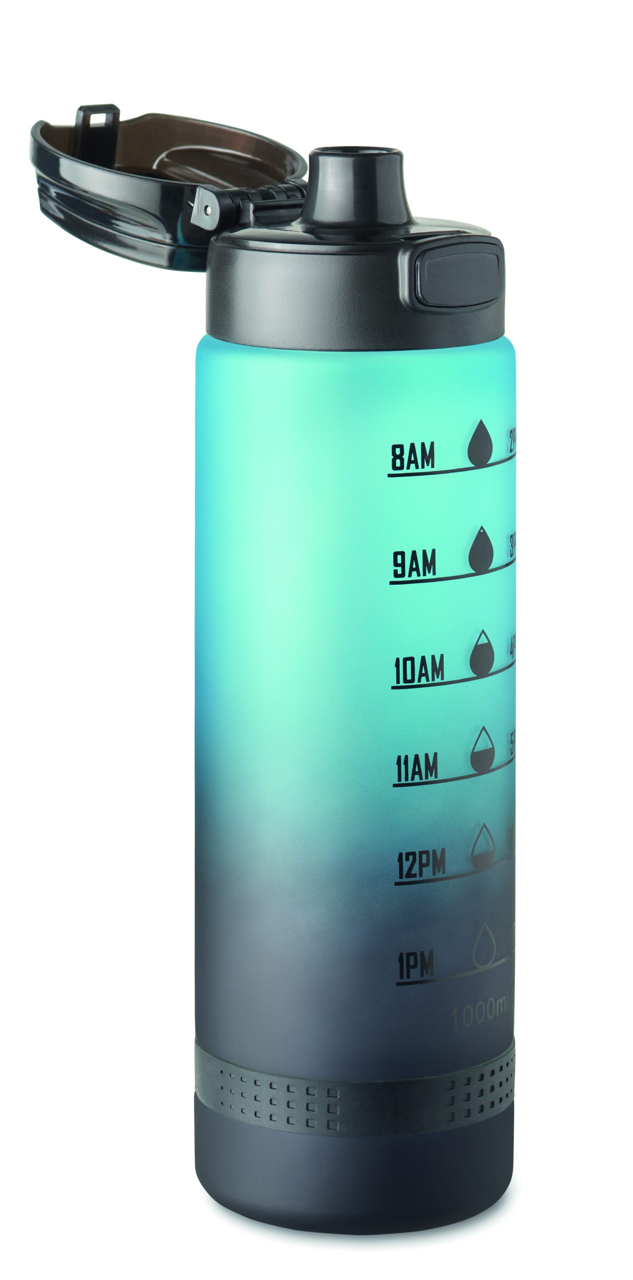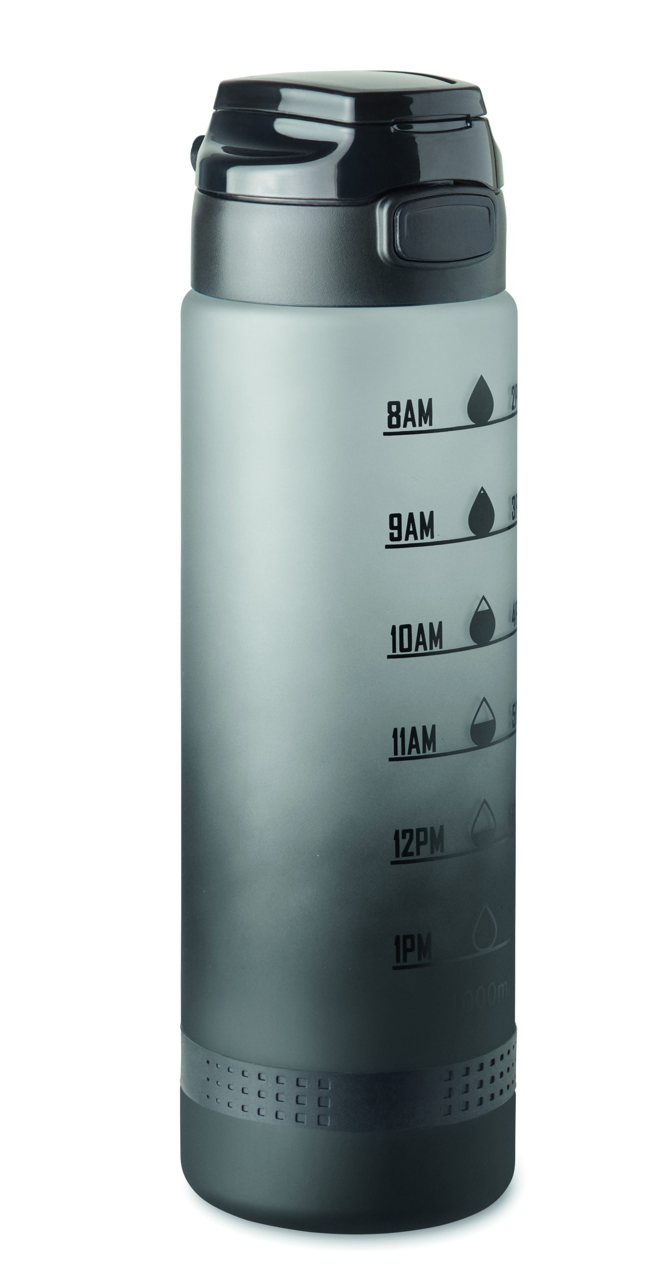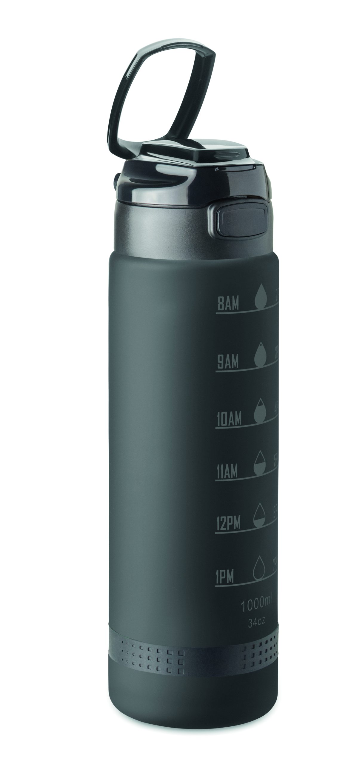 Sportowa butelka na wodę z RPET, motywacyjne oznaczenie czasu, otwierana jedną ręką klapka, blokada bezpieczeństwa i uchwyt do przenoszenia. Pojemność: 1 l. Szczelna.