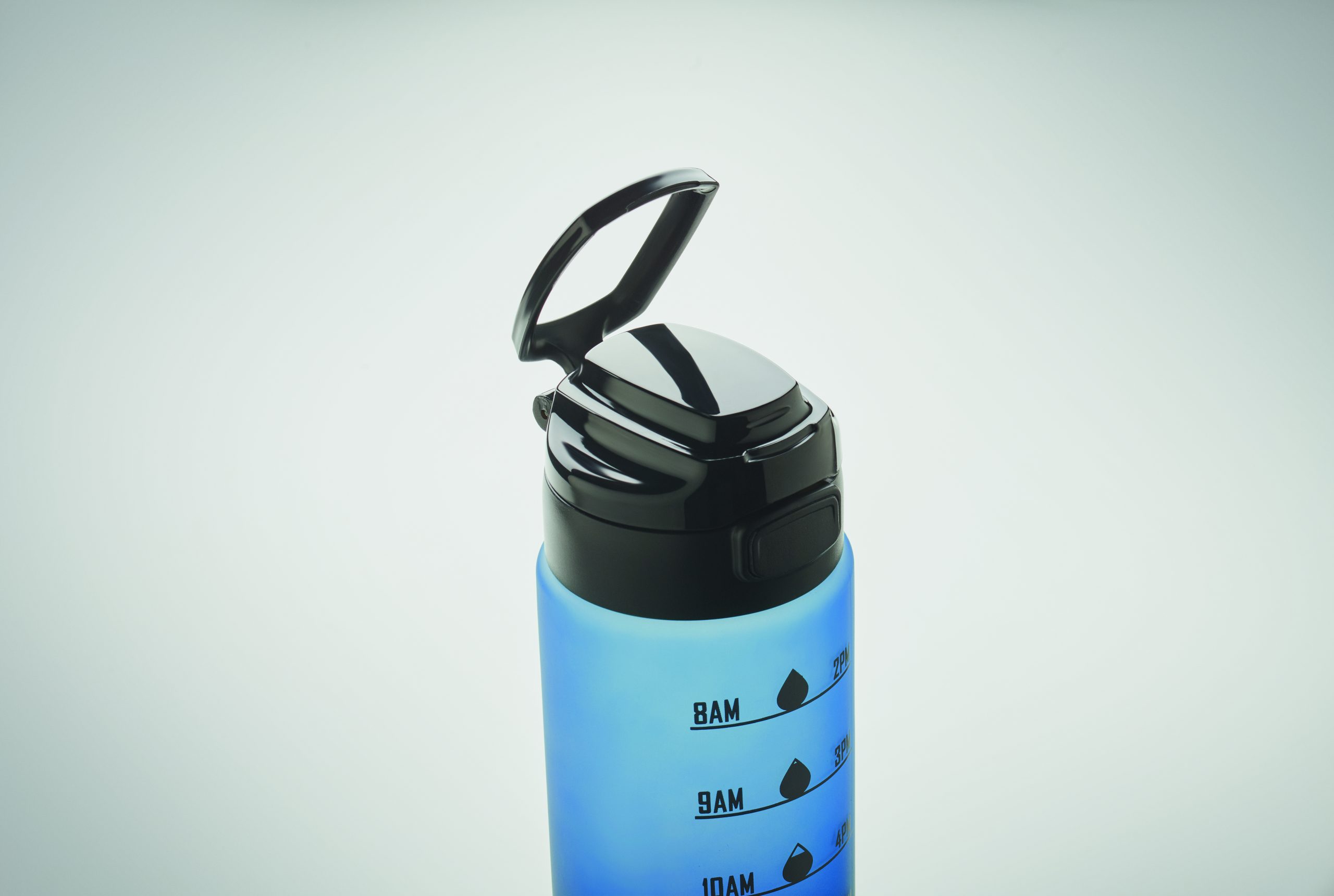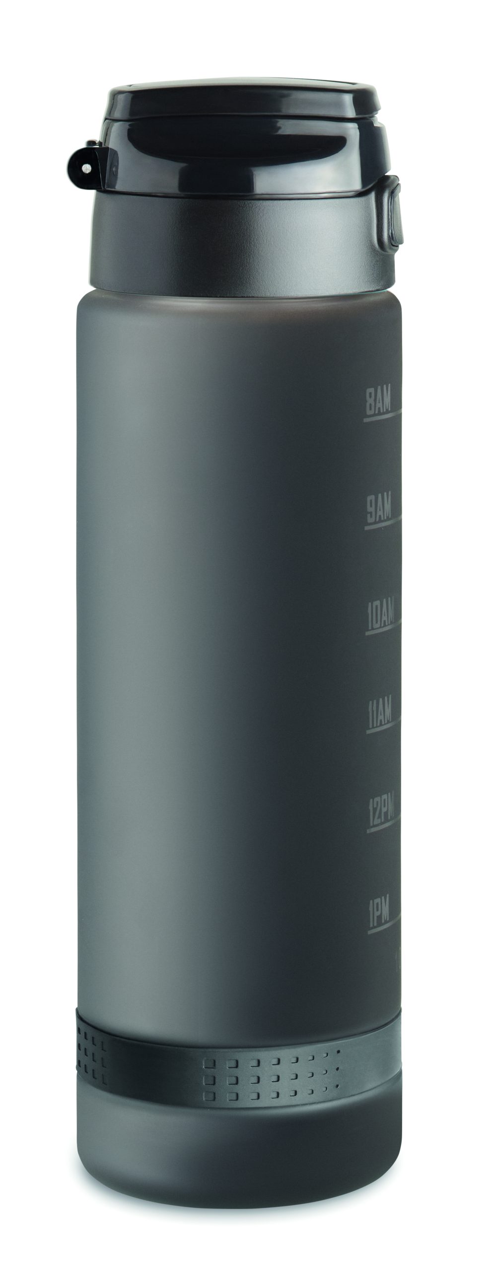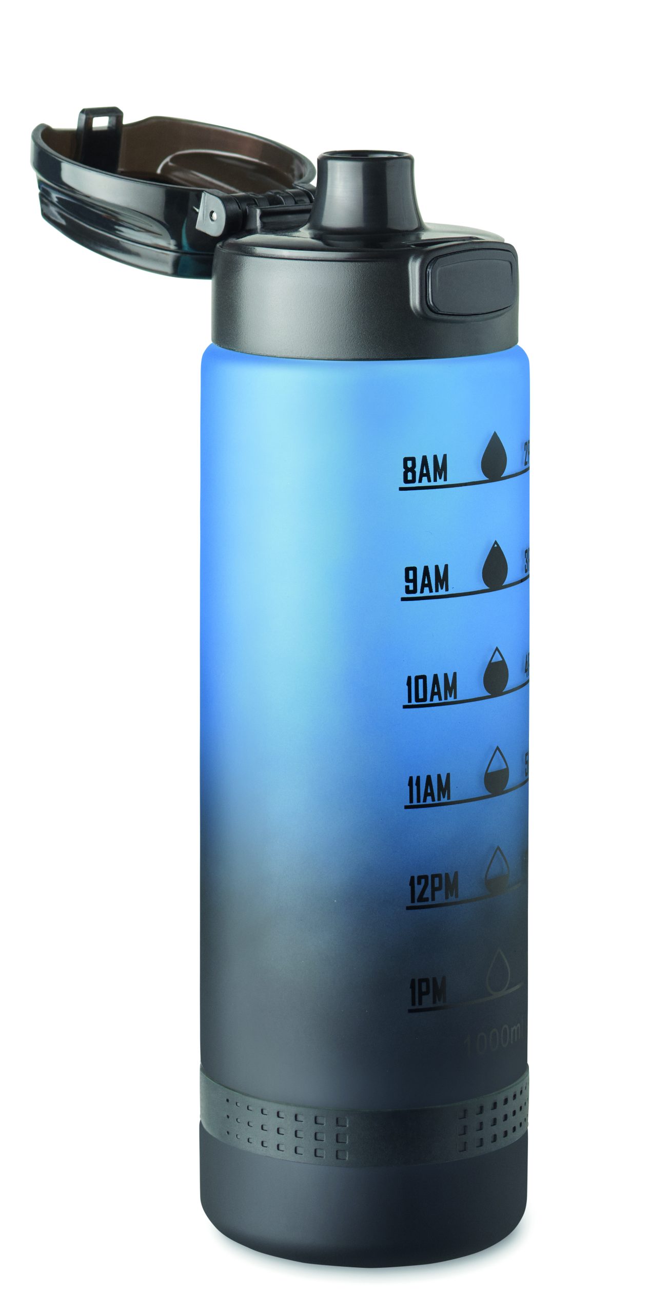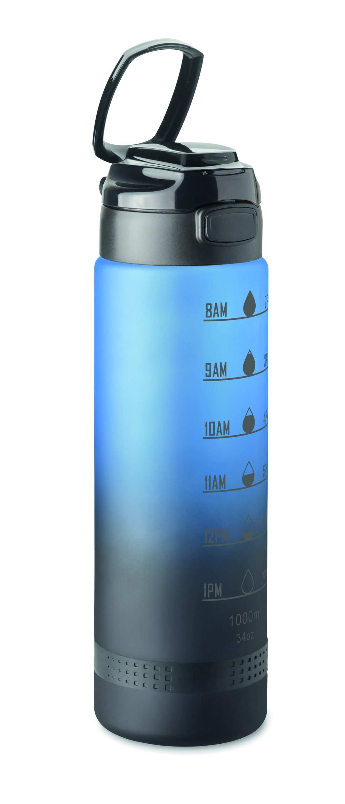 Sportowa butelka na wodę z RPET, motywacyjne oznaczenie czasu, otwierana jedną ręką klapka, blokada bezpieczeństwa i uchwyt do przenoszenia. Pojemność: 1 l. Szczelna.