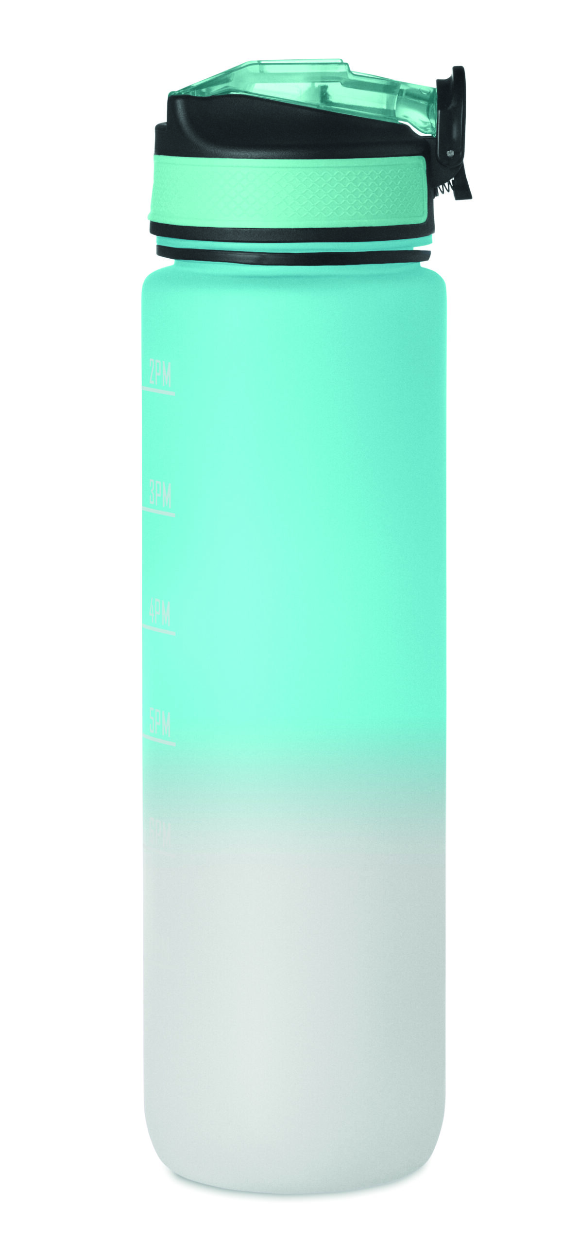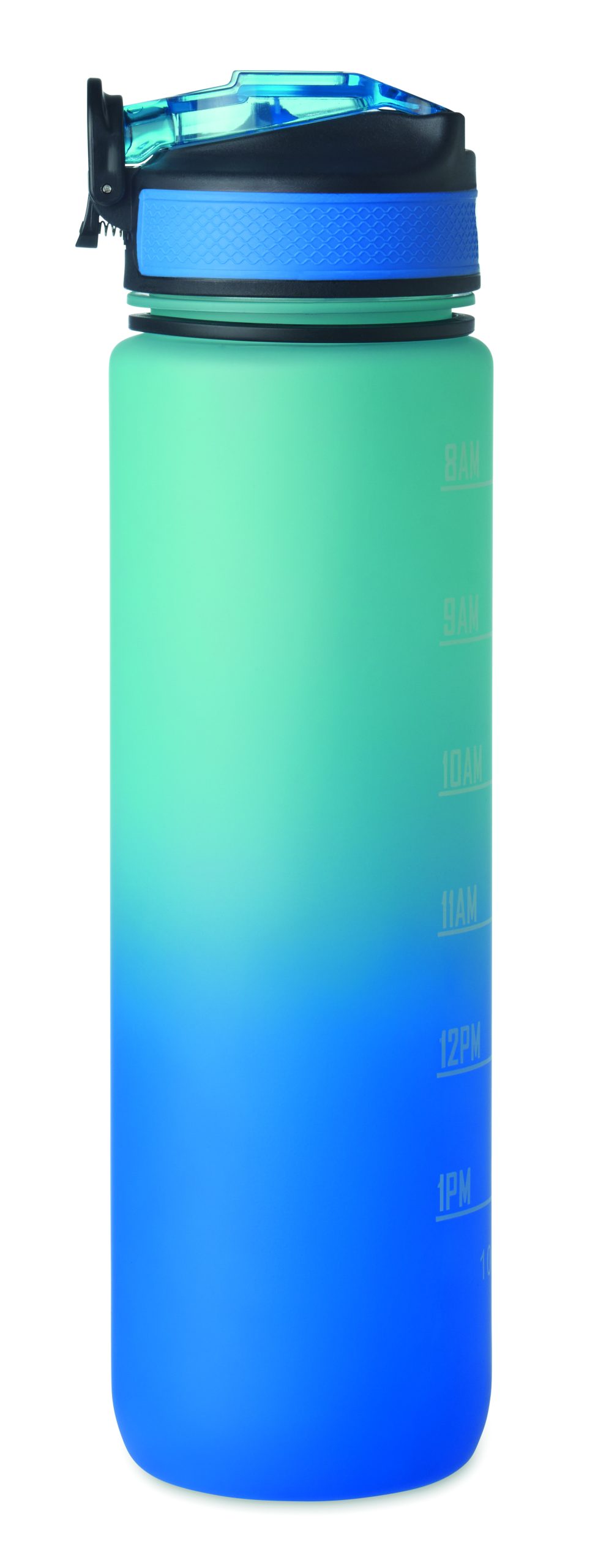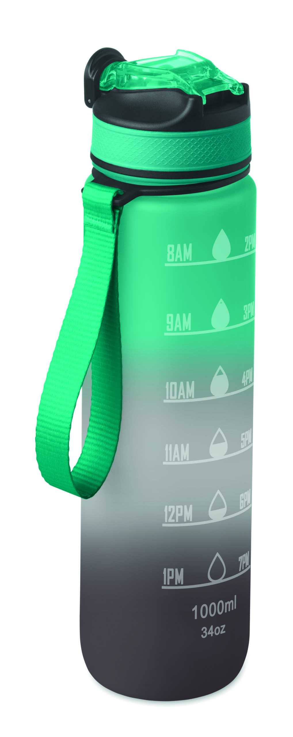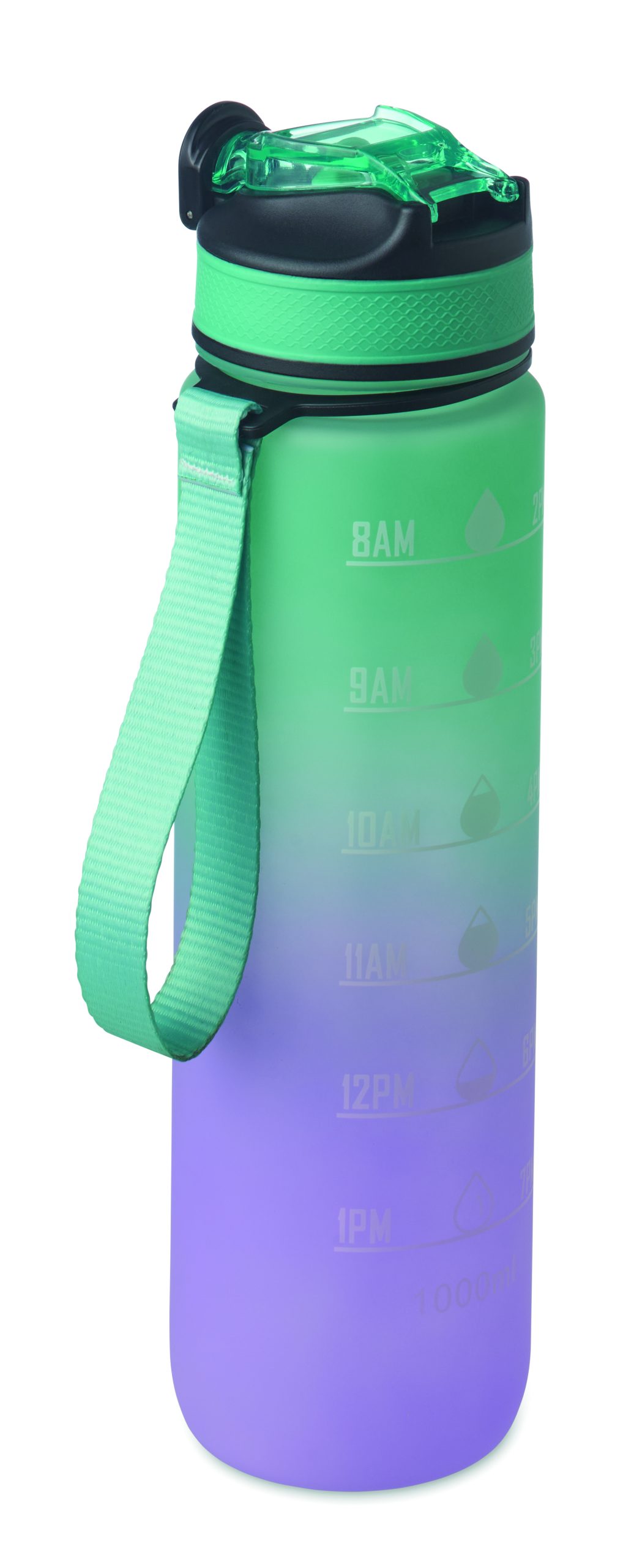 Sportowa butelka na wodę z RPET ze zintegrowaną słomką, miękkim silikonowym ustnikiem, motywacyjnym oznaczeniem czasu, otwieraną jedną ręką klapką, blokadą bezpieczeństwa i paskiem do przenoszenia. Pojemność 1 l. Szczelna.